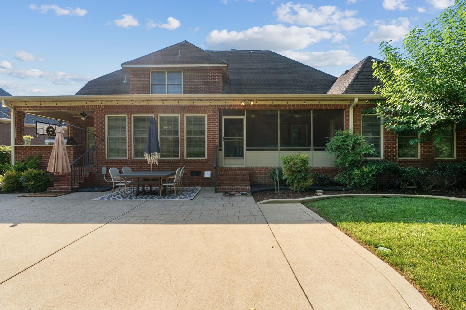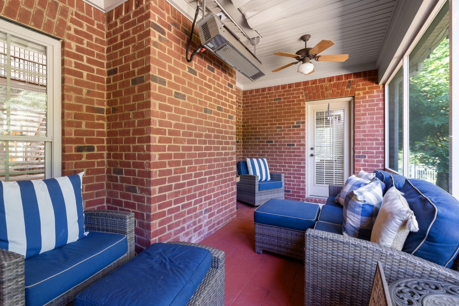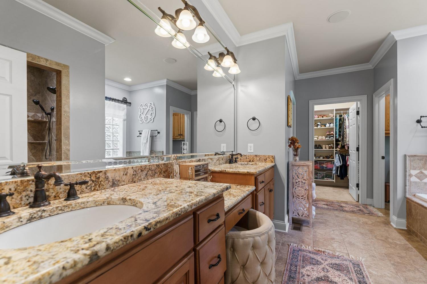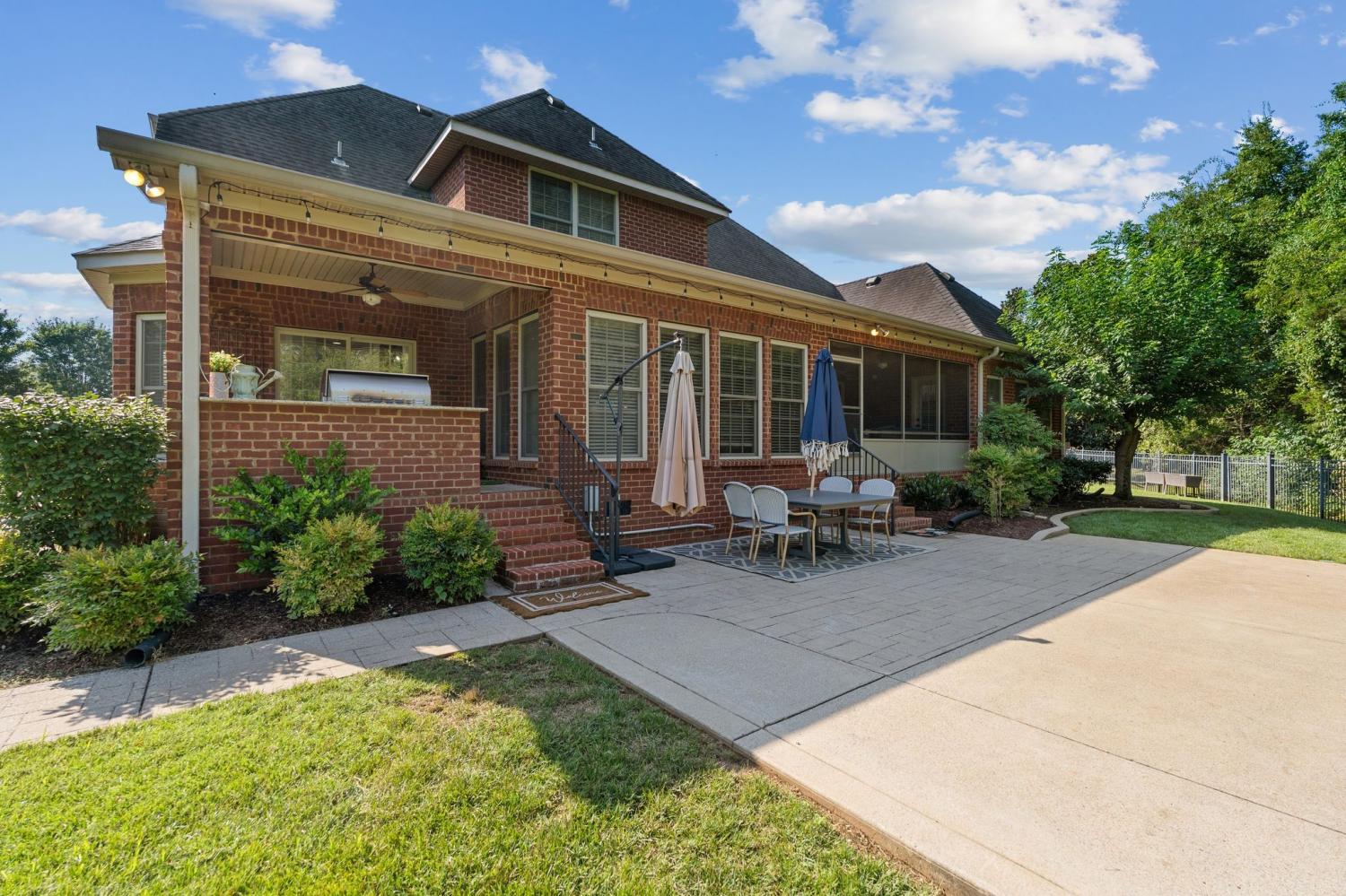 This beautifully updated 4-bedroom, 3.5-bath home in the coveted Reserve subdivision offers the perfect blend of privacy, luxury, and everyday comfort. Nestled at the end of a quiet cul-de-sac and backing to a wooded area, the .41-acre lot provides a peaceful, tree-lined setting ideal for relaxing or entertaining. A classic brick exterior with stone accents and a charming covered front porch welcomes you home. Inside, you're greeted with extensive millwork, stacked crown molding, gleaming hardwood floors, fresh paint, and new designer light fixtures. A dramatic wrought iron staircase makes a bold statement in the grand foyer. The heart of the home is a chef’s dream kitchen, featuring professional-grade stainless appliances—including a vented hood, pot filler, large island, raised bar top, and custom cabinetry with granite countertops. The kitchen opens to a warm and inviting living room anchored by a gas fireplace, perfect for cozy evenings. The main-level primary suite is filled with natural light and boasts a tray ceiling, custom built-in closet system, a luxurious bath with soaking tub, dual-head shower, and private access to a screened patio with ceiling heater for year-round comfort. French doors lead to a dedicated office on the main floor, perfect for working from home. Upstairs offers three additional bedrooms, two full baths, a spacious bonus room with wet bar, and a freshly painted media room ideal for movie nights or creative space. The laundry room is thoughtfully designed with granite folding counter tops, upper and lower cabinetry, and a deep utility sink. Step outside to enjoy the covered outdoor kitchen with built-in gas grill, griddle, sink, fridge, and granite counters—leading down to a sun-soaked patio and fully fenced backyard. Additional features include a 3-car garage, walk-out attic storage, new gas tankless water heater, newer HVACs, and optional community pool access. 48 Hour kick out clause in place