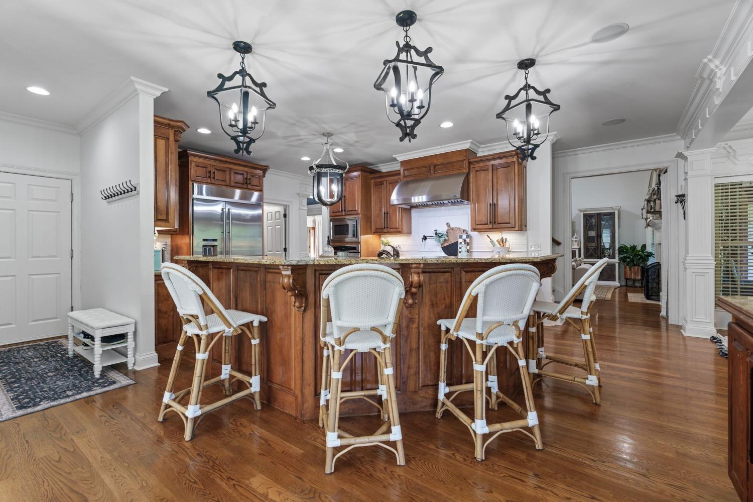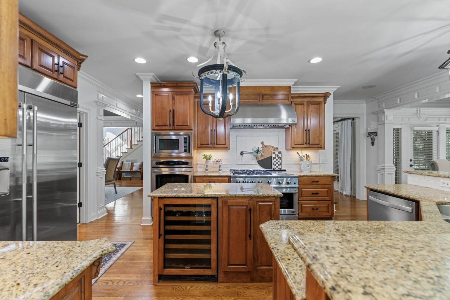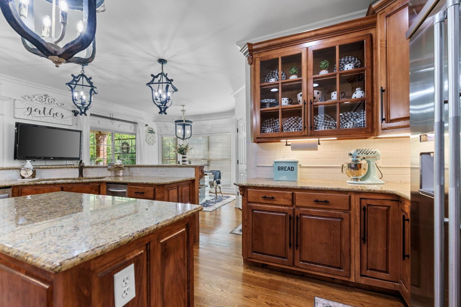 This beautifully updated 4-bedroom, 3.5-bath home in the coveted Reserve subdivision offers the perfect blend of privacy, luxury, and everyday comfort. Nestled at the end of a quiet cul-de-sac and backing to a wooded area, the .41-acre lot provides a peaceful, tree-lined setting ideal for relaxing or entertaining. A classic brick exterior with stone accents and a charming covered front porch welcomes you home. Inside, you're greeted with extensive millwork, stacked crown molding, gleaming hardwood floors, fresh paint, and new designer light fixtures. A dramatic wrought iron staircase makes a bold statement in the grand foyer. The heart of the home is a chef’s dream kitchen, featuring professional-grade stainless appliances—including a vented hood, pot filler, large island, raised bar top, and custom cabinetry with granite countertops. The kitchen opens to a warm and inviting living room anchored by a gas fireplace, perfect for cozy evenings. The main-level primary suite is filled with natural light and boasts a tray ceiling, custom built-in closet system, a luxurious bath with soaking tub, dual-head shower, and private access to a screened patio with ceiling heater for year-round comfort. French doors lead to a dedicated office on the main floor, perfect for working from home. Upstairs offers three additional bedrooms, two full baths, a spacious bonus room with wet bar, and a freshly painted media room ideal for movie nights or creative space. The laundry room is thoughtfully designed with granite folding counter tops, upper and lower cabinetry, and a deep utility sink. Step outside to enjoy the covered outdoor kitchen with built-in gas grill, griddle, sink, fridge, and granite counters—leading down to a sun-soaked patio and fully fenced backyard. Additional features include a 3-car garage, walk-out attic storage, new gas tankless water heater, newer HVACs, and optional community pool access. 48 Hour kick out clause in place
