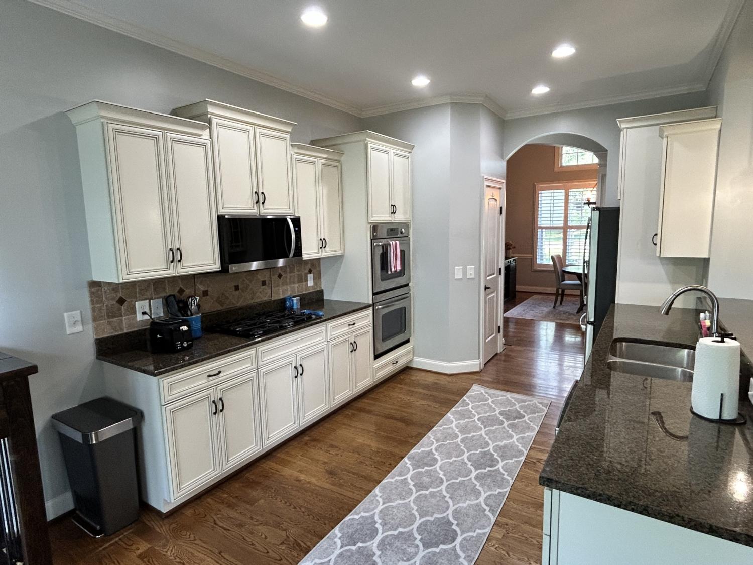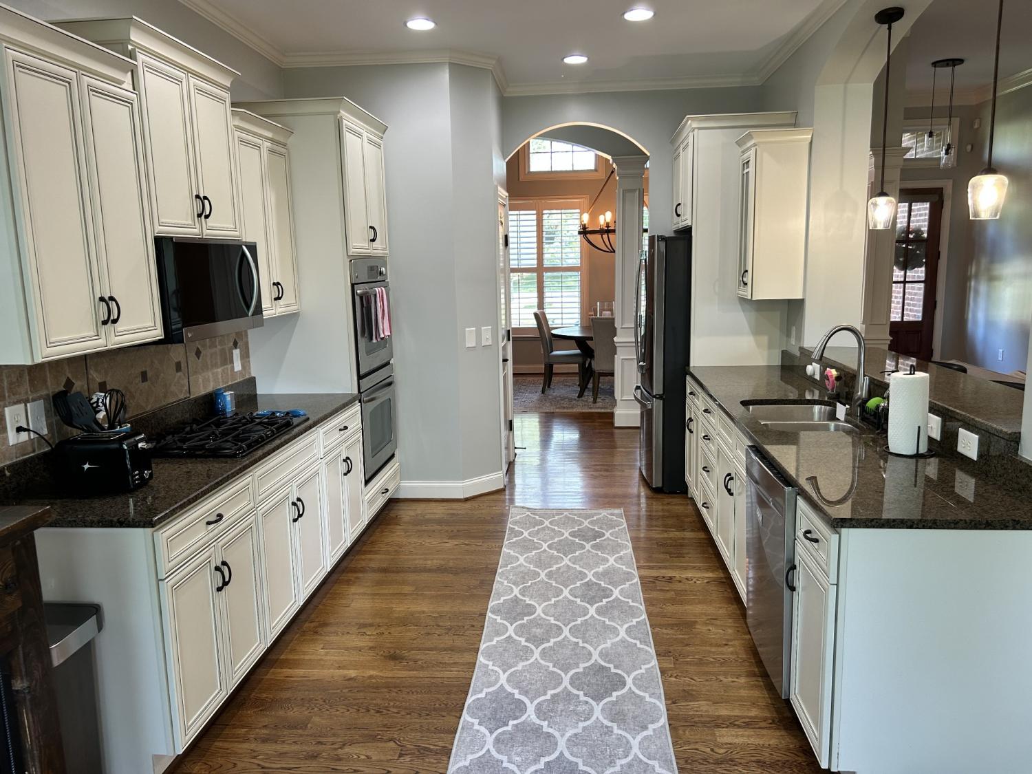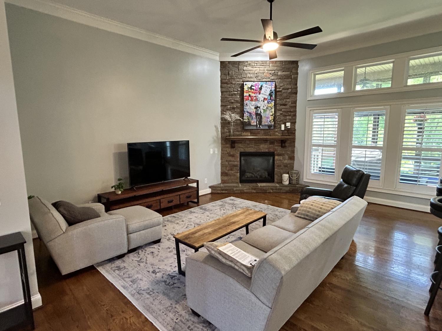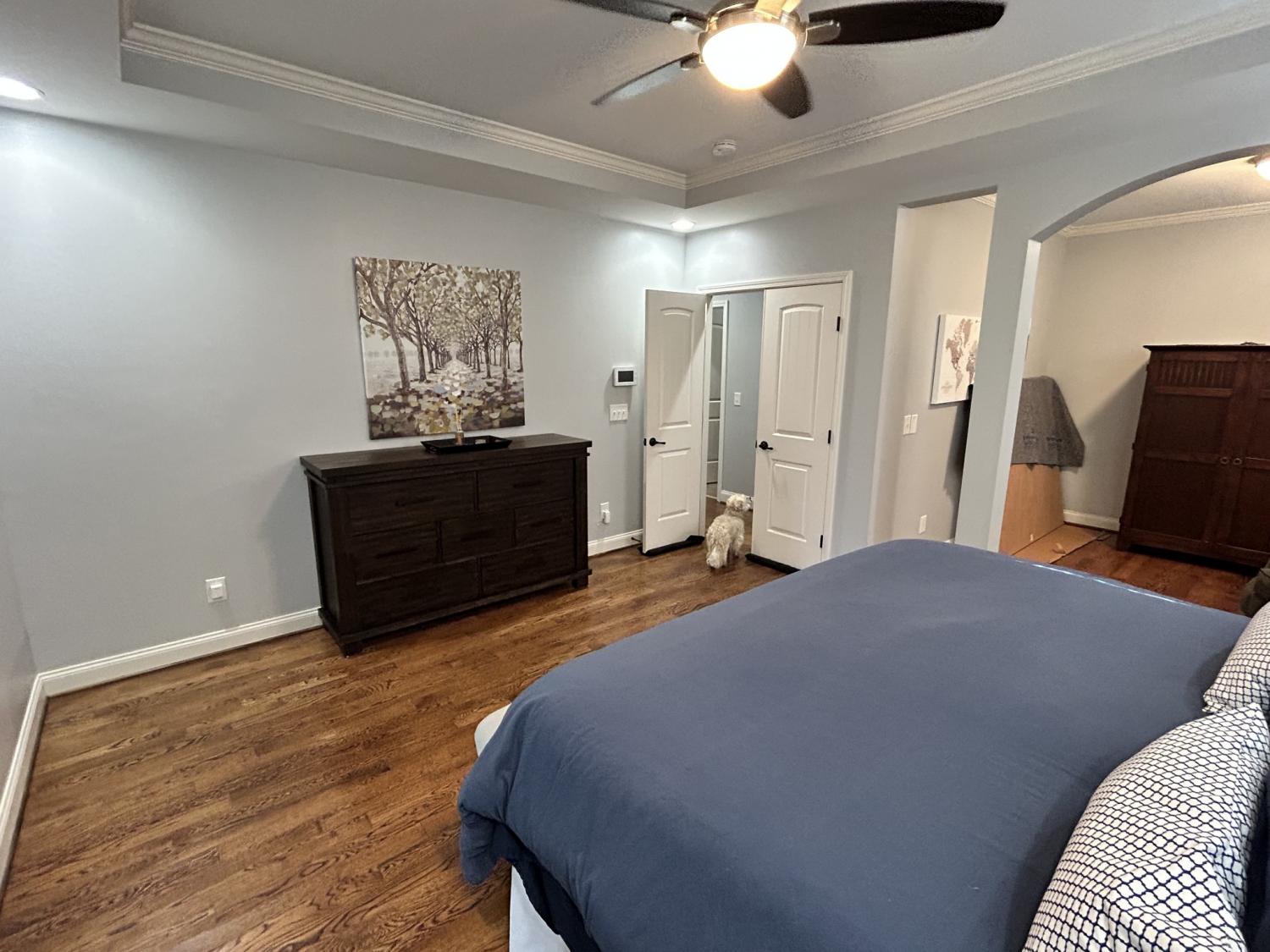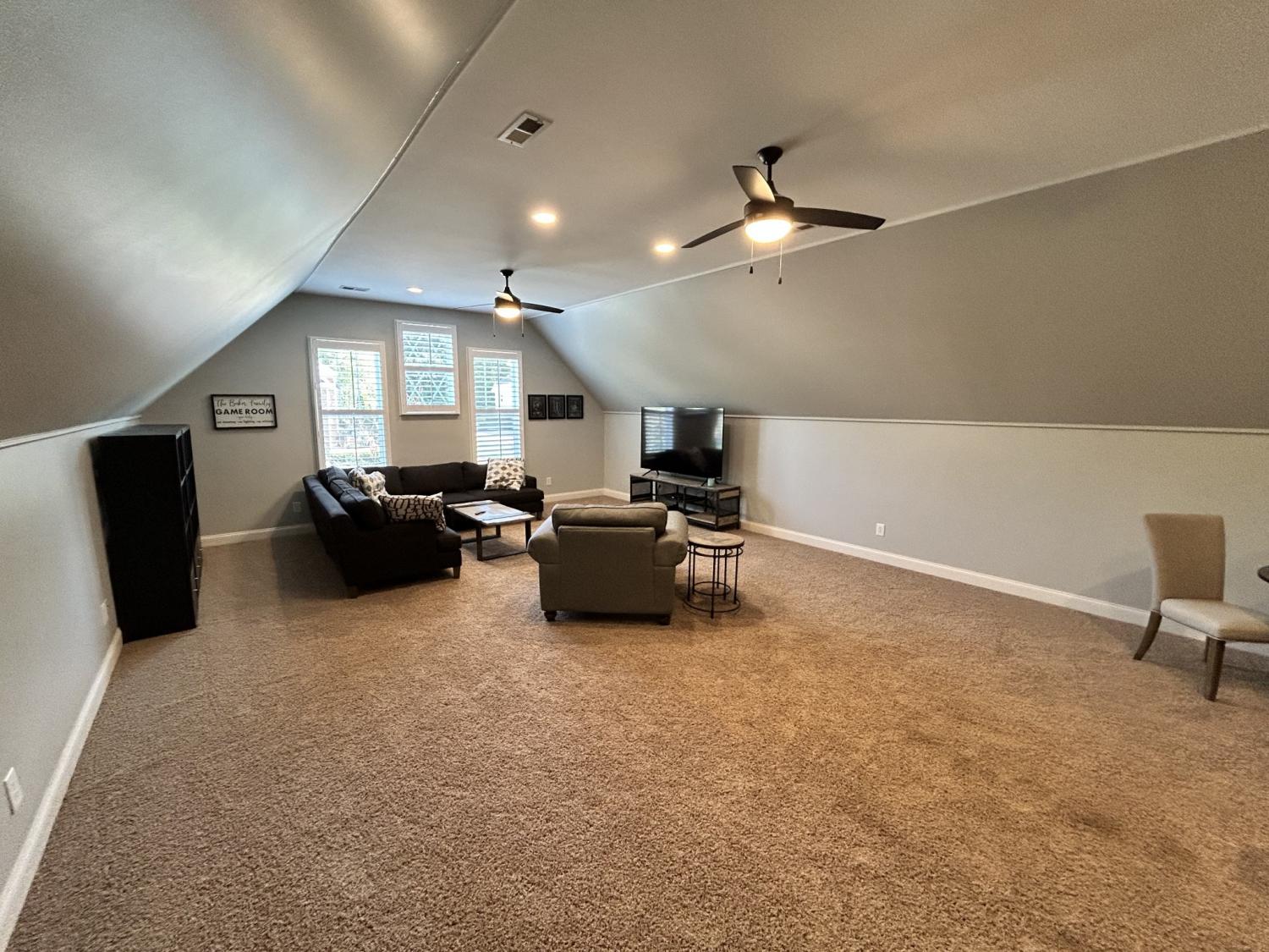 Lovely well maintained home with hardwood floors throughout the main level including the master suite. Master suite features sitting area, double walk in closets, double vanities and separate shower and jetted bath. High ceilings throughout home, large rec area above the garage with private guest bed and bath, granite and stainless kitchen with gas range and double ovens. Screened in back patio overlooking green area, fenced in back yard.