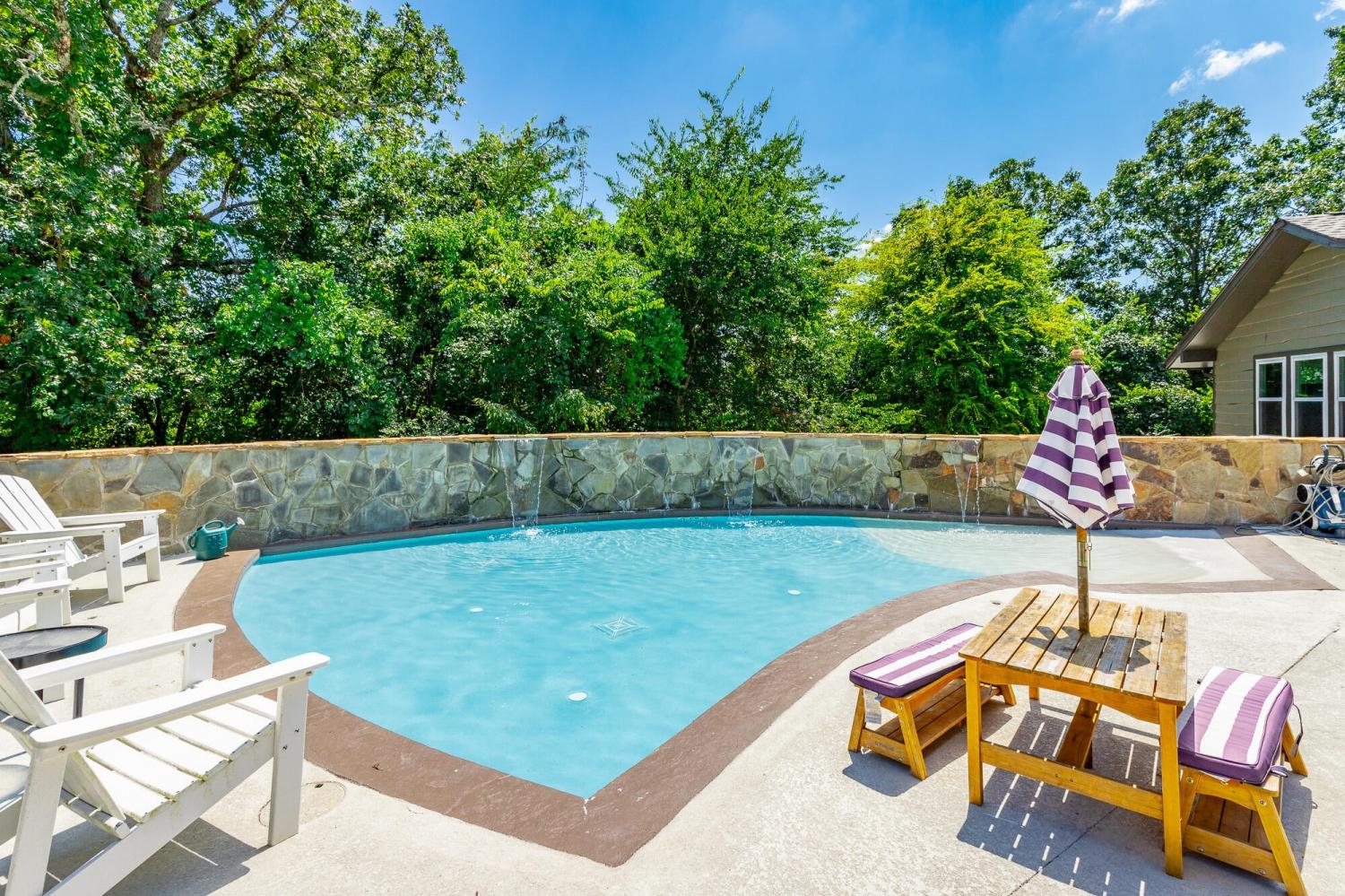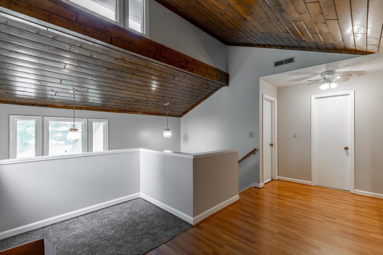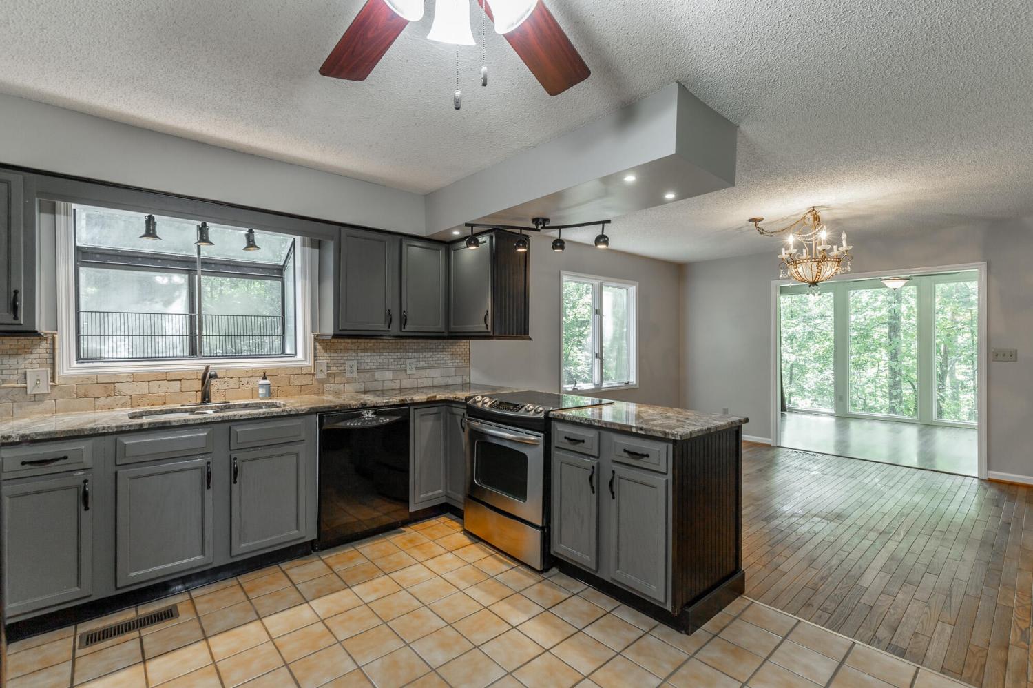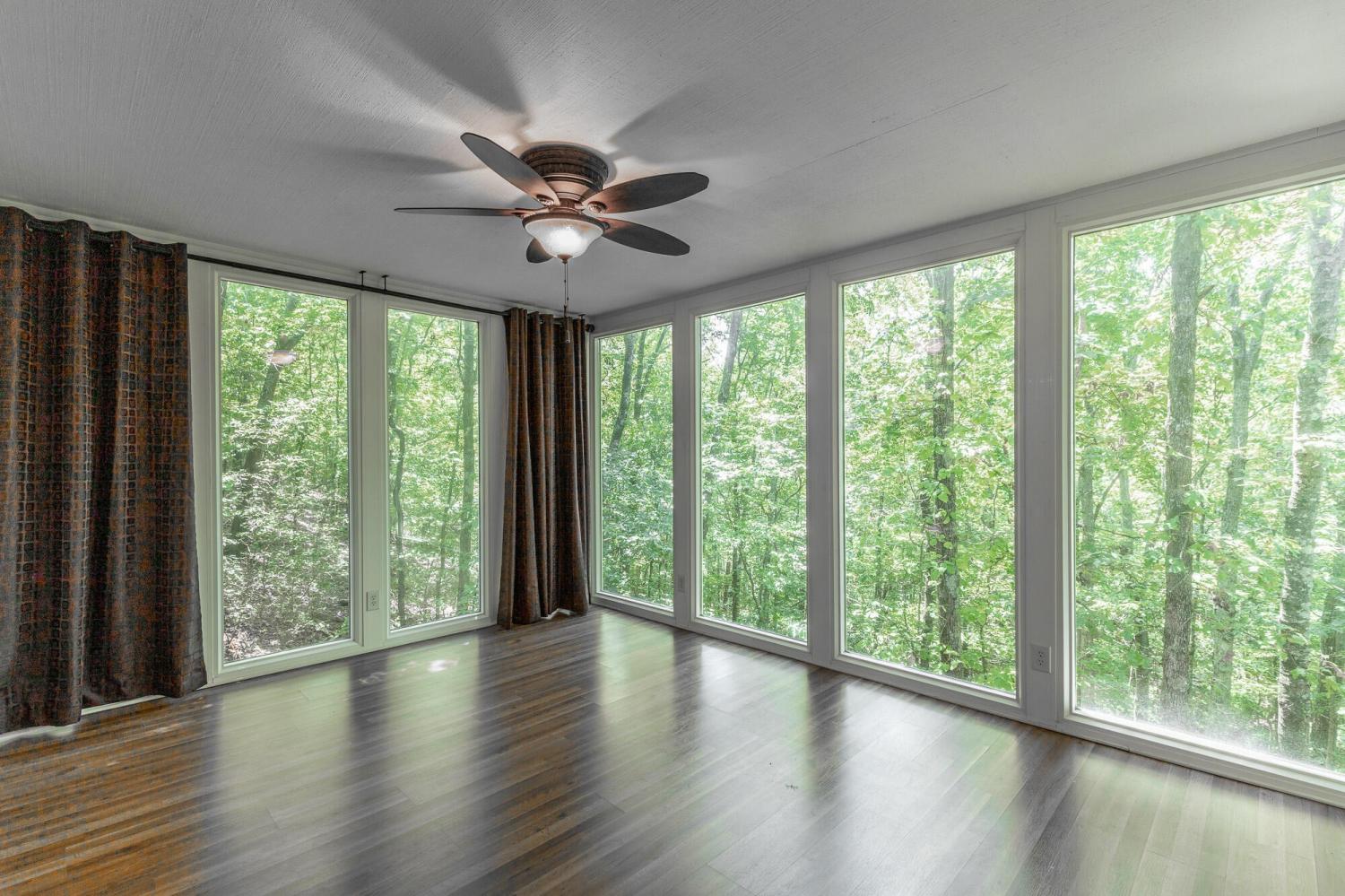 **EXCLUSIVE FINANCING INCENTIVE AVAILABLE when Buyers use Seller's preferred lender. Details available upon request** Welcome to 9208 Magic Mountain, a thoughtfully designed contemporary home nestled in the heart of the prestigious Mountain Shadows neighborhood—one of East Brainerd's most sought-after communities, celebrated for its spacious lots, family-friendly amenities, and vibrant lifestyle. Here, neighbors gather at the tennis courts, the community pool, or the clubhouse, all just moments from your front door. Set on a private, wooded lot, this distinctive modern home blends classic design with today's most desired comforts. Freshly painted and full of character, the residence welcomes you with a large front porch and timeless stone and wood siding. Step inside to discover solid hardwood floors and a thoughtfully placed coat closet in the entryway, setting a warm and functional tone. To your right, the primary suite is a serene retreat, offering laminate flooring, custom walk-in closets with built-in shelving, and a beautifully updated bath featuring tile floors, a walk-in shower, and soaking tub. The white shiplap ceiling, his-and-hers vanities, and private access to the sunroom and balcony create a spa-like atmosphere with a private view of the secluded backyard. The heart of the home boasts vaulted wood-paneled ceilings, an open-concept living and dining space, and a kitchen designed for both beauty and function. You'll find gray cabinetry, granite countertops, a coffee bar, and tile flooring, plus a light-filled bonus room with floor-to-ceiling windows—perfect for morning coffee or an afternoon read. Ideal for busy households, the spacious laundry room sits between the kitchen and attached garage, and a convenient half bath serves the main level. Upstairs, you'll find additional bedrooms, a versatile bonus space ideal for a playroom, office, or dream closet, and a beautifully appointed second bath with a double vanity and separate shower and toilet area.
