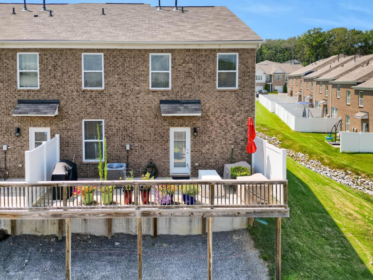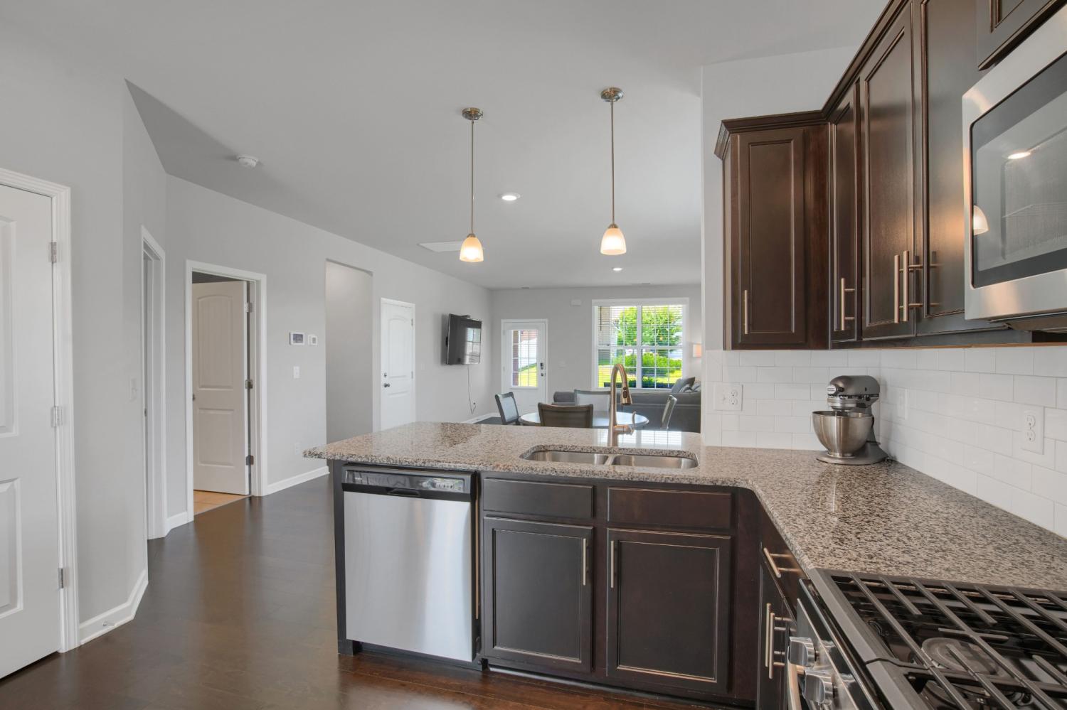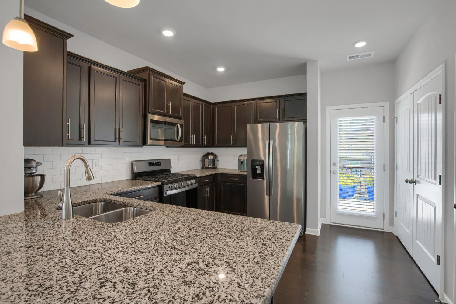 NEW Price! Beautifully maintained end-unit townhome built in 2020 still looks NEW! This spacious 4-bedroom, 3 full bath home offers modern living with smart home features including a programmable thermostat, smart lights, and smart locks. The main floor showcases engineered hardwood floors, a chef’s kitchen with granite countertops, tile backsplash, 5-burner gas stove, and refrigerator and bar stools that remain. The Master suite located upstairs has large enough that it has space for home office, flex area or currently being utilized as in-home theater room! Laundry conveniently located upstairs, pull down attic has extra storage. 4th BR on 1st floor ....makes perfect Mother-in-law suite, or spare room for overnight visitors. Enjoy the outdoors on the oversized 27'x8' private deck with privacy fence—perfect for entertaining. Additional highlights include Energy Star appliances and a convenient 1-car garage. HOA covers community pool, lawn maintenance, and trash pickup. Move-in ready and perfectly located!