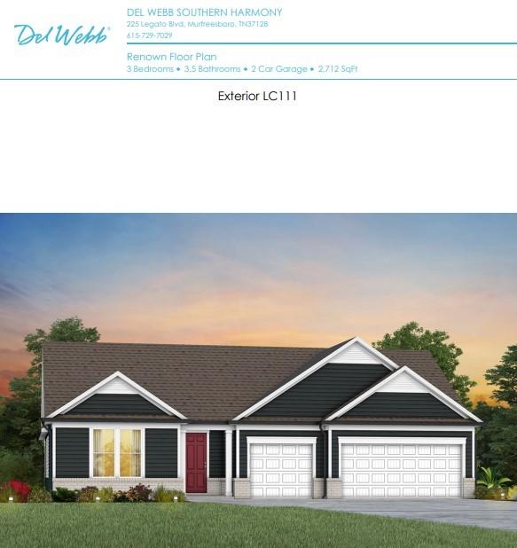 Live the premier 55+ Active Adult lifestyle at Del Webb Southern Harmony! This to‑be‑built Renown floor plan is one of the most sought‑after designs in the series, offering exceptional single‑level living. The Renown features 3 spacious bedrooms—each with its own ensuite bathroom—plus a den and an additional half bath, all thoughtfully arranged on one level for comfort and convenience. The price shown includes the homesite premium and the base price of the Renown floor plan. Buyers will have the opportunity to personalize their home by selecting structural options, exterior design, color scheme, and all interior finishes in partnership with our professional design team. We are currently offering $30,000 in Flex Cash to use toward homesite premium, structural options or design studio selections, plus an additional $10,000 toward closing costs when buyers finance with our affiliate lender or pay cash—an exceptional value for a to‑be‑built home in Southern Harmony. Located within the vibrant Del Webb Southern Harmony community, residents enjoy an unmatched amenity experience, including a resort‑style outdoor pool with cabanas, indoor pool, pickleball and bocce courts, state‑of‑the‑art fitness center, dance studio, fire pit, botanical park, amphitheater, and a full calendar of year‑round clubhouse activities. Join us for the Clubhouse Grand Opening Celebration on Friday, February 20th, from 11 AM–2 PM! Come see the lifestyle that makes Southern Harmony one of Murfreesboro’s premier 55+ communities. Our full‑time Lifestyle Director curates a robust schedule of social events, clubs, and groups—including walking groups, wine & whiskey club, Veterans club, crafting groups, and men’s and women’s golf—ensuring there’s always something fun and engaging to enjoy. Discover the comfort of thoughtful design and the joy of an active, connected community at Del Webb Southern Harmony.