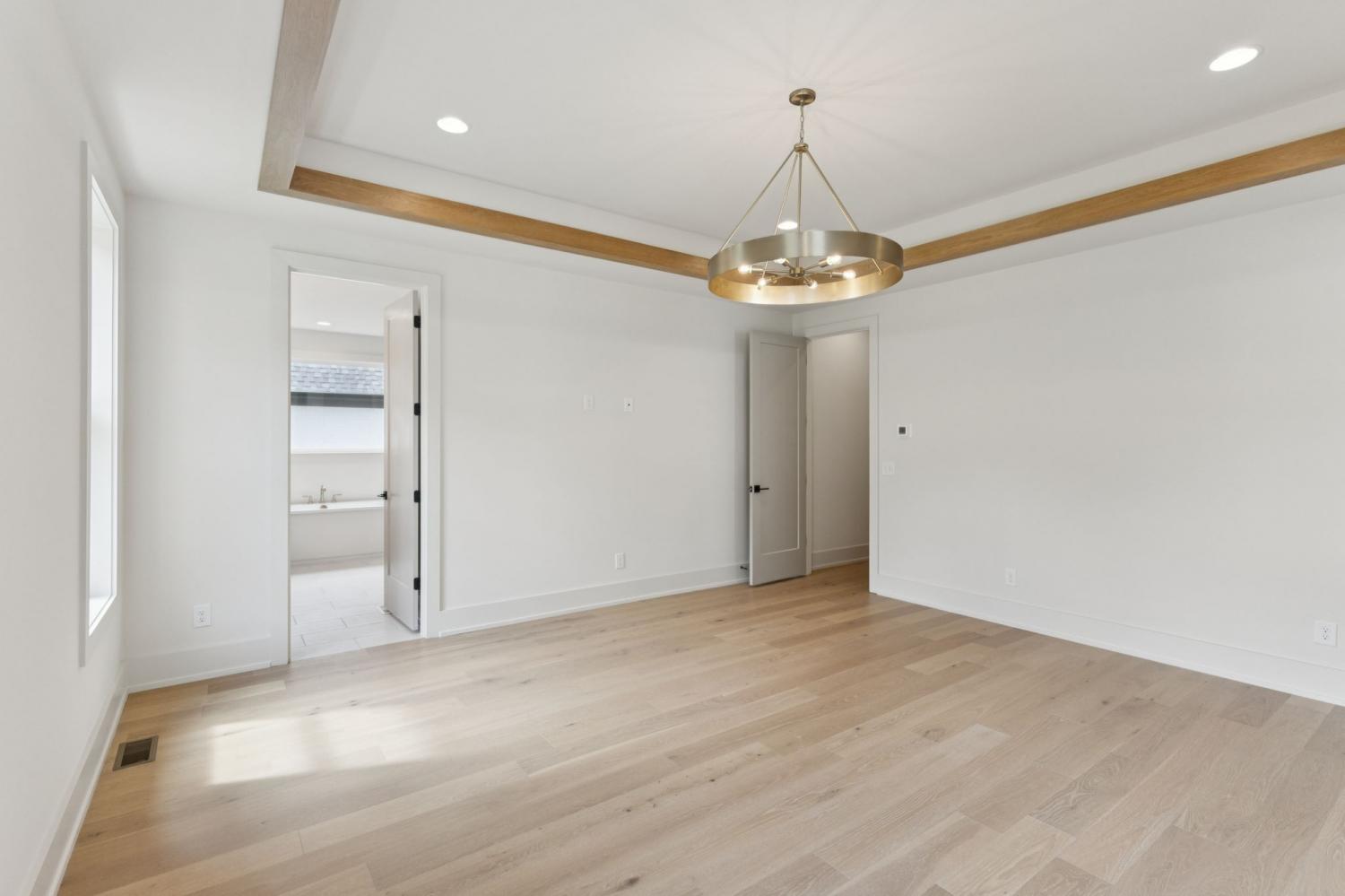 Welcome to this breathtaking masterpiece built by Hidden Valley Homes, with exceptional craftsmanship, thoughtful design, and luxurious finishes throughout. From the moment you arrive, the brick exterior, sleek metal roof accents, and carefully selected trim details set the tone for the quality found inside. Step through the front door into a light-filled two-story foyer, where hardwood flooring flows throughout the main level, guiding you into a stunning open-concept living space that seamlessly connects the dining area, living room, and chef’s kitchen. The living room is a showstopper with its coffered ceiling, gas fireplace with a brick surround, and a natural wood mantle—a perfect blend of warmth and sophistication. The kitchen is equally impressive, offering ceiling-height cabinetry, a spacious center island, built-in double ovens, gas cooktop, under-cabinet microwave, and a pantry with open shelving. Tucked just off the foyer is a private office or creative room with French doors—ideal for working from home or inspiring productivity. A drop zone conveniently located off the spacious 2-car garage adds everyday functionality. The main-level primary retreat offers elevated design with a tray ceiling, custom accent wall, and a spa-like en suite featuring double vanities, a freestanding soaking tub, a floor-to-ceiling tiled shower, and a huge walk-in closet that connects directly to the laundry room for added convenience. Upstairs, a large bonus room with wainscoting sets the stage for casual living or entertaining, complete with a sleek, modern wet bar. 4 additional bedrooms, each with accent walls, walk-in closets, and 3 full bathrooms, complete the second floor. Step outside to a covered back porch that opens to a spacious, level backyard—perfect for outdoor entertaining or quiet evenings at home. Additional landscaping is currently being added to the backyard.