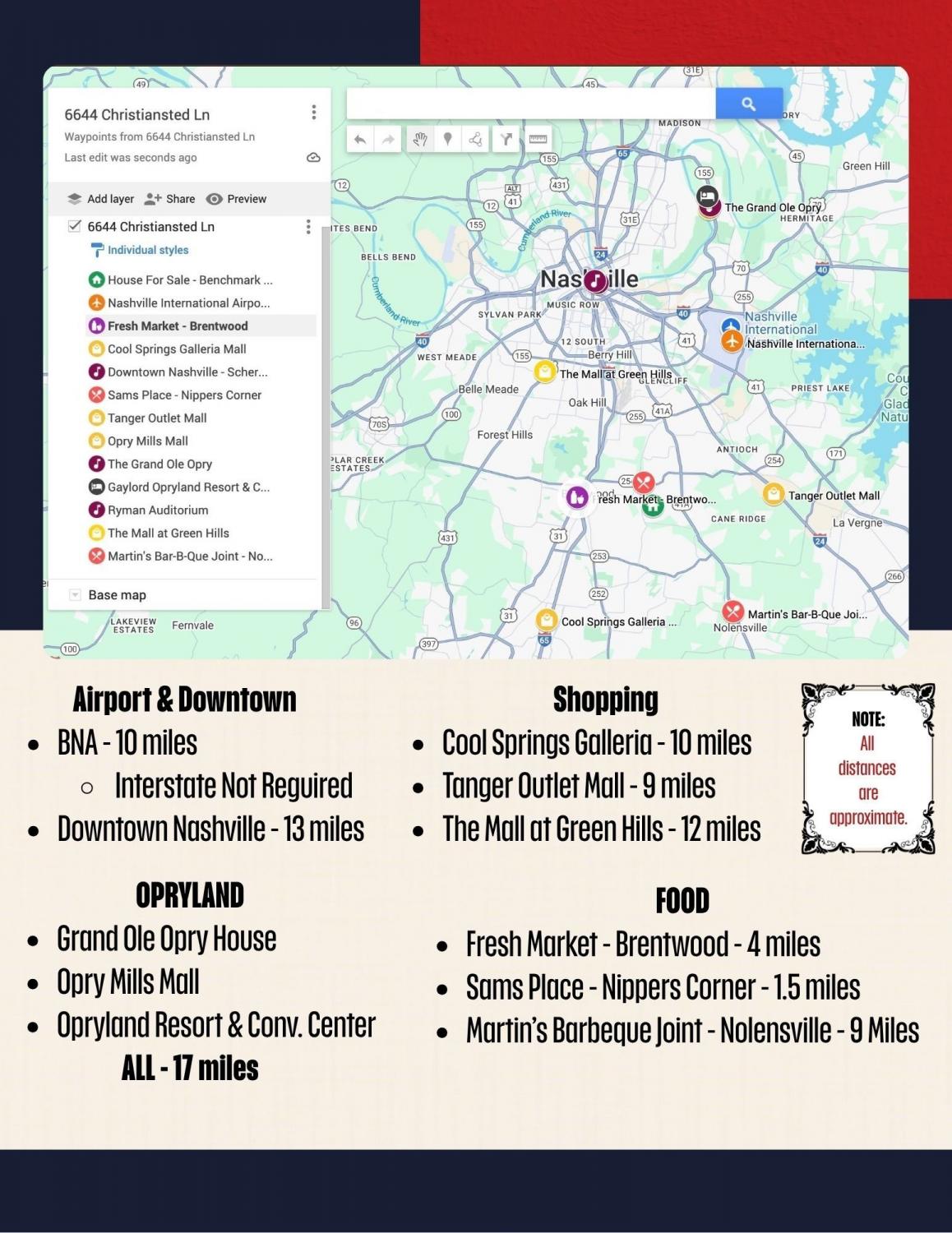 From I-65 Southbound: Take Exit 74A for Old Hickory Blvd East. Turn right onto Edmondson Pike. Turn left onto Mt. Pisgah. Turn left onto Christiansted Lane home will be on your right.