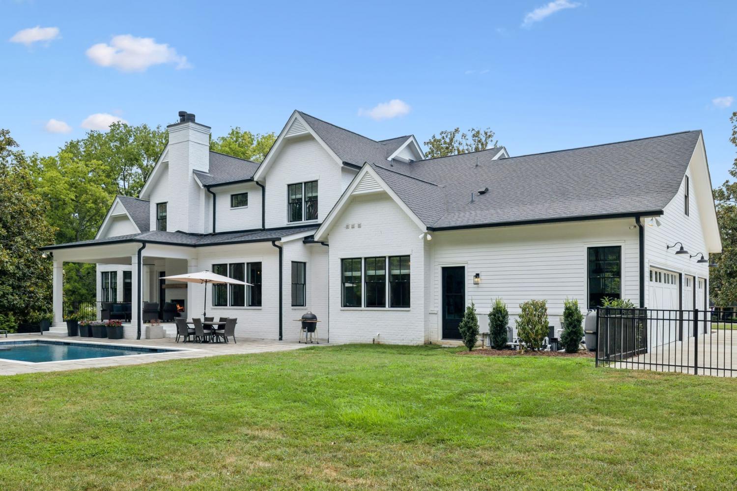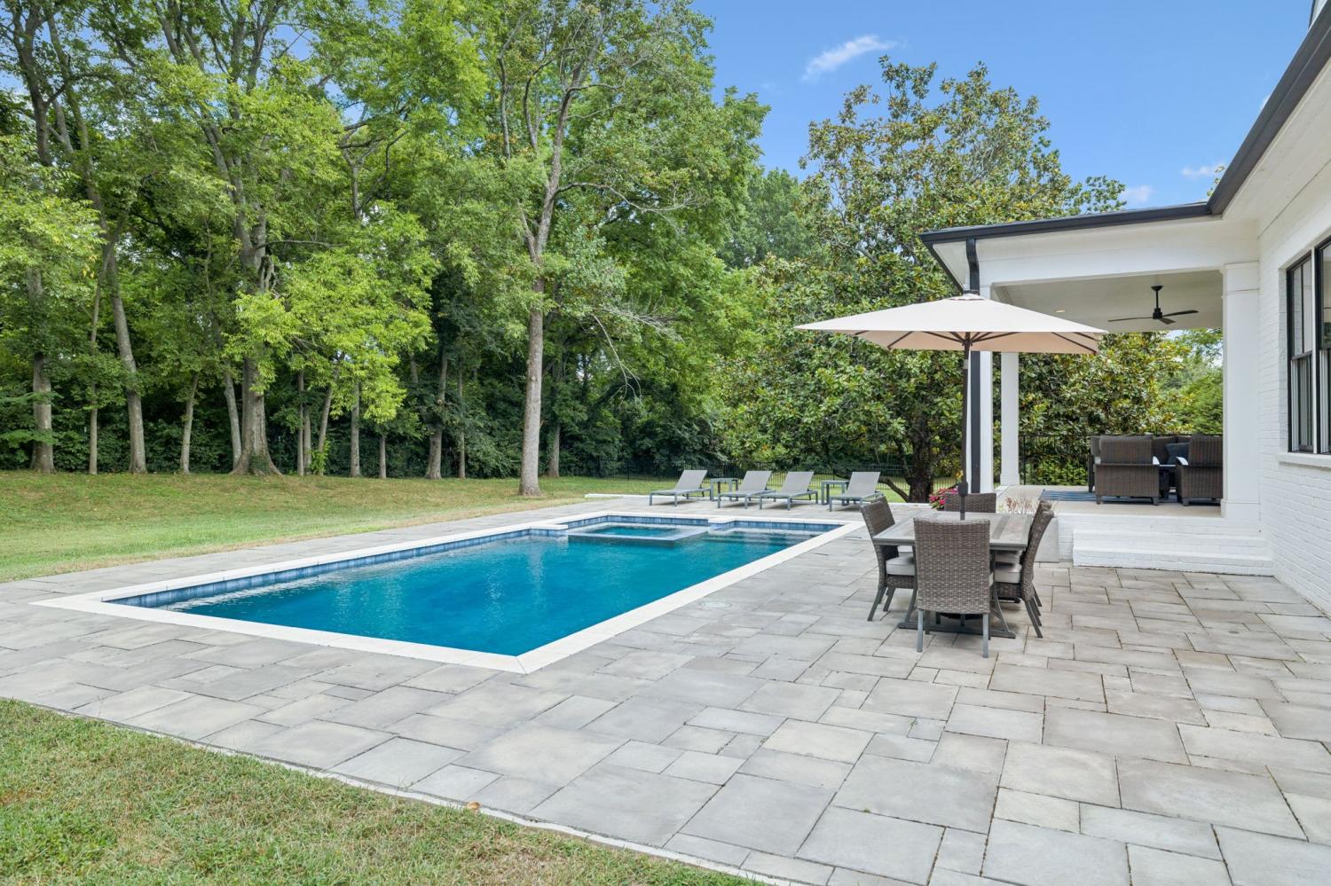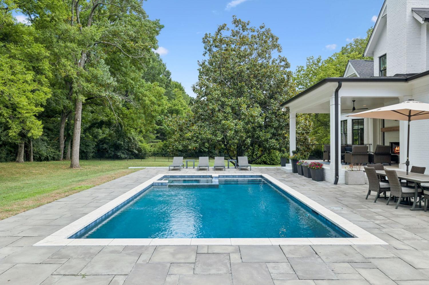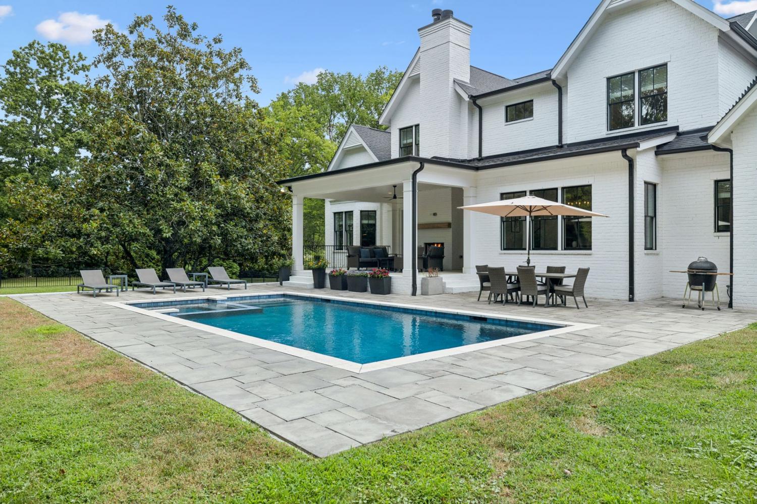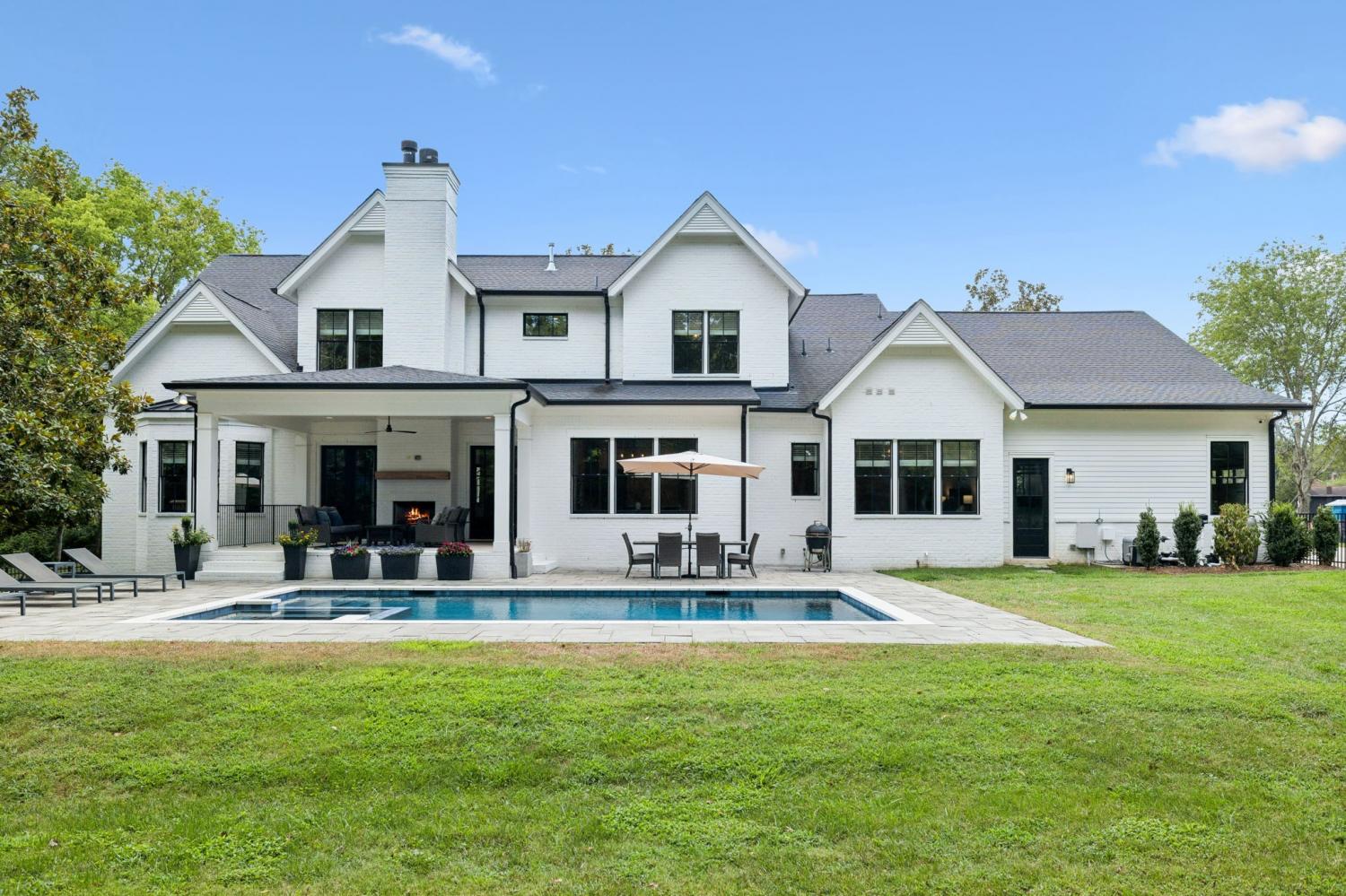 Luxury, comfort, and convenience meet at 5116 Williamsburg Rd in the sought-after Meadowlake community of Brentwood. From the moment you arrive, the beautiful white brick exterior, welcoming covered front porch, and inviting entry foyer set the tone for the elegance inside. Just off the foyer, the formal dining room features a shiplap accent wall, creating a seamless connection to the home’s timeless design details. The heart of the home is the gourmet kitchen, boasting top-of-the-line appliances, ceiling-height cabinetry, a large center island, quartz countertops, a hidden walk-in pantry, and a spacious breakfast nook with a continued shiplap accent wall. The adjoining living room offers a cozy fireplace framed by wooden beams, custom built-in shelving, and dual French doors that open to the covered back porch—perfect for indoor-outdoor living. The main-level primary suite is a private retreat, showcasing a vaulted shiplap ceiling, bay window seating area, and a spa-inspired bath with a stand-alone soaking tub, double vanities, a dedicated makeup station, built-in tile bench in the shower, and a walk-in closet with custom storage. A guest suite on the main floor provides ideal accommodations for visitors. Additional thoughtful touches include a drop-zone with hooks and a bench, and a large laundry/utility room with generous counter space, hanging rods, and even a desk work area. Upstairs, you’ll find a dedicated office or creative space, a spacious bonus room with a wet bar and beverage center, three more bedrooms, two full baths, and abundant unfinished storage space—offering room for future expansion. Step outside to your private 1-acre, fenced backyard oasis, complete with a covered porch featuring a fireplace, a sparkling heated saltwater pool, and an integrated spa—all backed by mature trees for privacy. Zoned for Williamson County’s award-winning schools and ideally located near shopping, dining, and I-65, this home offers the ultimate living experience.