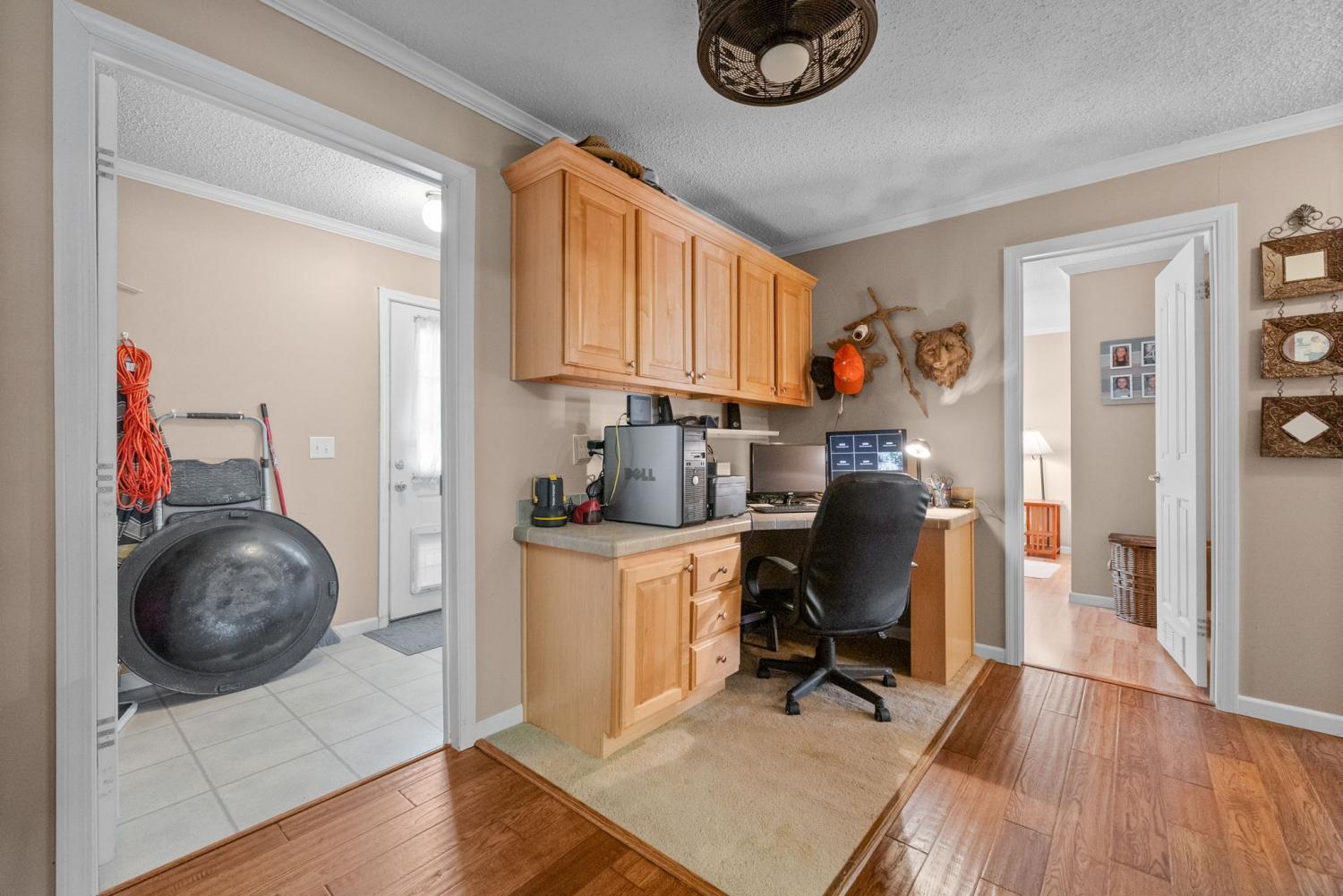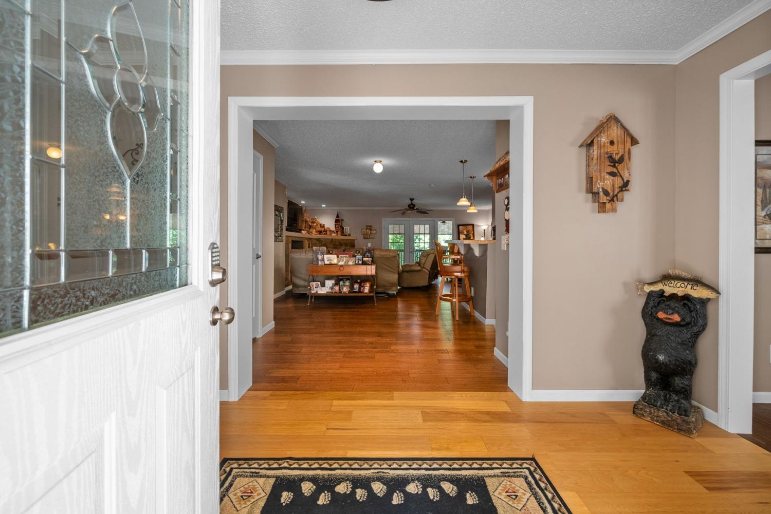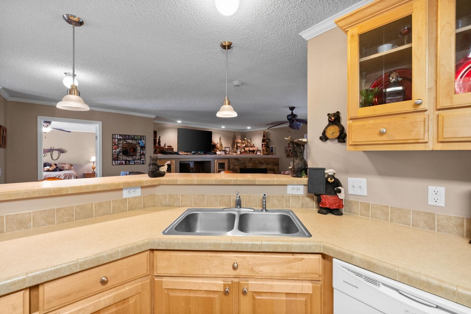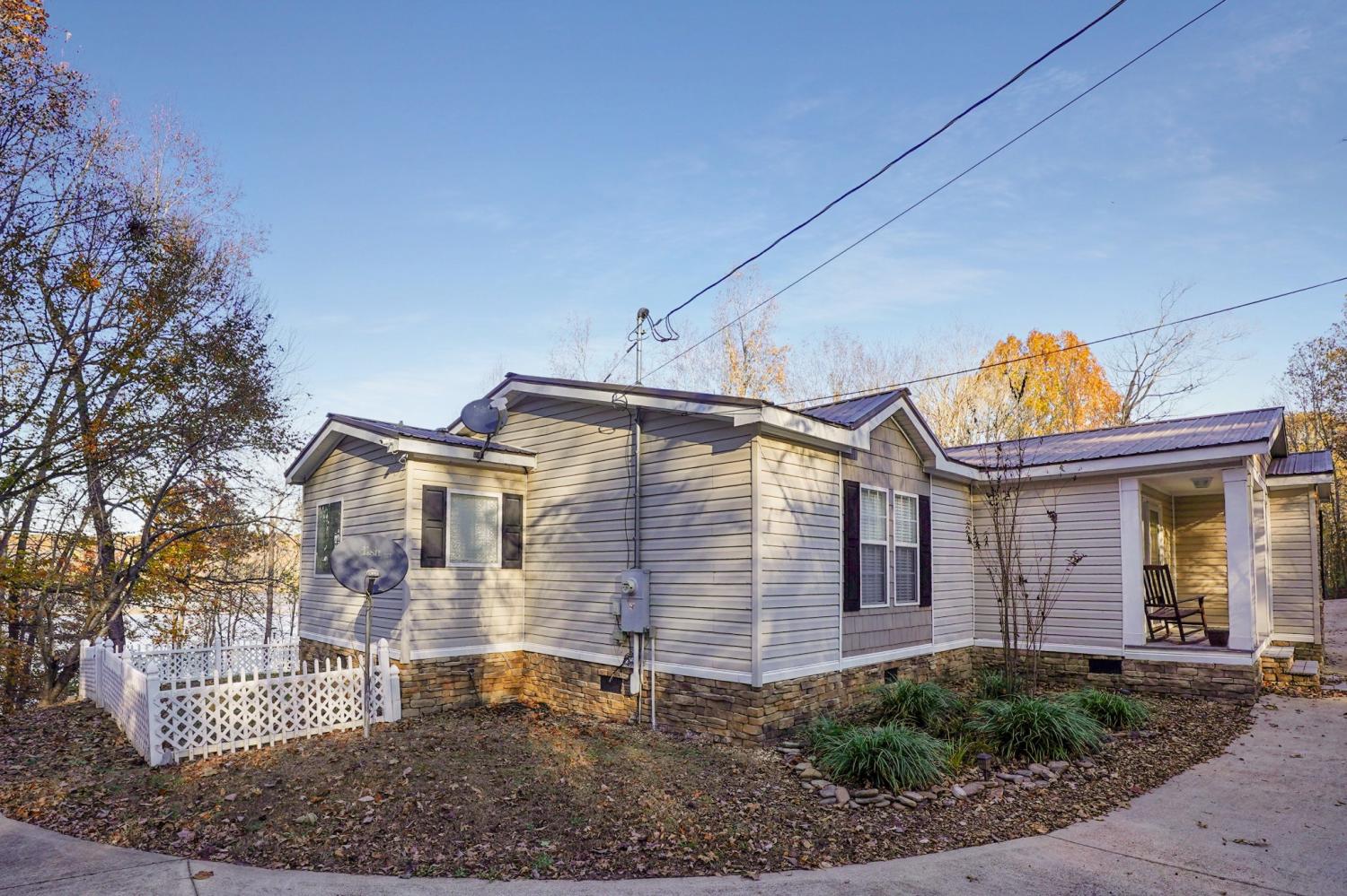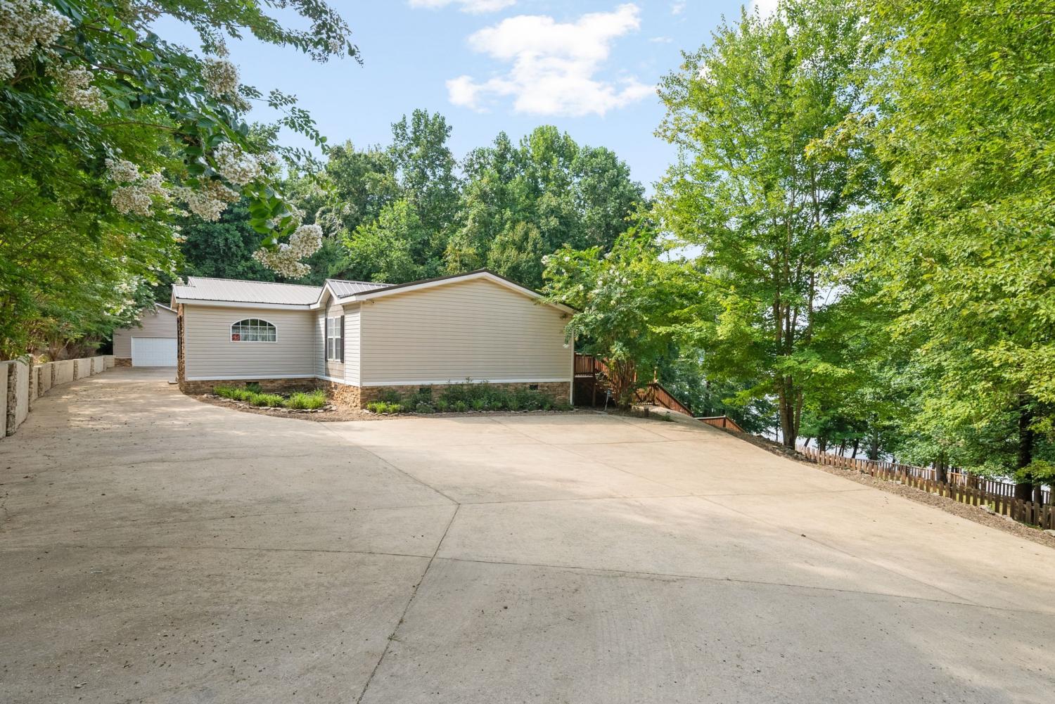 Escape to the tranquility of rural waterfront living! This beautiful home offers an open concept floor plan, precisely placed to enjoy the water view. Gathering room with side built in section with gas logs fireplace-divider bar to the spacious kitchen then leading to the dining room. Master bedroom features a spacious bath and walk in closet. Unique office space in the hallway leading to the 2 guest bedrooms. Laundry room offers a separate door to the back deck. Easy flow floor plan and spacious layout. The back deck is the spot with part covered and part open decking, firepit to the side and steps down to driveway or mid-deck and leading to the back lawn and walkway toward the water. Fenced back lawn is ready for the pets, You find a generous driveway space beyond the front of the home and to the detached garage. Garage is a 2 section connecting setup ; 24 x 11 with back door to additional space and a side 25x16 w/ ample cabinets and storage racks. A storage area is found behind the garage, as well.