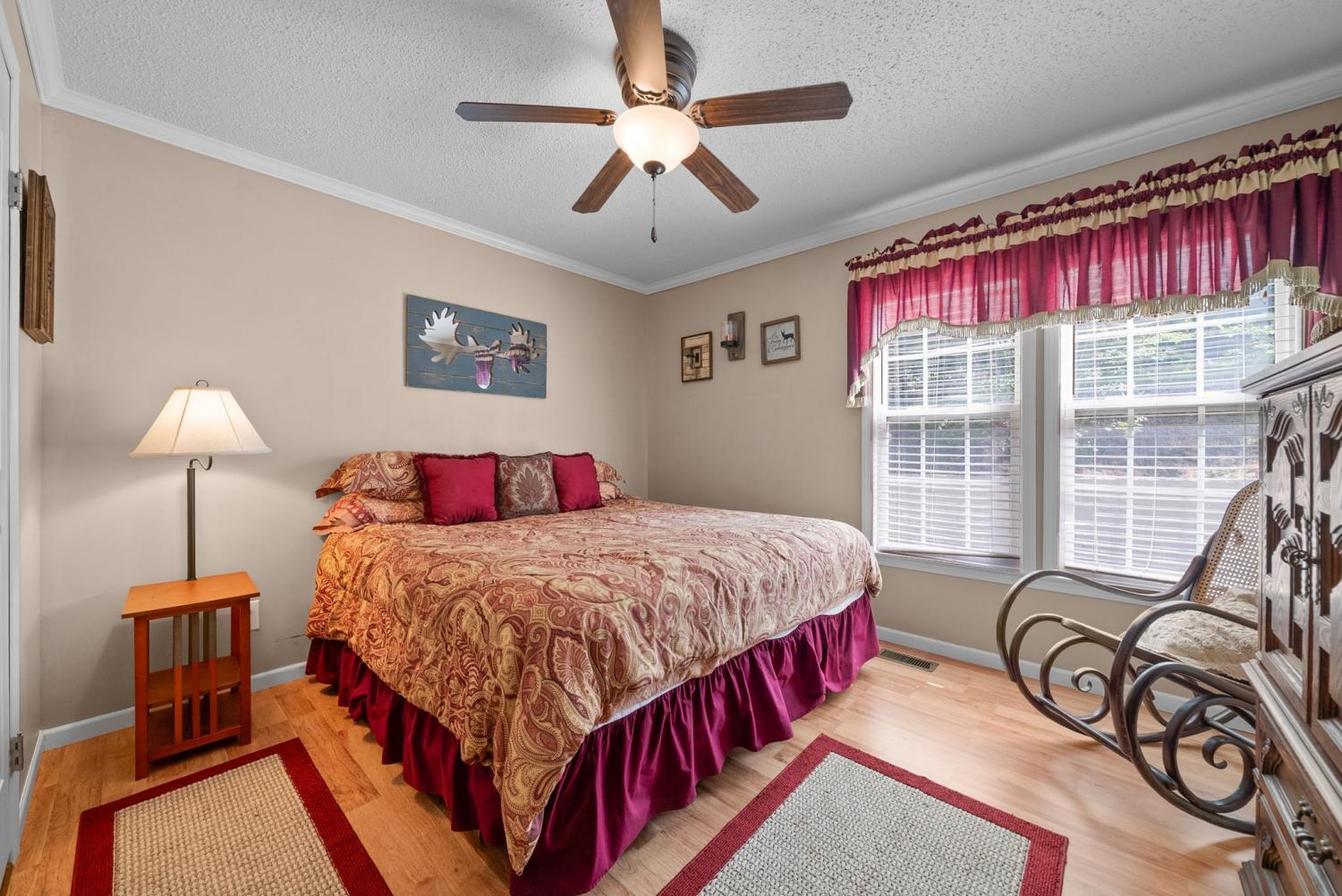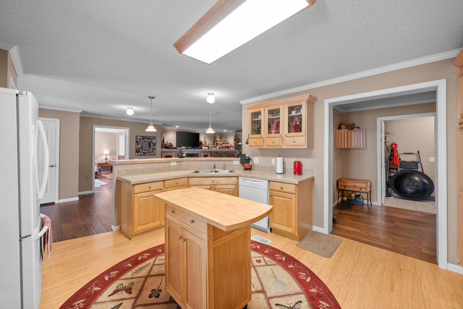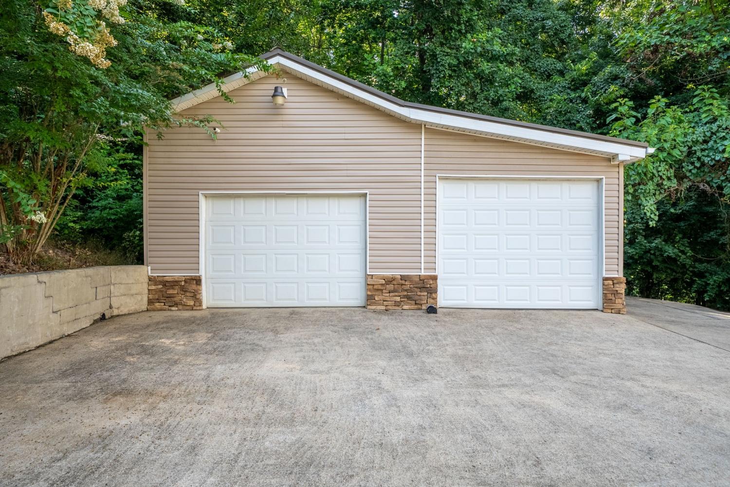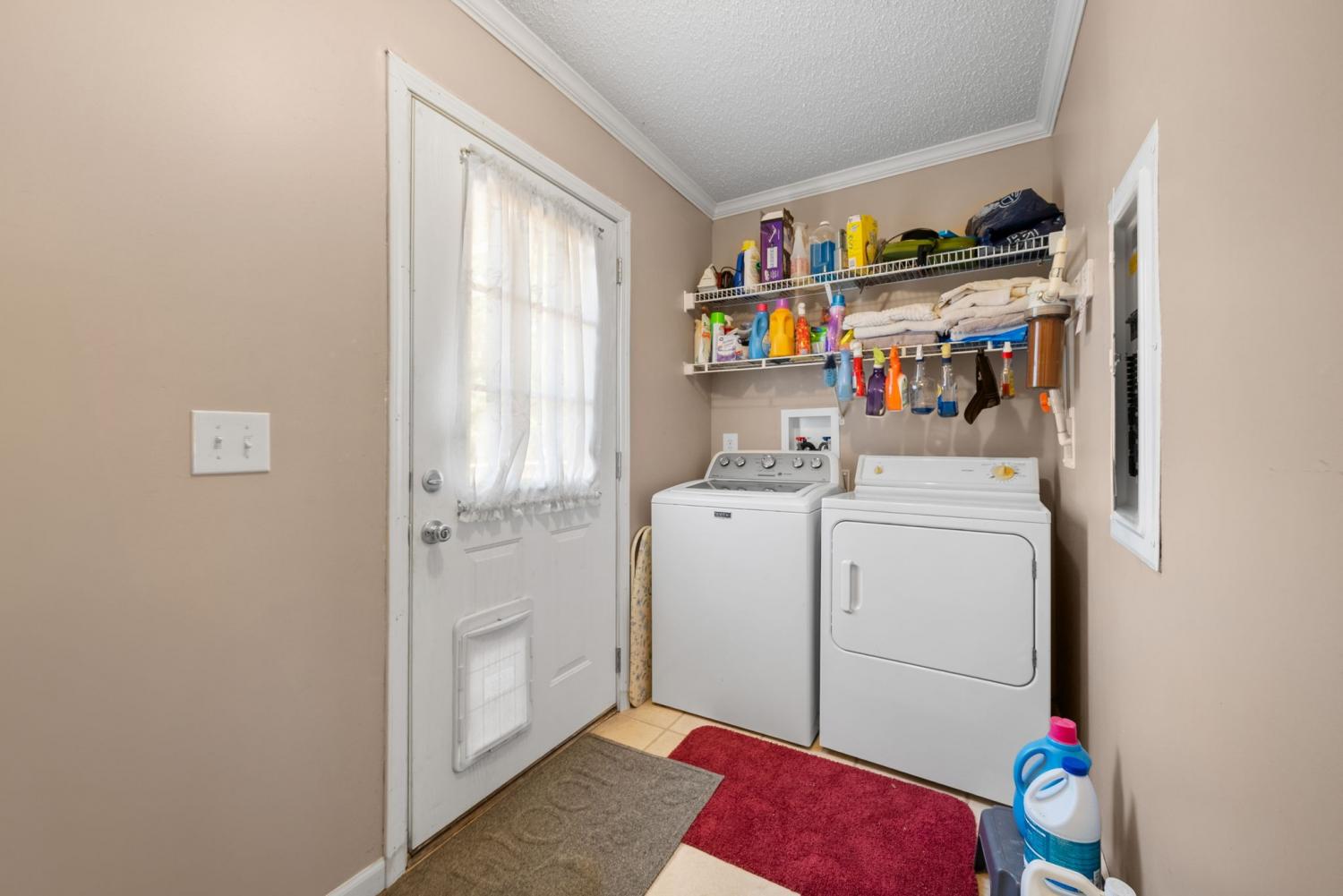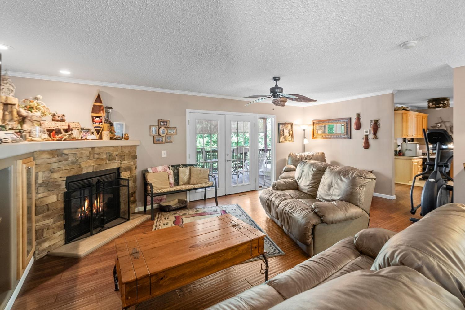 Escape to the tranquility of rural waterfront living! This beautiful home offers an open concept floor plan, precisely placed to enjoy the water view. Gathering room with side built in section with gas logs fireplace-divider bar to the spacious kitchen then leading to the dining room. Master bedroom features a spacious bath and walk in closet. Unique office space in the hallway leading to the 2 guest bedrooms. Laundry room offers a separate door to the back deck. Easy flow floor plan and spacious layout. The back deck is the spot with part covered and part open decking, firepit to the side and steps down to driveway or mid-deck and leading to the back lawn and walkway toward the water. Fenced back lawn is ready for the pets, You find a generous driveway space beyond the front of the home and to the detached garage. Garage is a 2 section connecting setup ; 24 x 11 with back door to additional space and a side 25x16 w/ ample cabinets and storage racks. A storage area is found behind the garage, as well.