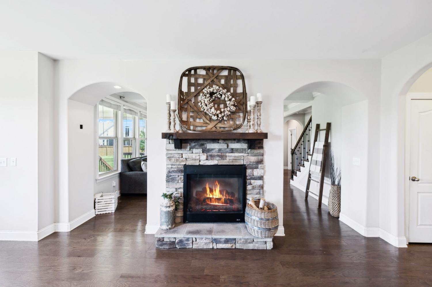 Up to $10k in buyer incentives with preferred lender on unbeatable new price at this stunning 4-bedroom, 3.5-bath all-brick home located just steps from the community pool in one of the area’s most desirable neighborhoods. Inside, the upgraded gourmet kitchen features quartz countertops, stainless steel appliances with a double oven, a spacious island, and ample cabinetry—perfect for both daily living and entertaining. The open-concept layout flows seamlessly into the living room, highlighted by a cozy double-sided fireplace. The main-level primary suite adds convenience and comfort, while upstairs offers a large bonus room ideal for a media room, game room, or office. Two secondary bedrooms are connected by a Jack-and-Jill bath, providing both function and privacy for family or guests.Enjoy outdoor living on the covered patio with sunshades, overlooking a private fenced backyard that backs to mature trees for added seclusion.