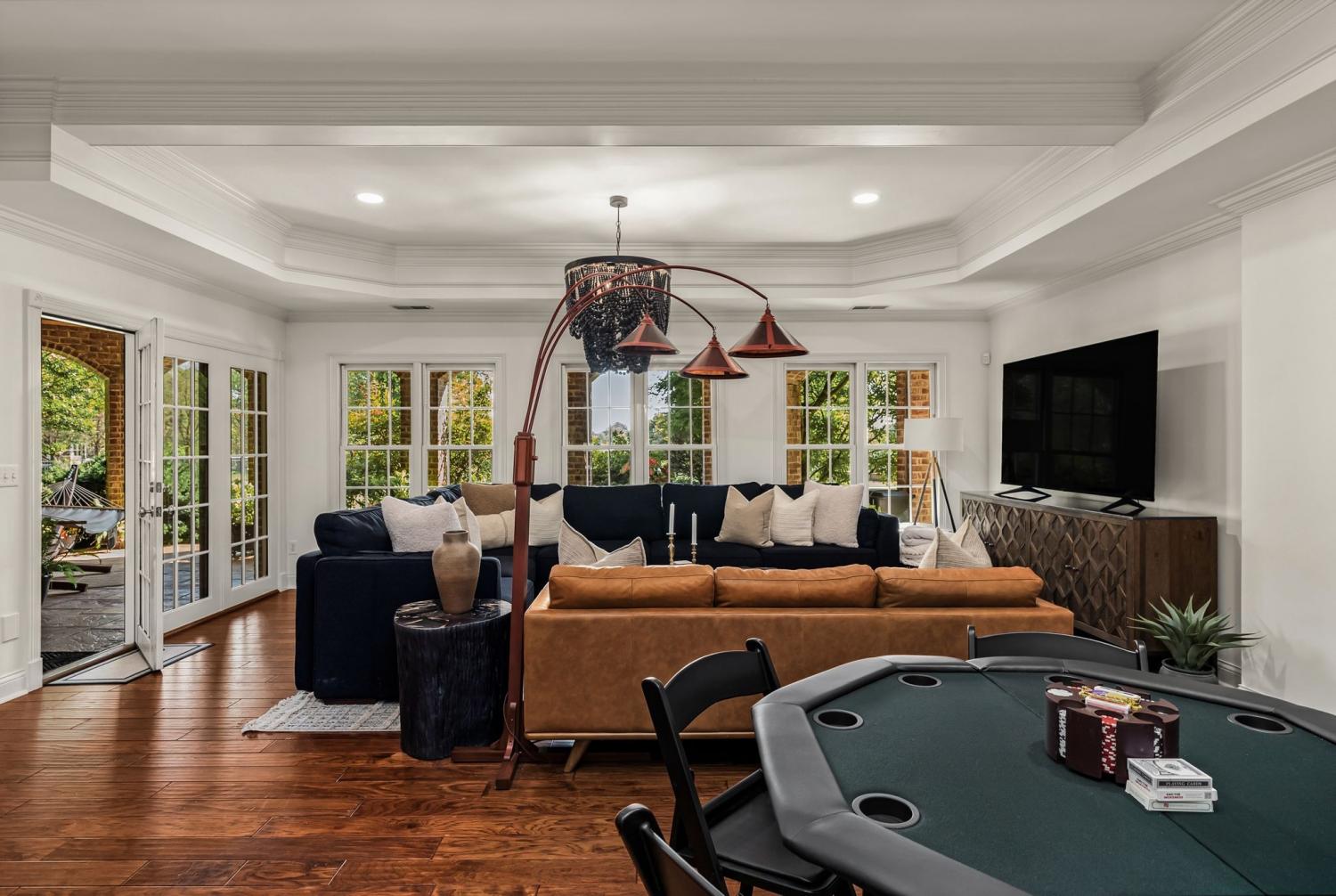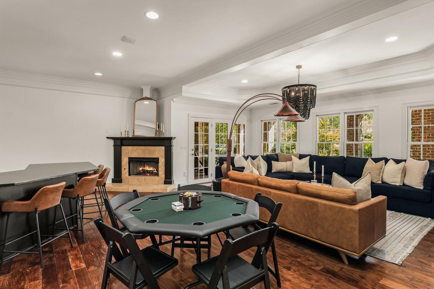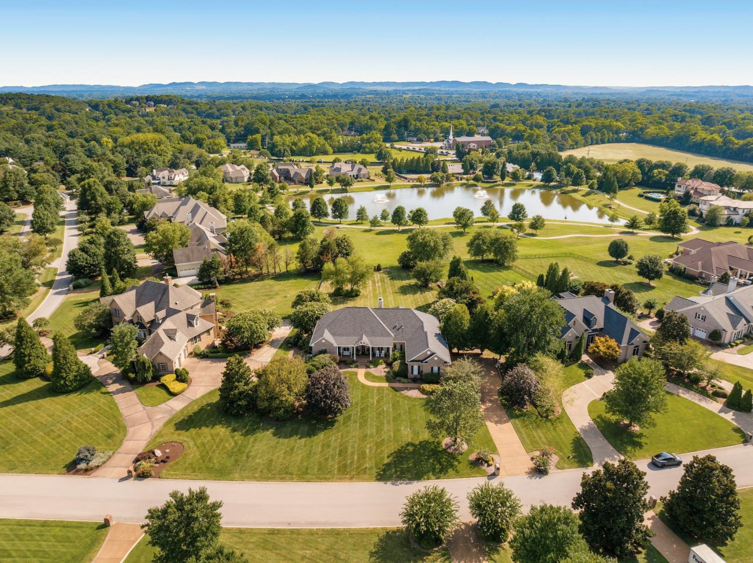 Experience refined living at 805 Legends Glen Court, situated on a 1.02-acre flat lot with serene lakes views. The fenced backyard offers privacy and space, while the covered front porch, expansive back balcony, and lower patio create a seamless indoor-outdoor living experience. Step inside to discover a bright, open floor plan where a formal dining room seamlessly transitions into the inviting living area, anchored by a cozy fireplace and framed by large windows that flood the home with natural light. The chef’s kitchen features a generous island, double ovens, and a gas cooktop, ideal for both everyday living and entertaining. This home boasts two primary suites on the main level, providing flexible living arrangements. You’ll find spaces designed for every lifestyle, including a media room, home gym, billiard room, a recreation room with a wet bar, and a flex space with a doggy door. Additional highlights include a three-car garage and an ideal location just minutes from top-rated schools, shopping, dining, and the many attractions of Franklin.