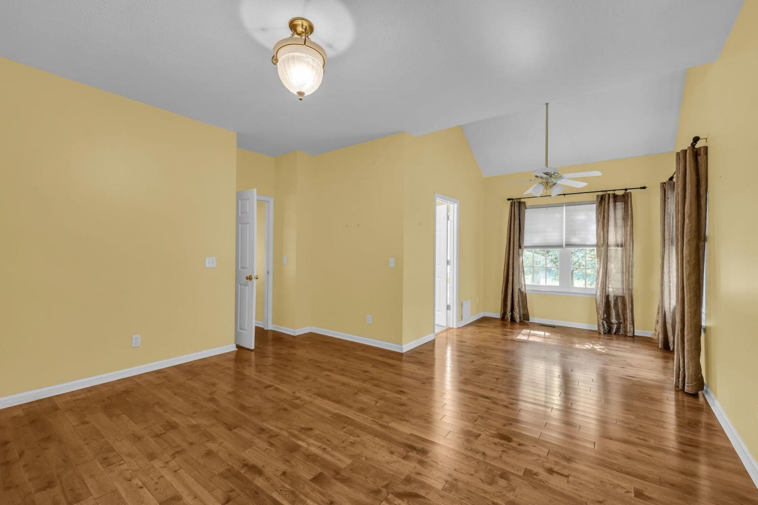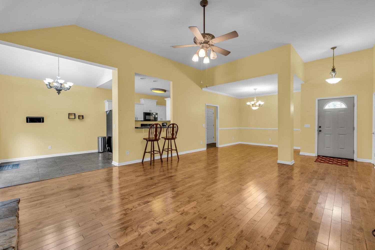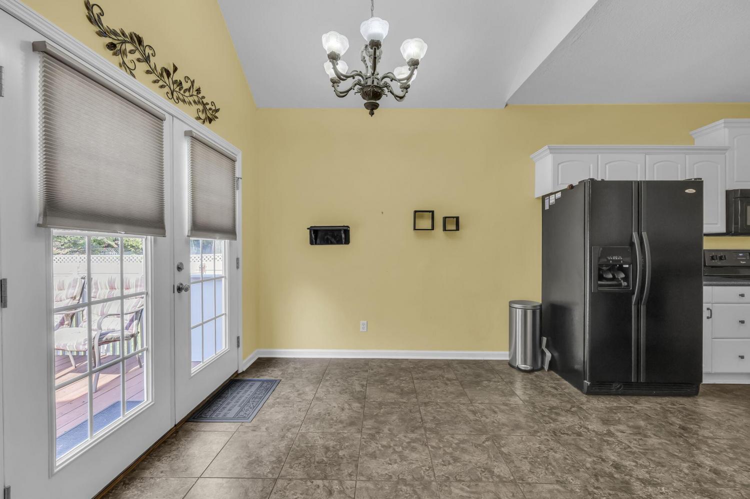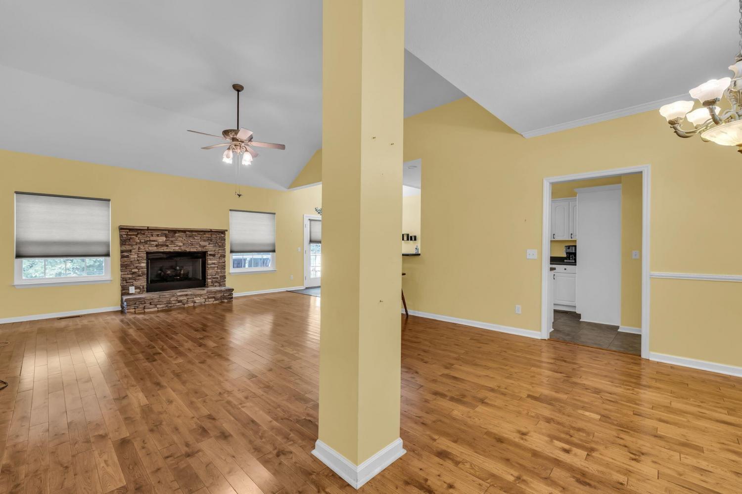 This charming 3-bedroom, 2-bath home offers the perfect blend of comfort and style—all on one level. Step inside to an inviting open layout where hardwood floors, soaring vaulted ceilings, and a distinctive stacked stone fireplace set the tone for relaxed living. The kitchen is designed for both convenience and connection, seamlessly flowing into the eat-in area and formal dining room—ideal for everyday life and entertaining. The spacious primary suite is a true retreat, featuring a double vanity, soaking tub, and generous walk-in closet. Outside, unwind on the deck while enjoying a private, tree-lined backyard that provides the perfect backdrop for quiet mornings or gatherings with friends. This home combines comfort, style, and convenience in a desirable location.