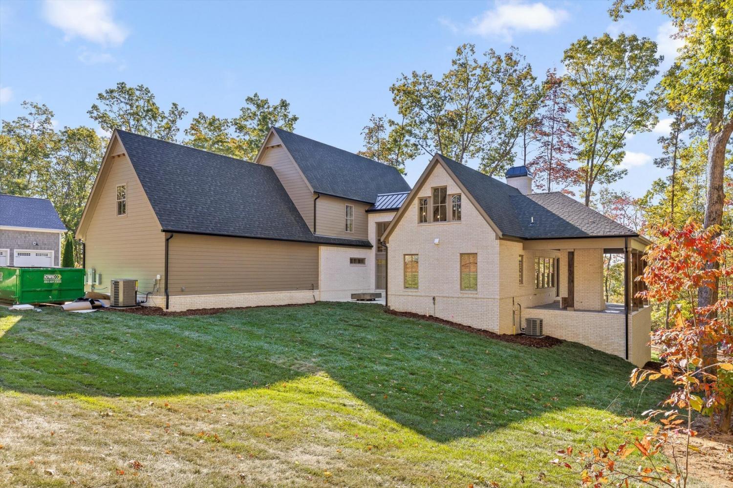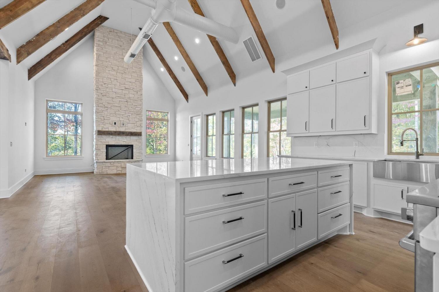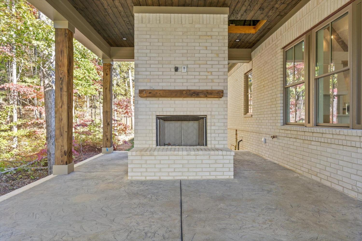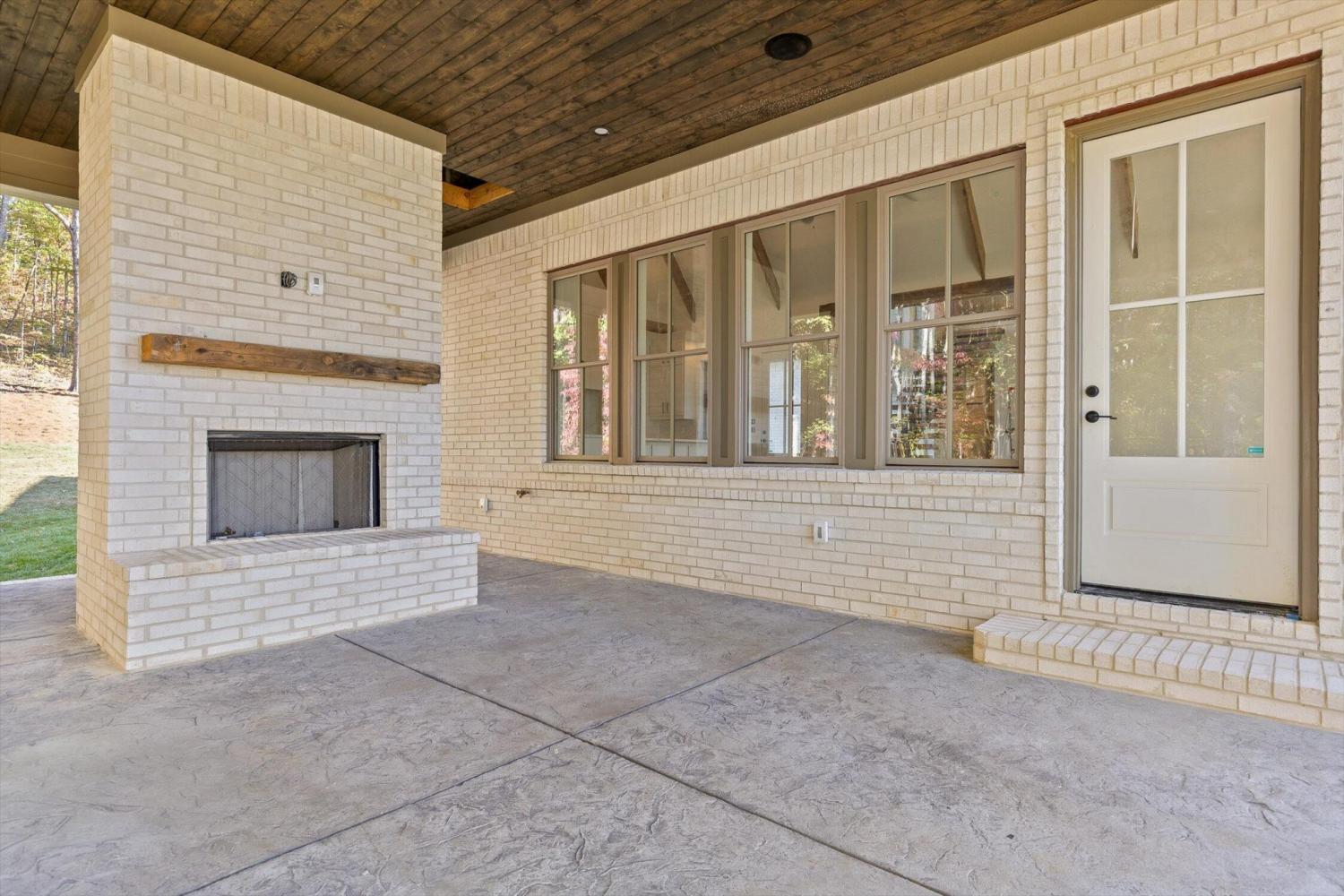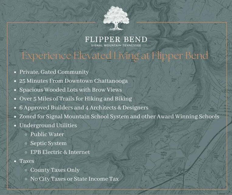 Welcome to your modern mountain dream home crafted by Deep South Custom Homes in the prestigious gated community of Flipper Bend on Signal Mountain, TN. Nestled on a corner lot right across from the brow views of Chattanooga's verdant valley, this 4-bedroom, 3.5-bathroom luxury home offers unparalleled craftsmanship and contemporary elegance. Step up the grand front path and onto the inviting stone front porch and step through the glassed entry into a roomy foyer with a floating staircase allowing amazing views out the windows on each side of this glass box masterpiece. To the left, discover the heart of the home - a spacious kitchen and living area flanking the central dining space. Accentuating the living space are the vaulted ceilings with exposed antique rafters and other antique beam accents lending old world charm as well as a stone fireplace extending to the center of the vault adding texture and warmth. The living room showcases the cozy gas fireplace flanked by windows for magnificent views and convenient access to the screened, side porch with more mountain views, a fireplace with TV hookups above, and an attached, covered grilling porch with a built-in grill.The kitchen features site-built, custom cabinetry, quartz counters and back splashes, a 48'' gas range with a copper venthood, a large island with seating, a 60'' refrigerator/freezer, and a scullery. Returning through the foyer, to explore the other half of the house, don't miss the back patio in a quaint courtyard with space for a fire pit with a fire ring or a water feature to create a serene outdoor oasis. Through the foyer on the right of the home is the rear entry hall leading to a three car garage on the back of the home. The rear entry hall is well appointed with custom storage and a powder room. On the front right of the home you will find the luxurious master suite with views towards the brow.