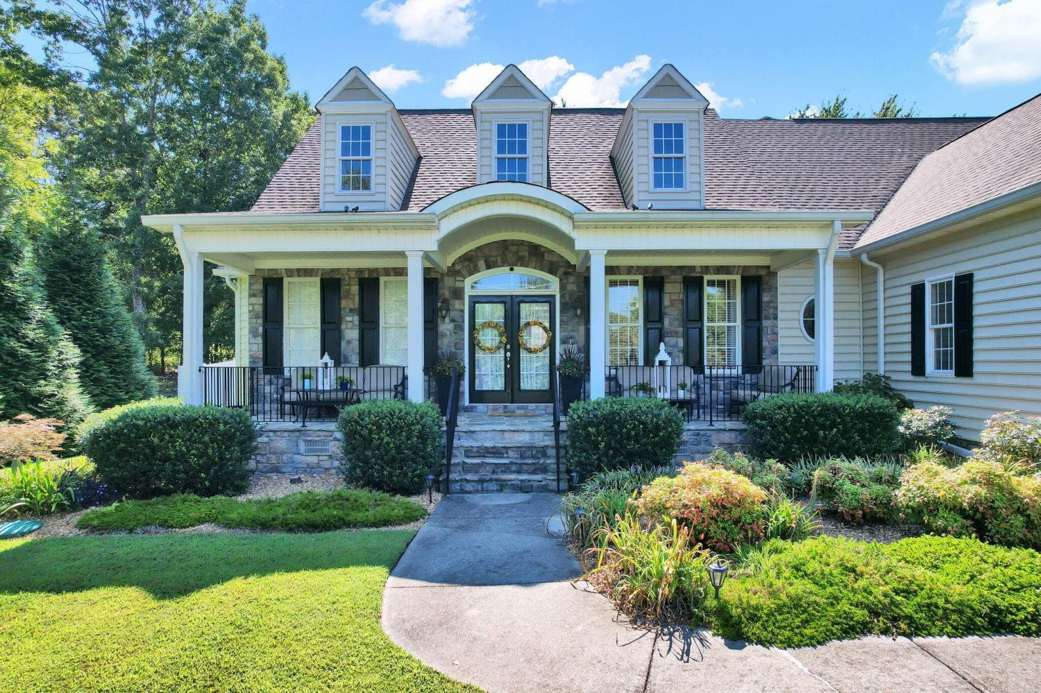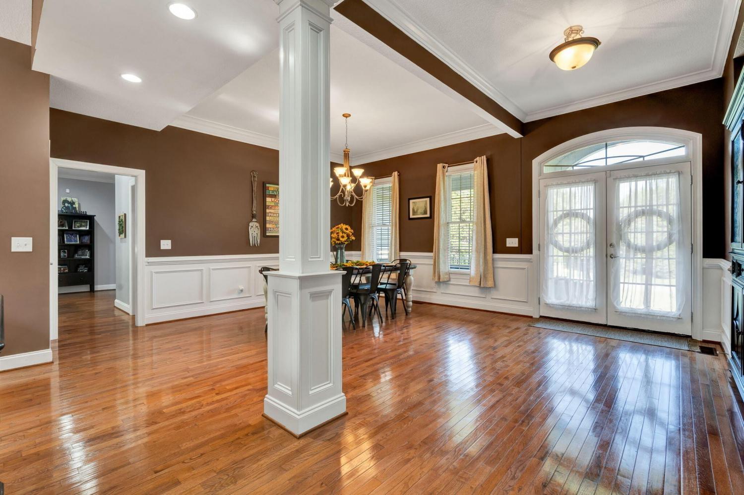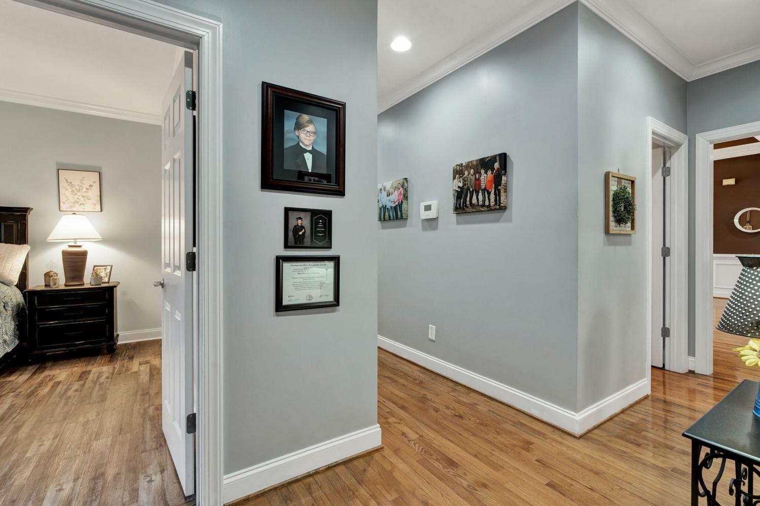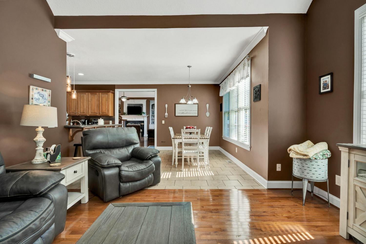 This exceptional residence showcases sophisticated living in the prestigious Covenant Hills Subdivision. With 3,467 square feet of thoughtfully designed space, the home offers 3 bedrooms, 3.5 bathrooms, and a versatile flex area currently used as a 4th bedroom, making it ideal for today's lifestyle needs. The heart of the home is the impressive great room, highlighted by cathedral ceilings, crown molding, and a cozy gas fireplace framed by custom built-in bookcases. Anderson windows fill the interiors with natural light, while the open floor plan creates seamless flow between the living spaces. The gourmet kitchen boasts granite and Corian countertops, custom cabinetry, a breakfast bar, and a spacious pantry—perfect for everyday meals and entertaining alike. A formal dining room adds to the home's appeal, offering an elegant setting for special gatherings. The main-level primary suite provides a private retreat with tray ceilings, a large walk-in closet, and a spa-like bathroom featuring a soaking tub, double vanity, and custom tile shower. Two additional bedrooms on the main floor add comfort and flexibility. Upstairs, a bonus room and sitting area provide endless options for recreation, hobbies, or a home office. Outdoor living shines with a screened rear porch and expansive deck designed for entertaining or quiet relaxation. A detached 24x24 garage with fully floored upstairs provides exceptional storage or workshop potential. Additional features include an alarm system, exterior security cameras, and infrastructure in place for a sprinkler system (not currently connected). Located in one of the area's most desirable neighborhoods, this meticulously maintained home combines quality construction, elegant finishes, and functional design. Covenant Hills offers an established community atmosphere with convenient access to local amenities, making this property an outstanding opportunity with fiber optic coming soon.