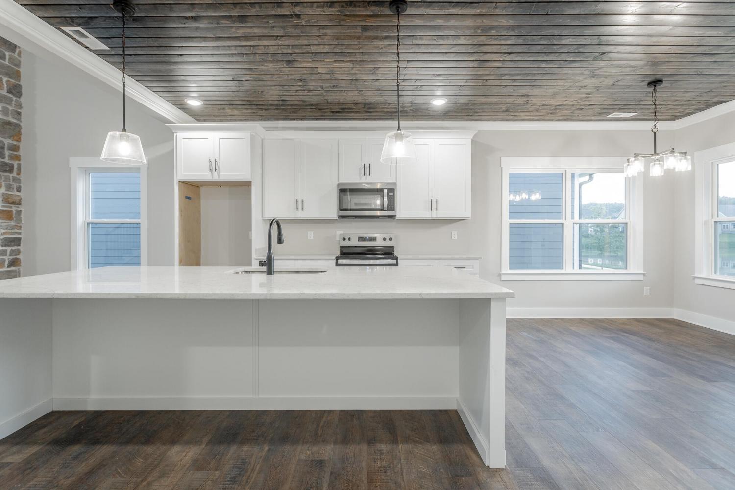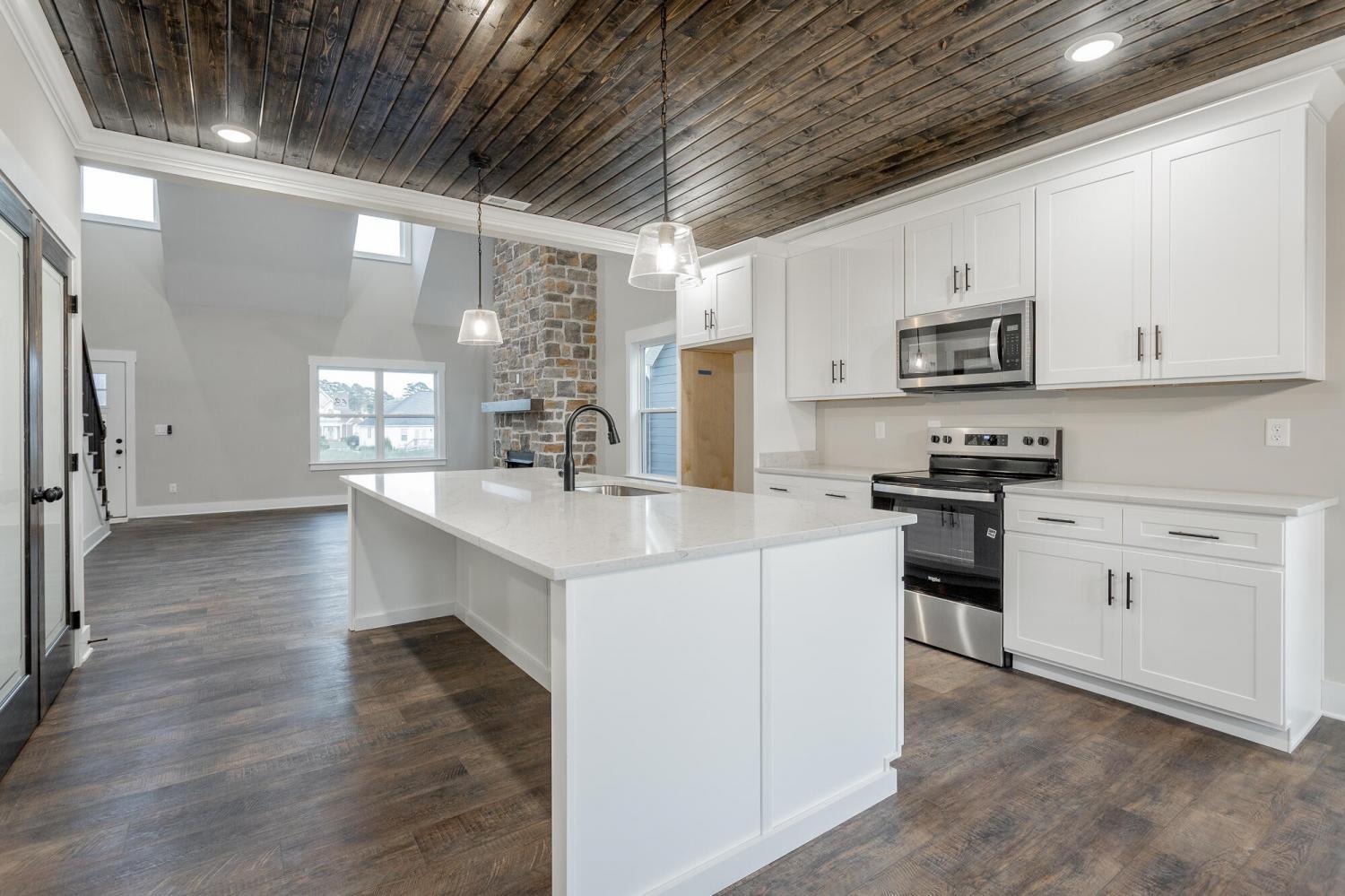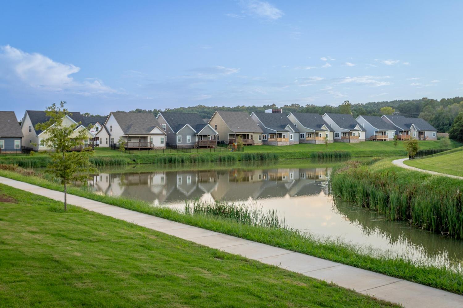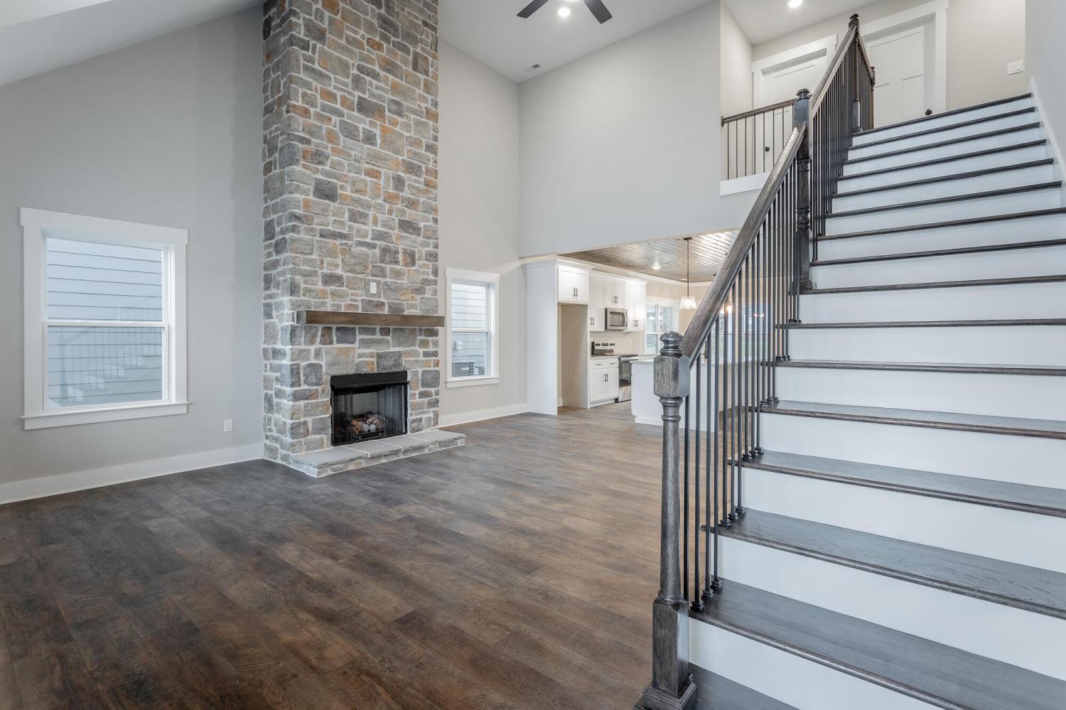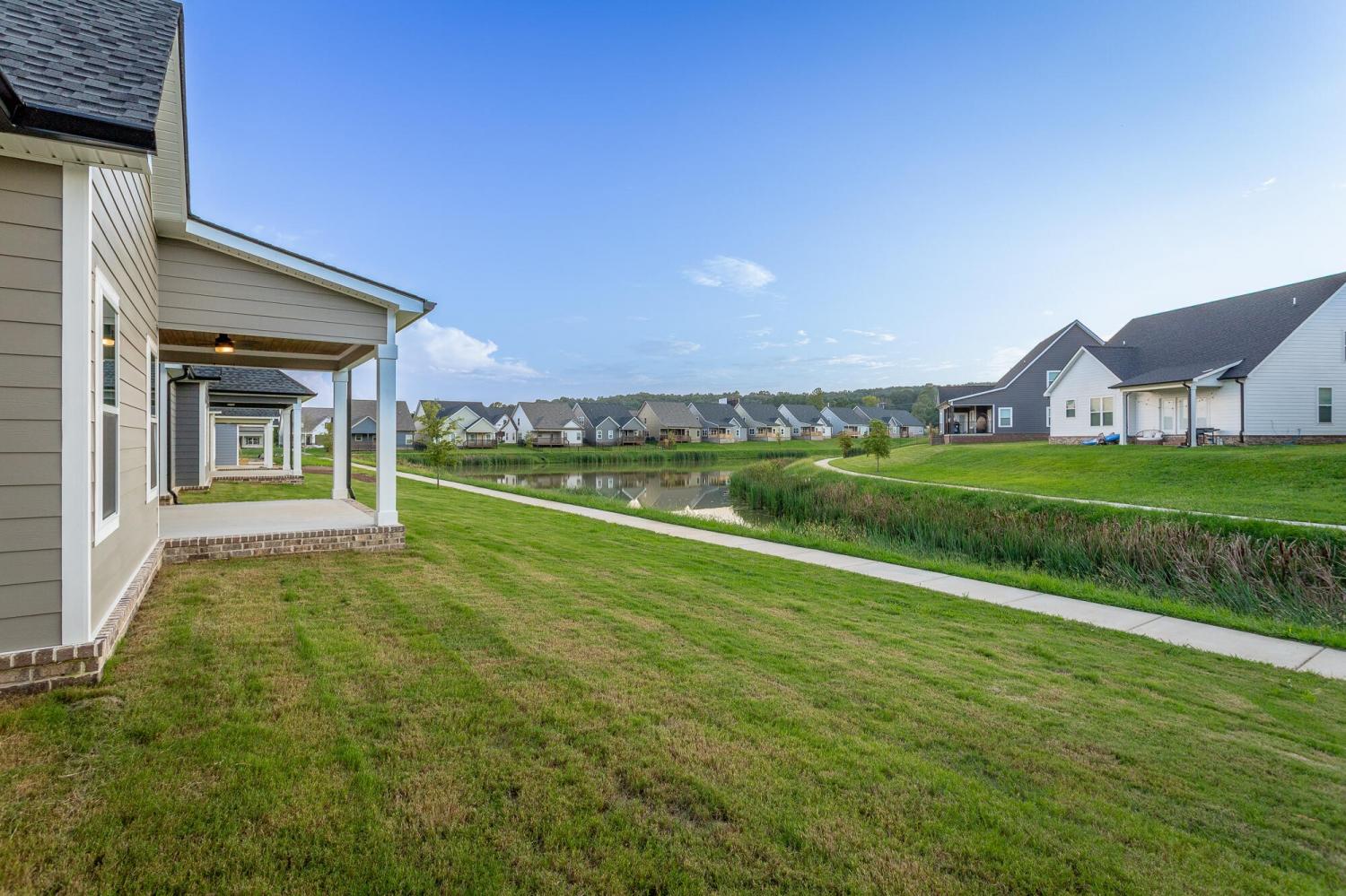 Welcome to The Grove, a convenient Ringgold neighborhood zoned for Heritage schools. This NEW 4 Bedroom, 3.5 Bath home, spanning just under 2,400 square feet, includes a builder's new home warranty for peace of mind. The exterior features low-maintenance fiber cement siding, brick on the foundation elevation, low-E vinyl windows, a zero-entry raised slab foundation, and a fully sodded, landscaped yard. This charming sidewalk-lined neighborhood has a swimming pool, community pond, and walking paths, and it's just 2.7 miles from I-75 at Battlefield Parkway—23 minutes to Dalton and 19 minutes to downtown Chattanooga. The Great Room (15'4'' x 20'10'') welcomes you with a vaulted ceiling, gas log fireplace with stone surround and wood beam mantel, and ''Wine Barrel'' SPC vinyl plank flooring—waterproof and scratch-resistant—flowing into the Kitchen and Dining Areas. The Kitchen includes an oversized island, stainless steel sink, quartz countertops, Whirlpool stainless appliances, soft-close cabinetry, double-door pantry, and stained v-groove ceiling. An adjacent Dining Area (14'5'' x 11') overlooks the covered back porch with views of the community pond. The main-level primary suite (14'2'' x 16'1'') offers a vaulted ceiling, barn door to an ensuite bath with an oversized tiled shower, 6-foot soaking tub, Delta fixtures, quartz countertops, and a walk-in closet connected to the Laundry Room (6'10' x 9'9''). Located on the back of the home, the primary suite also has windows with pond views. Upstairs, you'll find three bedrooms and two full baths. Bedroom 2 includes a full ensuite bath. Unlike other homes, this functional floor plan has generously sized closets and bedrooms. Enjoy picturesque sunsets over the community pond from your back porch, stroll the many walking paths around the community, or use the community swimming pool on hot summer days. Move-in ready, this home provides a practical, low-maintenance home with a thoughtfully designed, efficient floor plan.