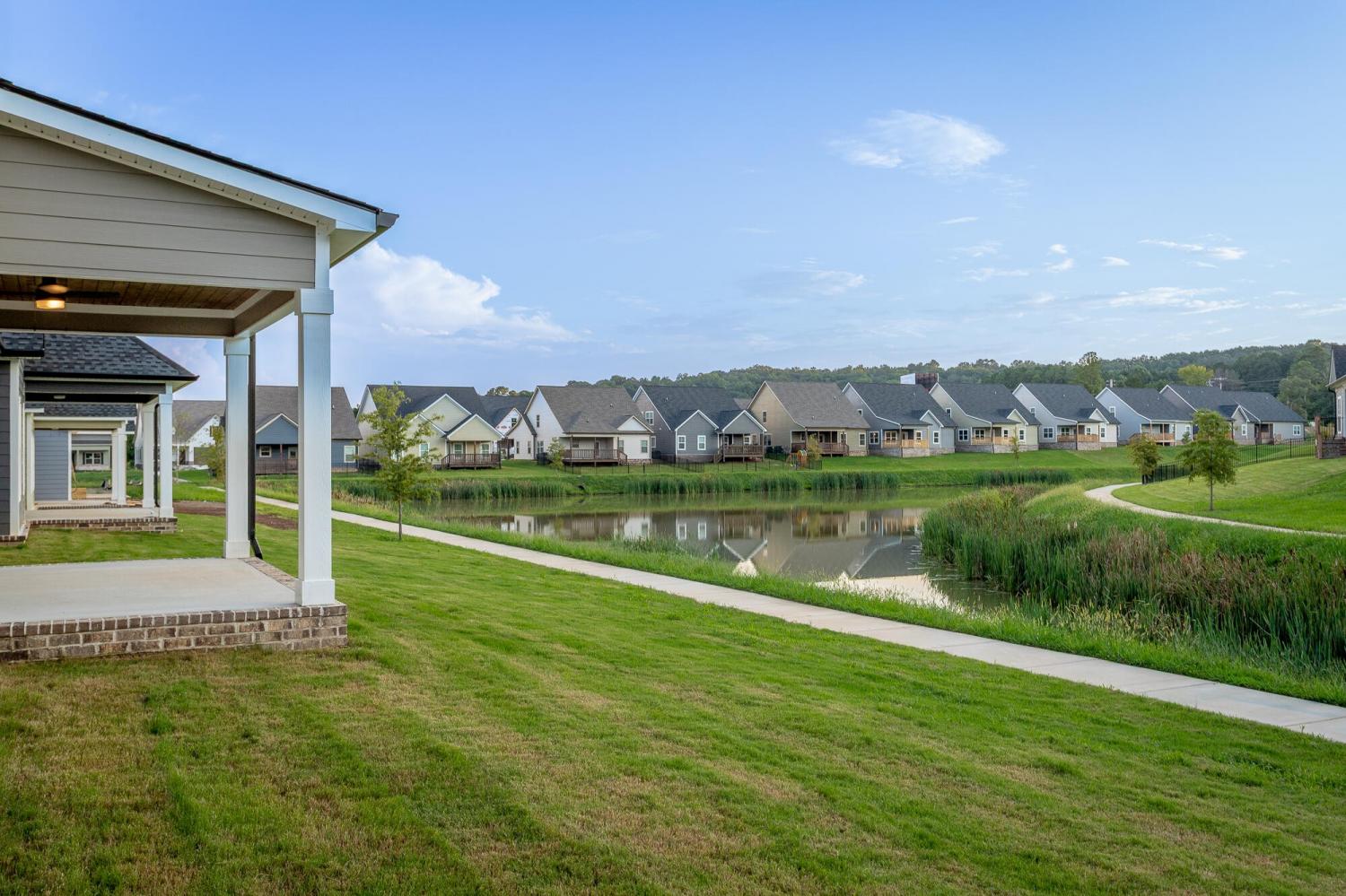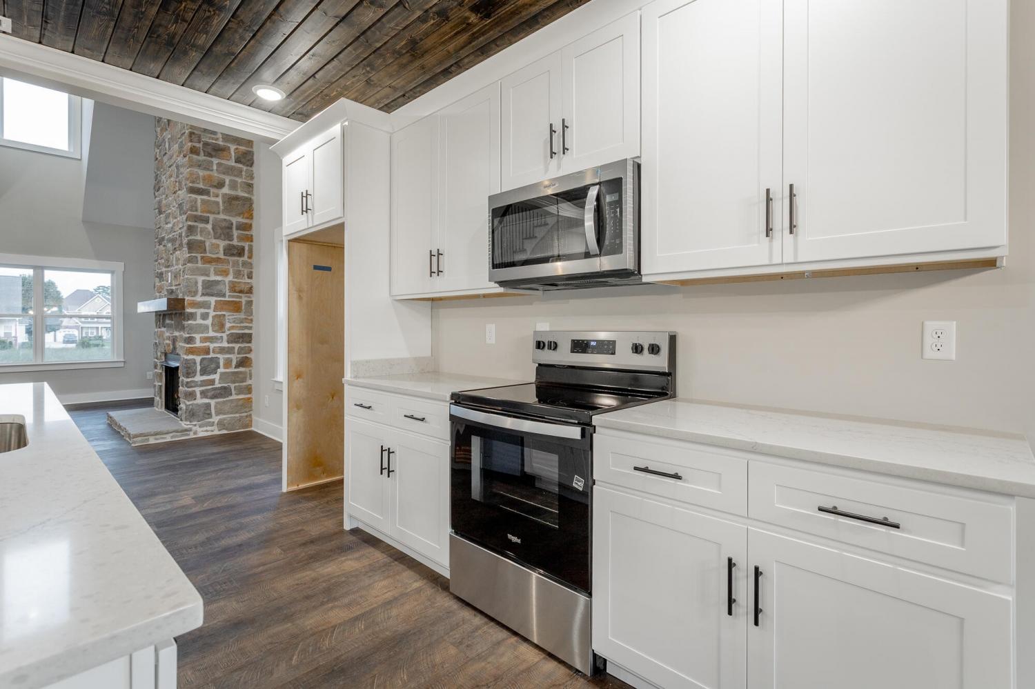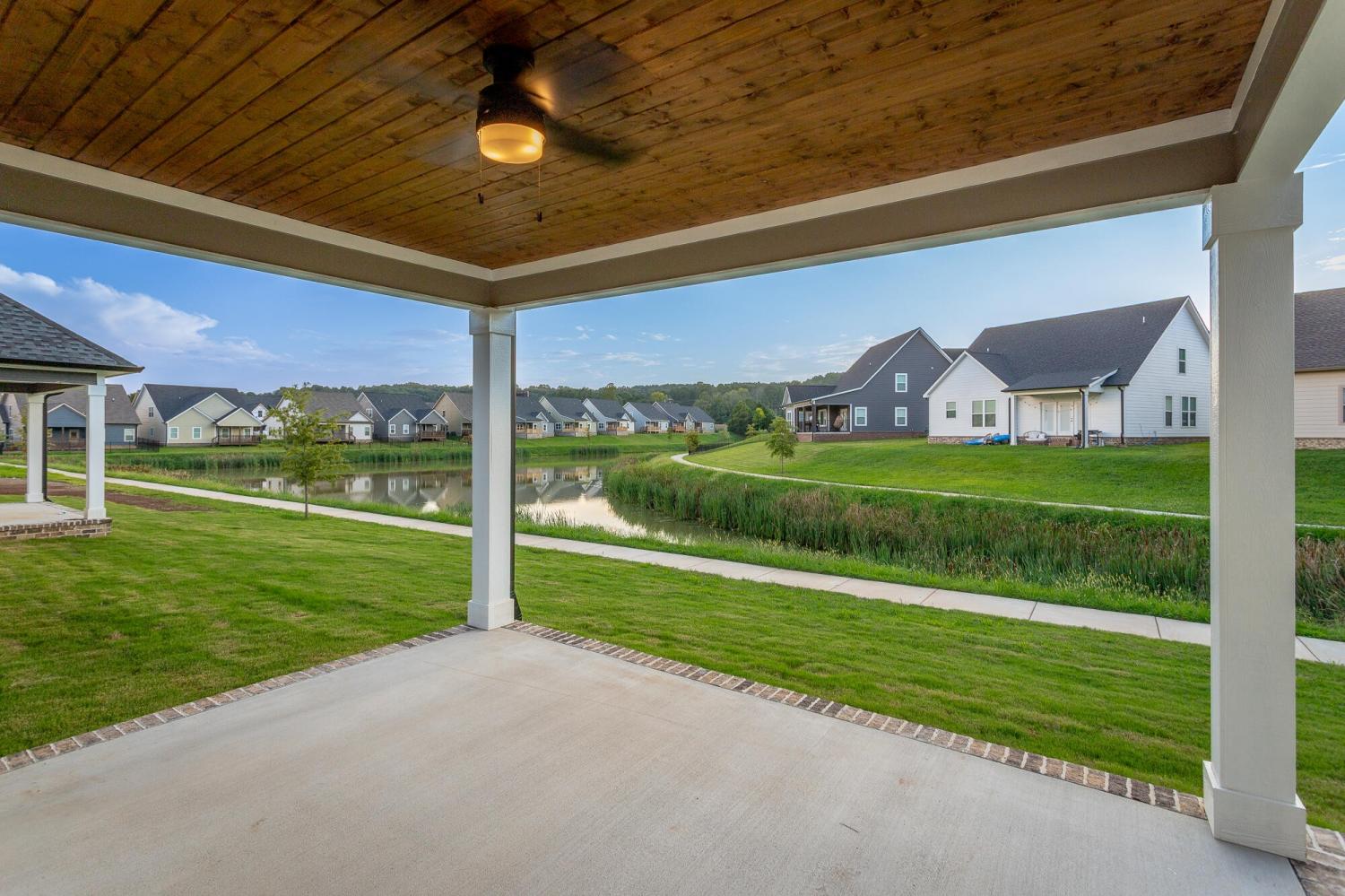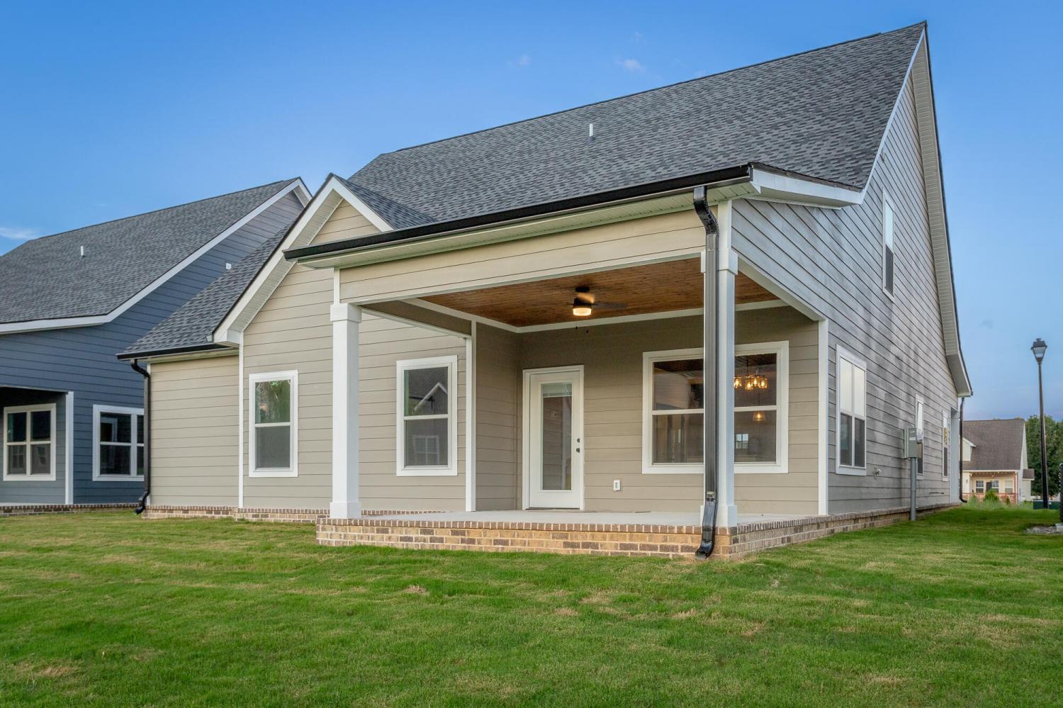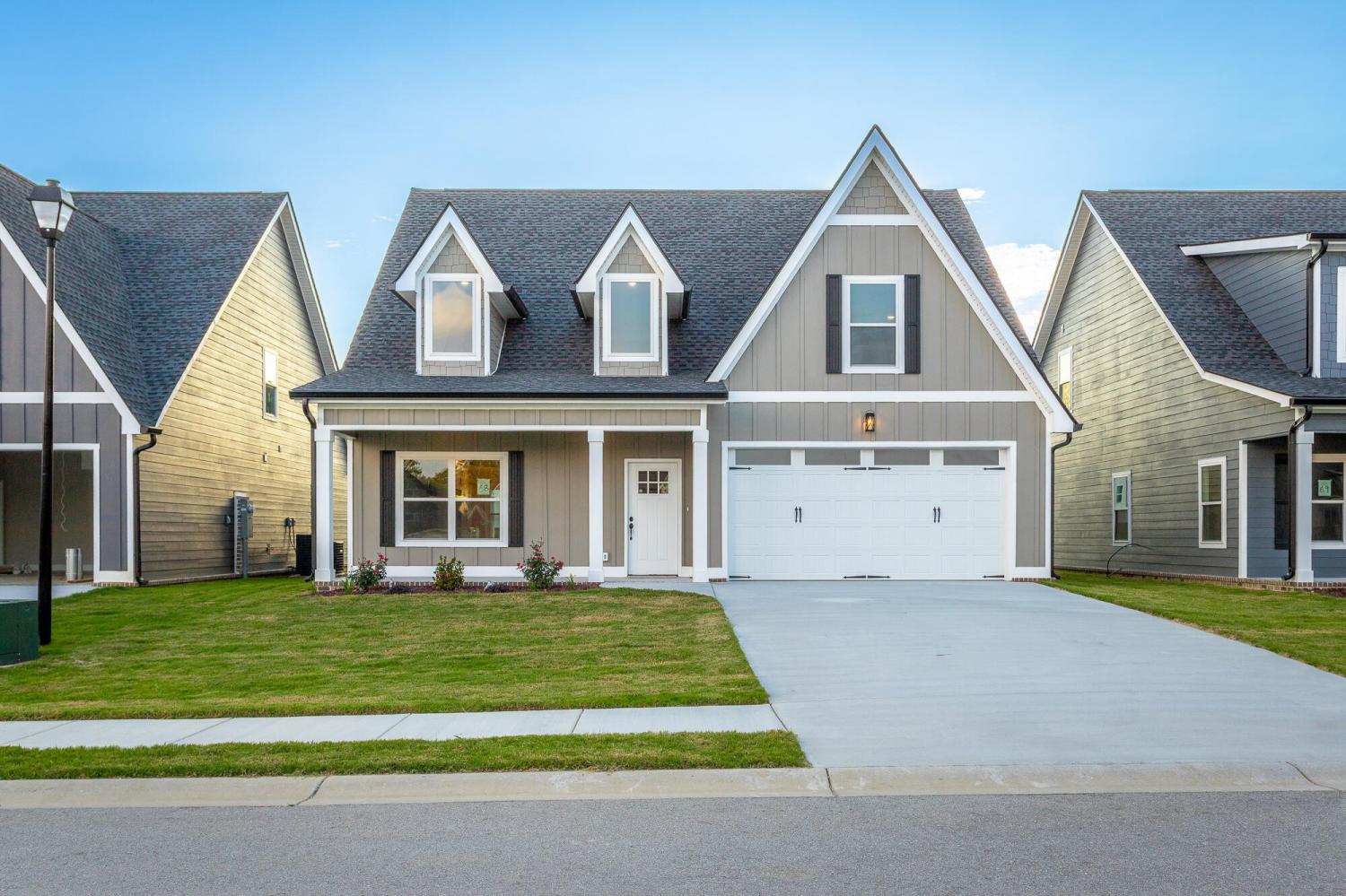 Welcome to The Grove, a convenient Ringgold neighborhood zoned for Heritage schools. This NEW 4 Bedroom, 3.5 Bath home, spanning just under 2,400 square feet, includes a builder's new home warranty for peace of mind. The exterior features low-maintenance fiber cement siding, brick on the foundation elevation, low-E vinyl windows, a zero-entry raised slab foundation, and a fully sodded, landscaped yard. This charming sidewalk-lined neighborhood has a swimming pool, community pond, and walking paths, and it's just 2.7 miles from I-75 at Battlefield Parkway—23 minutes to Dalton and 19 minutes to downtown Chattanooga. The Great Room (15'4'' x 20'10'') welcomes you with a vaulted ceiling, gas log fireplace with stone surround and wood beam mantel, and ''Wine Barrel'' SPC vinyl plank flooring—waterproof and scratch-resistant—flowing into the Kitchen and Dining Areas. The Kitchen includes an oversized island, stainless steel sink, quartz countertops, Whirlpool stainless appliances, soft-close cabinetry, double-door pantry, and stained v-groove ceiling. An adjacent Dining Area (14'5'' x 11') overlooks the covered back porch with views of the community pond. The main-level primary suite (14'2'' x 16'1'') offers a vaulted ceiling, barn door to an ensuite bath with an oversized tiled shower, 6-foot soaking tub, Delta fixtures, quartz countertops, and a walk-in closet connected to the Laundry Room (6'10' x 9'9''). Located on the back of the home, the primary suite also has windows with pond views. Upstairs, you'll find three bedrooms and two full baths. Bedroom 2 includes a full ensuite bath. Unlike other homes, this functional floor plan has generously sized closets and bedrooms. Enjoy picturesque sunsets over the community pond from your back porch, stroll the many walking paths around the community, or use the community swimming pool on hot summer days. Move-in ready, this home provides a practical, low-maintenance home with a thoughtfully designed, efficient floor plan.