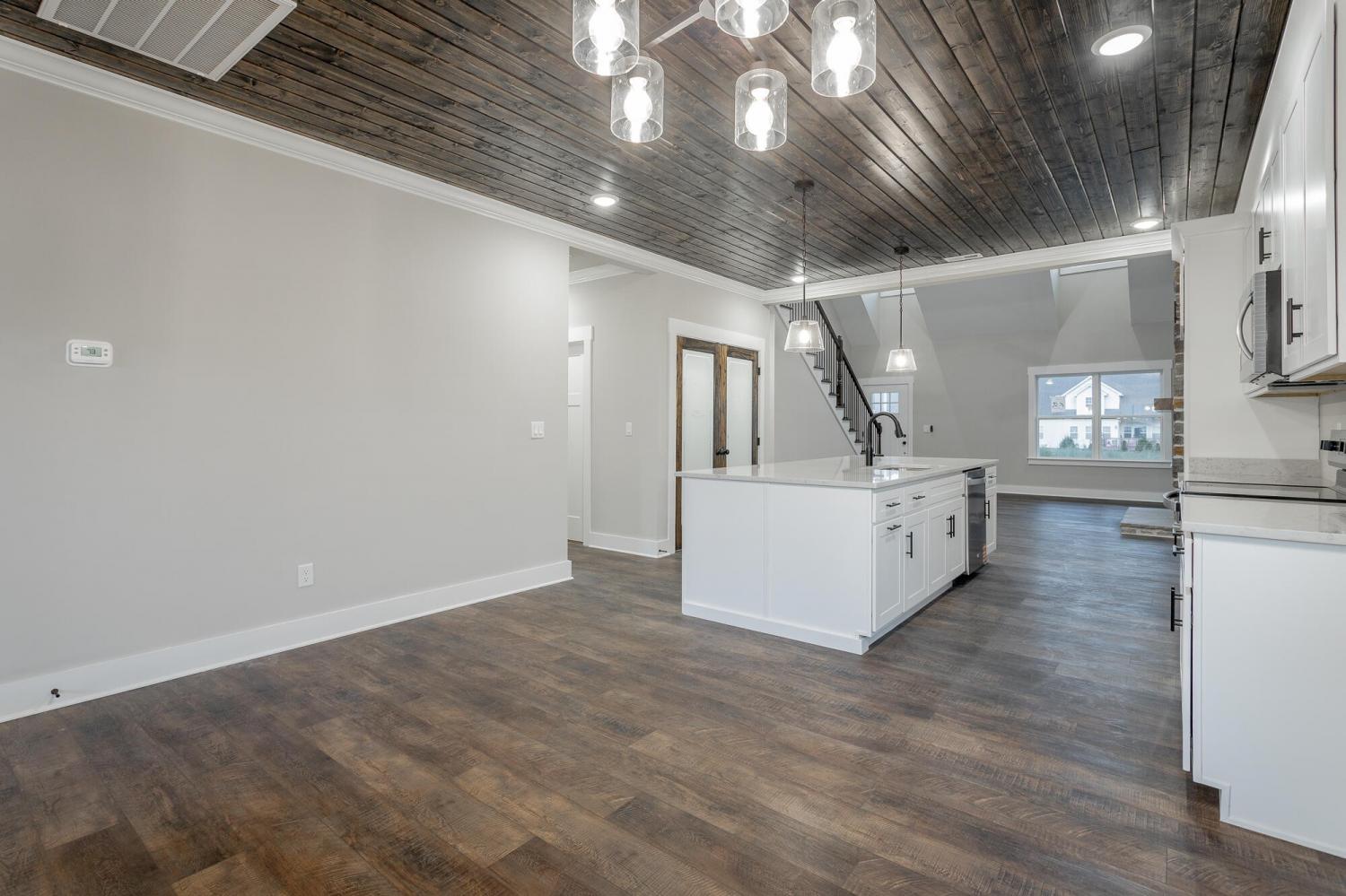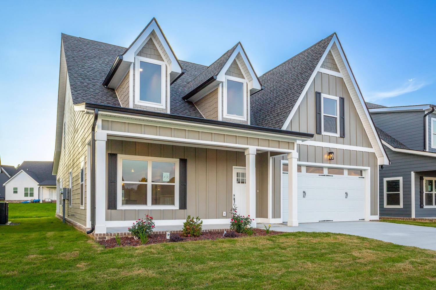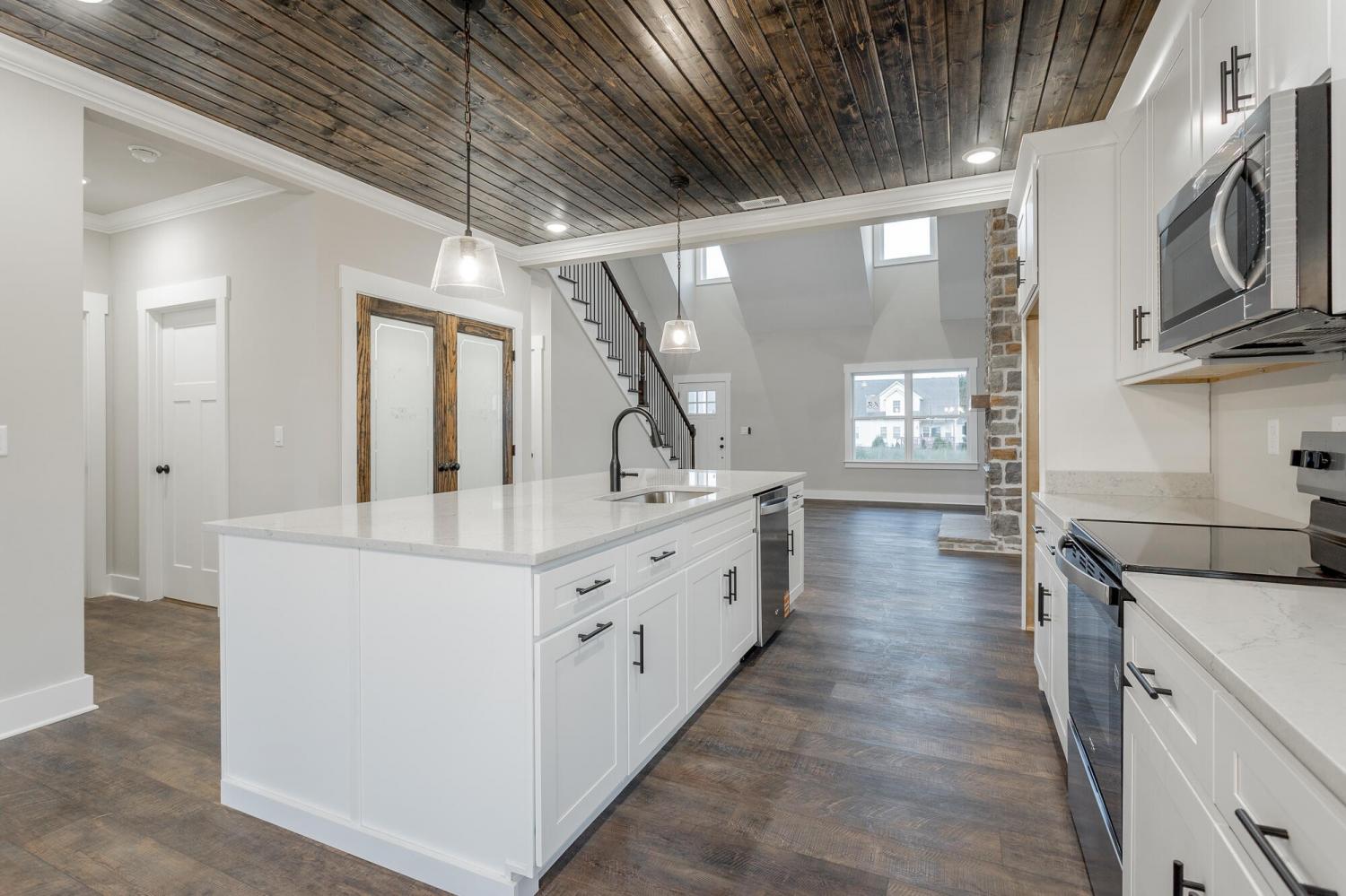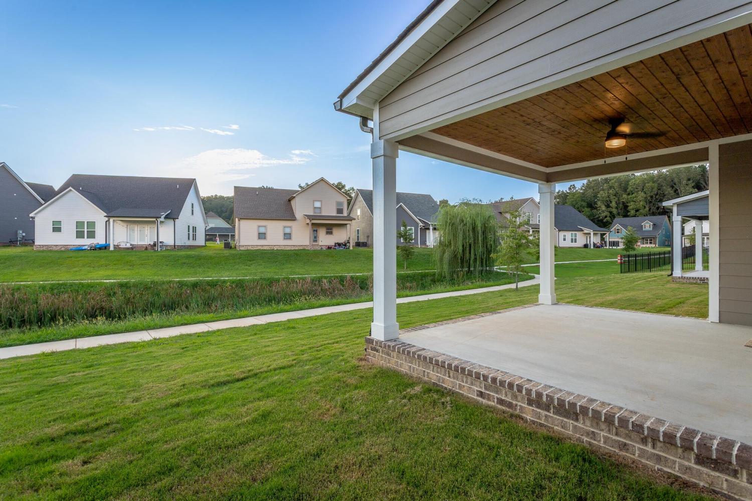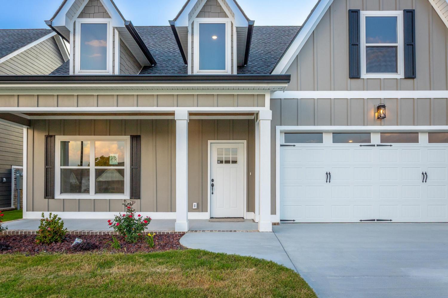 Welcome to The Grove, a convenient Ringgold neighborhood zoned for Heritage schools. This NEW 4 Bedroom, 3.5 Bath home, spanning just under 2,400 square feet, includes a builder's new home warranty for peace of mind. The exterior features low-maintenance fiber cement siding, brick on the foundation elevation, low-E vinyl windows, a zero-entry raised slab foundation, and a fully sodded, landscaped yard. This charming sidewalk-lined neighborhood has a swimming pool, community pond, and walking paths, and it's just 2.7 miles from I-75 at Battlefield Parkway—23 minutes to Dalton and 19 minutes to downtown Chattanooga. The Great Room (15'4'' x 20'10'') welcomes you with a vaulted ceiling, gas log fireplace with stone surround and wood beam mantel, and ''Wine Barrel'' SPC vinyl plank flooring—waterproof and scratch-resistant—flowing into the Kitchen and Dining Areas. The Kitchen includes an oversized island, stainless steel sink, quartz countertops, Whirlpool stainless appliances, soft-close cabinetry, double-door pantry, and stained v-groove ceiling. An adjacent Dining Area (14'5'' x 11') overlooks the covered back porch with views of the community pond. The main-level primary suite (14'2'' x 16'1'') offers a vaulted ceiling, barn door to an ensuite bath with an oversized tiled shower, 6-foot soaking tub, Delta fixtures, quartz countertops, and a walk-in closet connected to the Laundry Room (6'10' x 9'9''). Located on the back of the home, the primary suite also has windows with pond views. Upstairs, you'll find three bedrooms and two full baths. Bedroom 2 includes a full ensuite bath. Unlike other homes, this functional floor plan has generously sized closets and bedrooms. Enjoy picturesque sunsets over the community pond from your back porch, stroll the many walking paths around the community, or use the community swimming pool on hot summer days. Move-in ready, this home provides a practical, low-maintenance home with a thoughtfully designed, efficient floor plan.