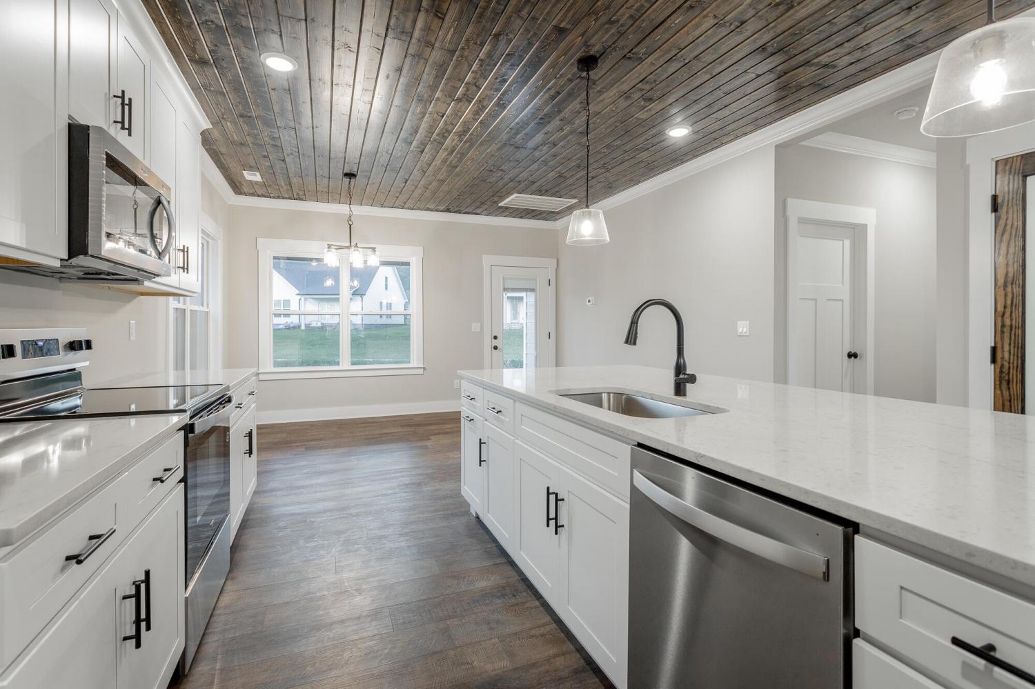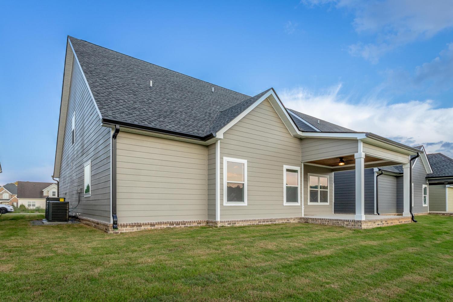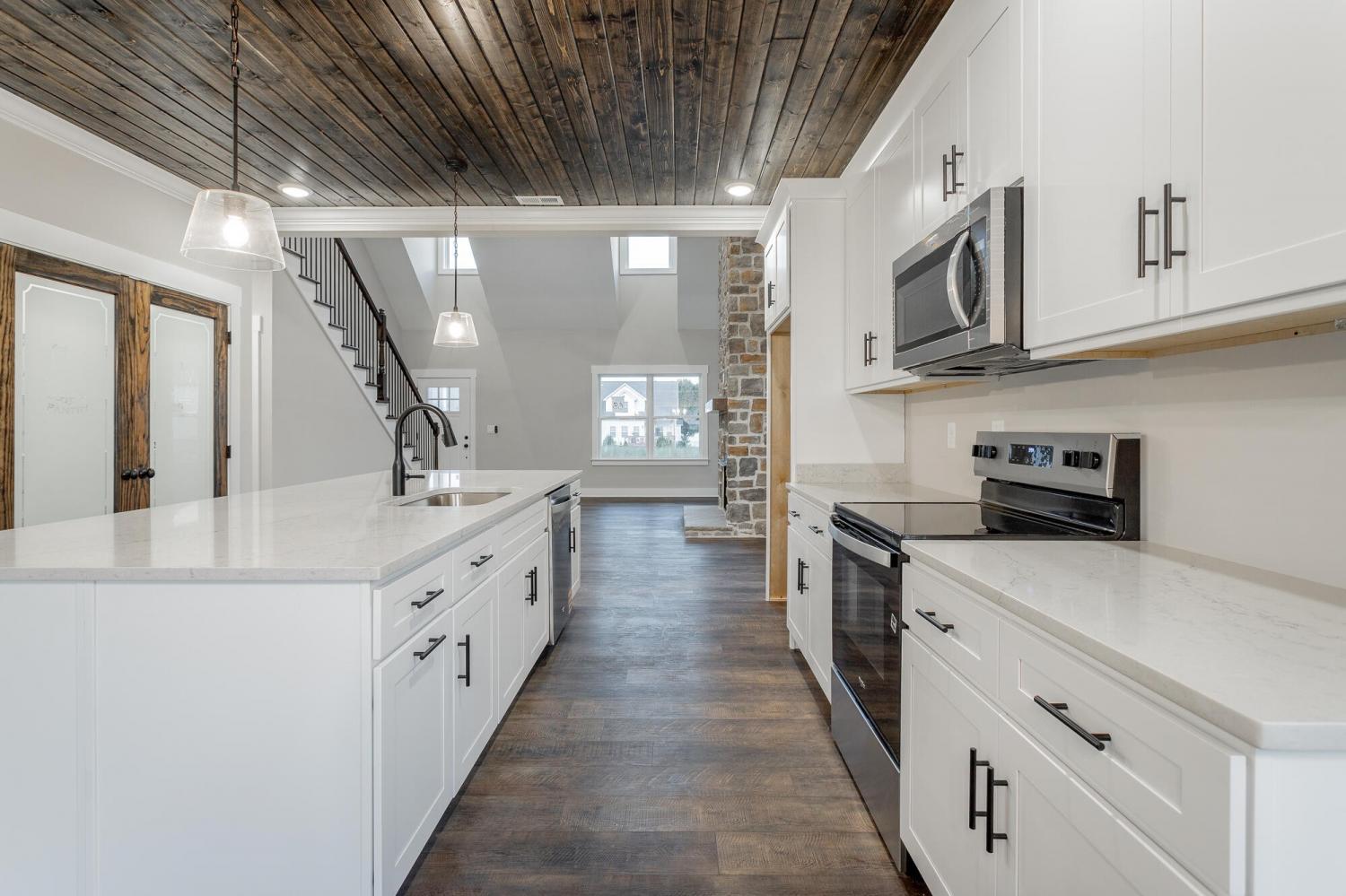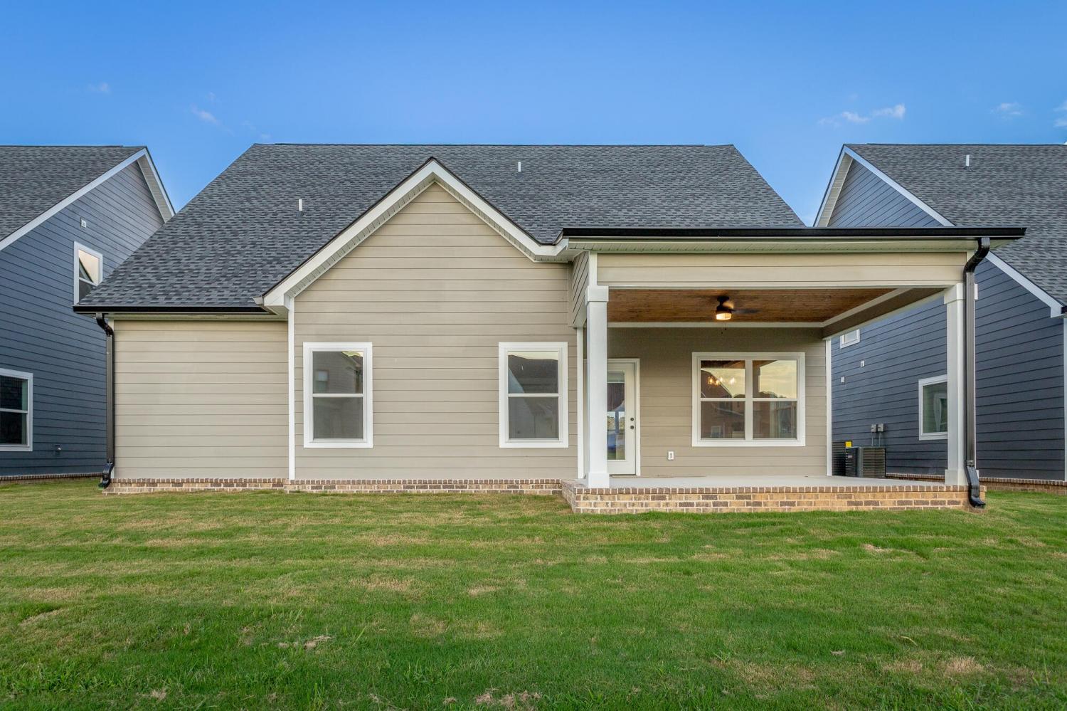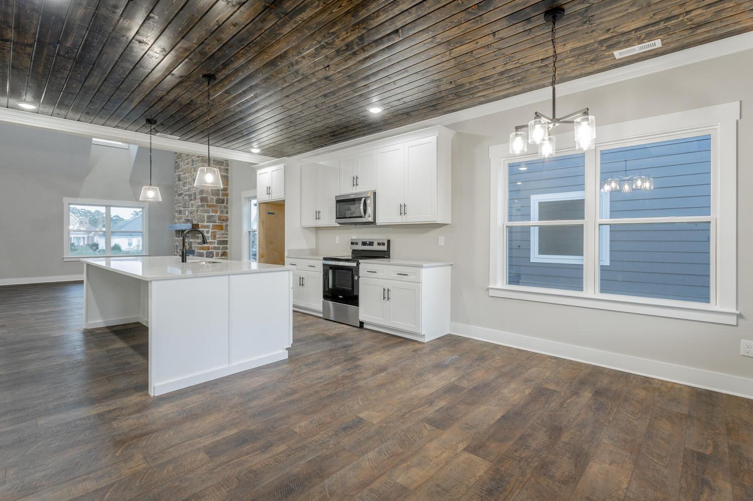 Welcome to The Grove, a convenient Ringgold neighborhood zoned for Heritage schools. This NEW 4 Bedroom, 3.5 Bath home, spanning just under 2,400 square feet, includes a builder's new home warranty for peace of mind. The exterior features low-maintenance fiber cement siding, brick on the foundation elevation, low-E vinyl windows, a zero-entry raised slab foundation, and a fully sodded, landscaped yard. This charming sidewalk-lined neighborhood has a swimming pool, community pond, and walking paths, and it's just 2.7 miles from I-75 at Battlefield Parkway—23 minutes to Dalton and 19 minutes to downtown Chattanooga. The Great Room (15'4'' x 20'10'') welcomes you with a vaulted ceiling, gas log fireplace with stone surround and wood beam mantel, and ''Wine Barrel'' SPC vinyl plank flooring—waterproof and scratch-resistant—flowing into the Kitchen and Dining Areas. The Kitchen includes an oversized island, stainless steel sink, quartz countertops, Whirlpool stainless appliances, soft-close cabinetry, double-door pantry, and stained v-groove ceiling. An adjacent Dining Area (14'5'' x 11') overlooks the covered back porch with views of the community pond. The main-level primary suite (14'2'' x 16'1'') offers a vaulted ceiling, barn door to an ensuite bath with an oversized tiled shower, 6-foot soaking tub, Delta fixtures, quartz countertops, and a walk-in closet connected to the Laundry Room (6'10' x 9'9''). Located on the back of the home, the primary suite also has windows with pond views. Upstairs, you'll find three bedrooms and two full baths. Bedroom 2 includes a full ensuite bath. Unlike other homes, this functional floor plan has generously sized closets and bedrooms. Enjoy picturesque sunsets over the community pond from your back porch, stroll the many walking paths around the community, or use the community swimming pool on hot summer days. Move-in ready, this home provides a practical, low-maintenance home with a thoughtfully designed, efficient floor plan.