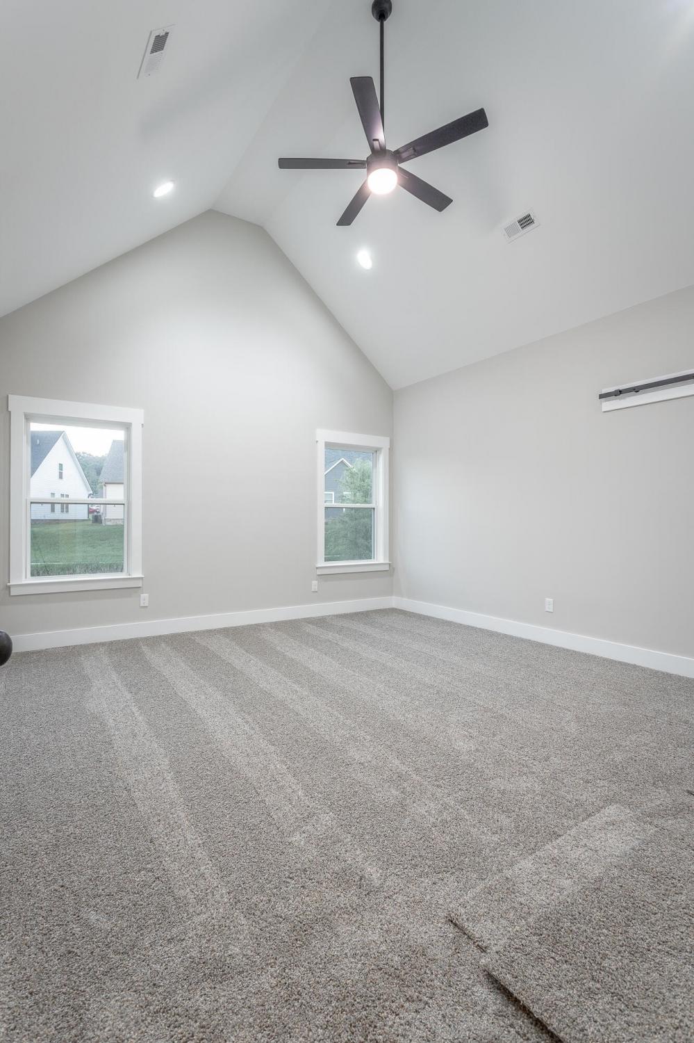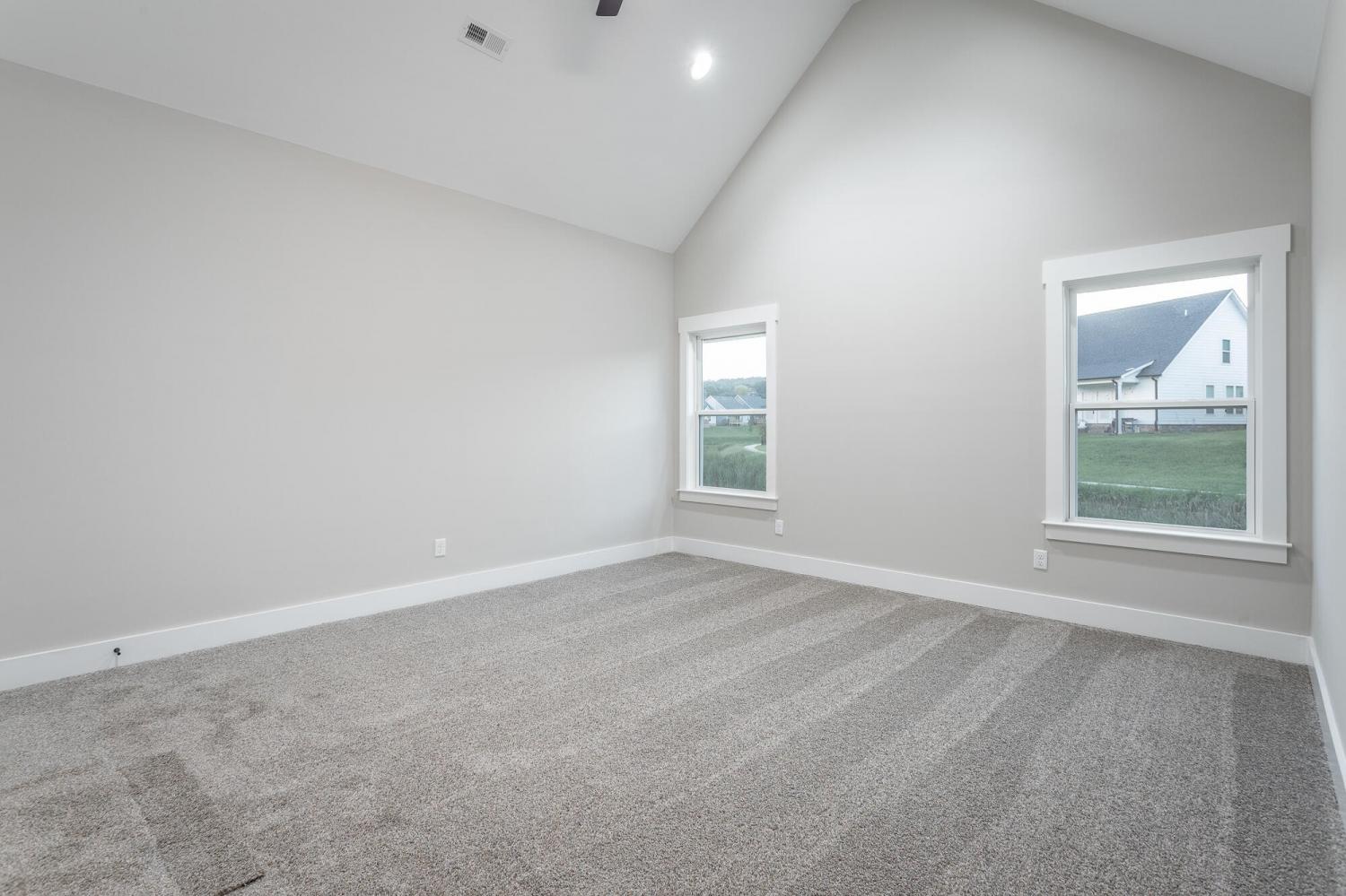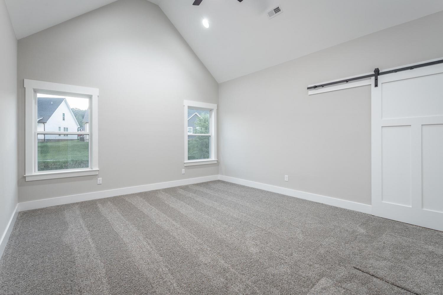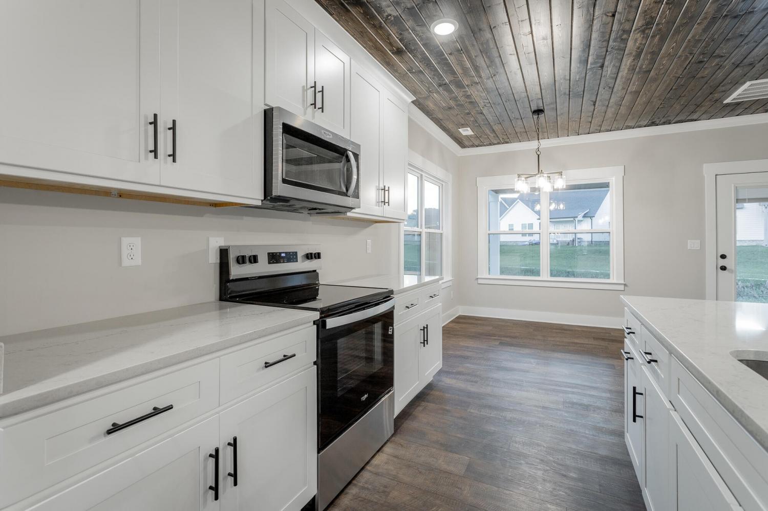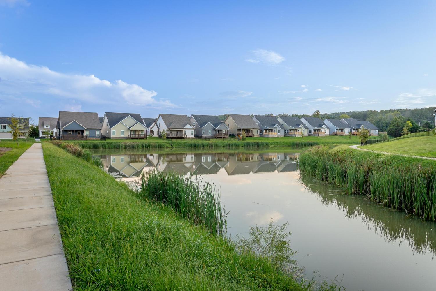 Welcome to The Grove, a convenient Ringgold neighborhood zoned for Heritage schools. This NEW 4 Bedroom, 3.5 Bath home, spanning just under 2,400 square feet, includes a builder's new home warranty for peace of mind. The exterior features low-maintenance fiber cement siding, brick on the foundation elevation, low-E vinyl windows, a zero-entry raised slab foundation, and a fully sodded, landscaped yard. This charming sidewalk-lined neighborhood has a swimming pool, community pond, and walking paths, and it's just 2.7 miles from I-75 at Battlefield Parkway—23 minutes to Dalton and 19 minutes to downtown Chattanooga. The Great Room (15'4'' x 20'10'') welcomes you with a vaulted ceiling, gas log fireplace with stone surround and wood beam mantel, and ''Wine Barrel'' SPC vinyl plank flooring—waterproof and scratch-resistant—flowing into the Kitchen and Dining Areas. The Kitchen includes an oversized island, stainless steel sink, quartz countertops, Whirlpool stainless appliances, soft-close cabinetry, double-door pantry, and stained v-groove ceiling. An adjacent Dining Area (14'5'' x 11') overlooks the covered back porch with views of the community pond. The main-level primary suite (14'2'' x 16'1'') offers a vaulted ceiling, barn door to an ensuite bath with an oversized tiled shower, 6-foot soaking tub, Delta fixtures, quartz countertops, and a walk-in closet connected to the Laundry Room (6'10' x 9'9''). Located on the back of the home, the primary suite also has windows with pond views. Upstairs, you'll find three bedrooms and two full baths. Bedroom 2 includes a full ensuite bath. Unlike other homes, this functional floor plan has generously sized closets and bedrooms. Enjoy picturesque sunsets over the community pond from your back porch, stroll the many walking paths around the community, or use the community swimming pool on hot summer days. Move-in ready, this home provides a practical, low-maintenance home with a thoughtfully designed, efficient floor plan.
