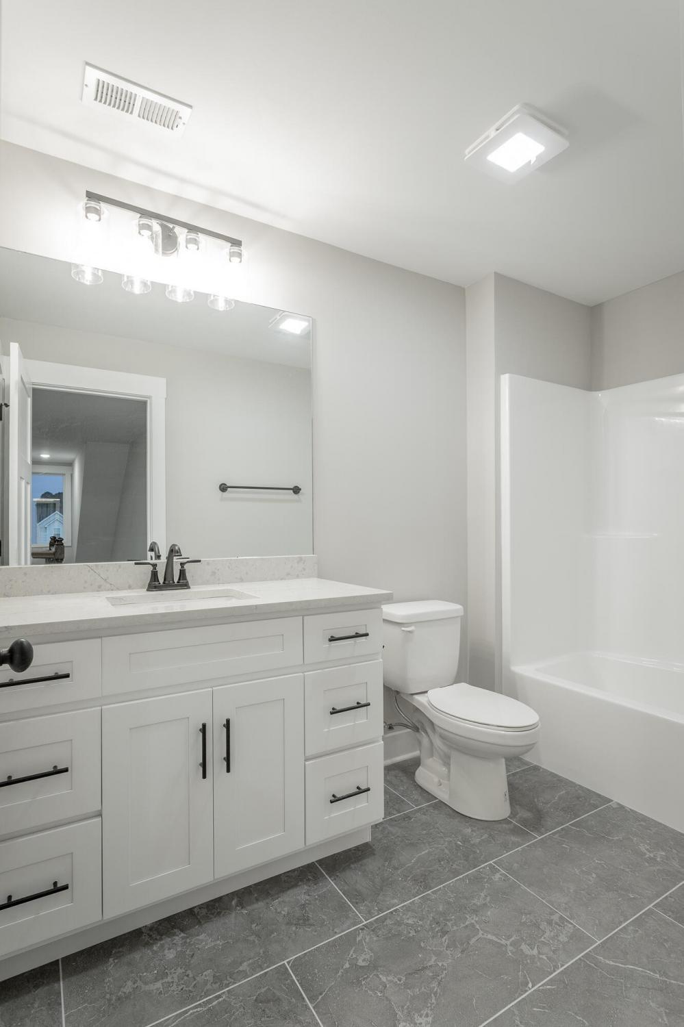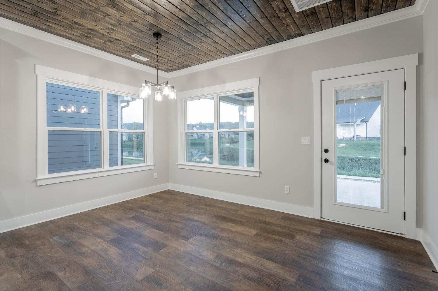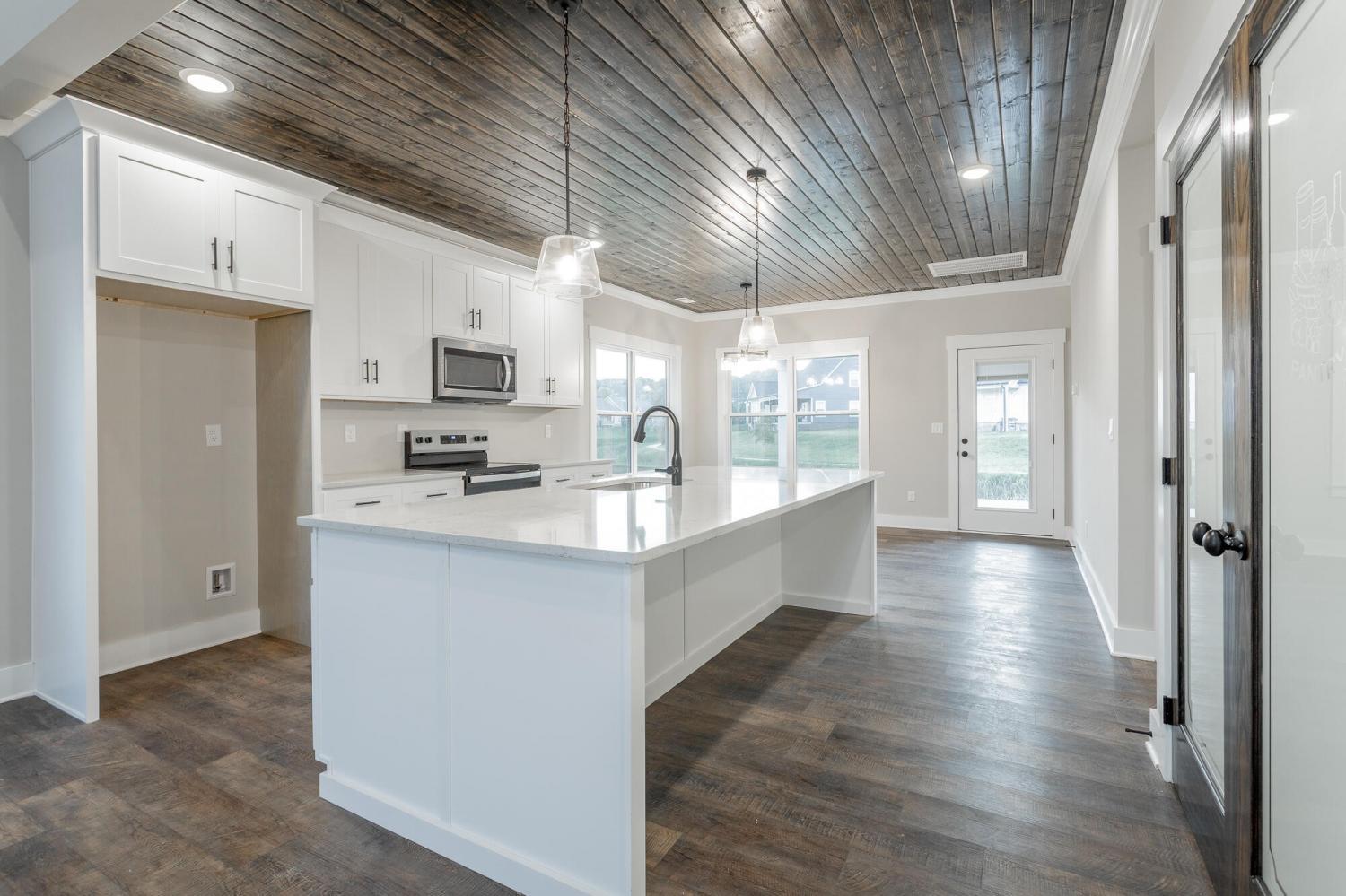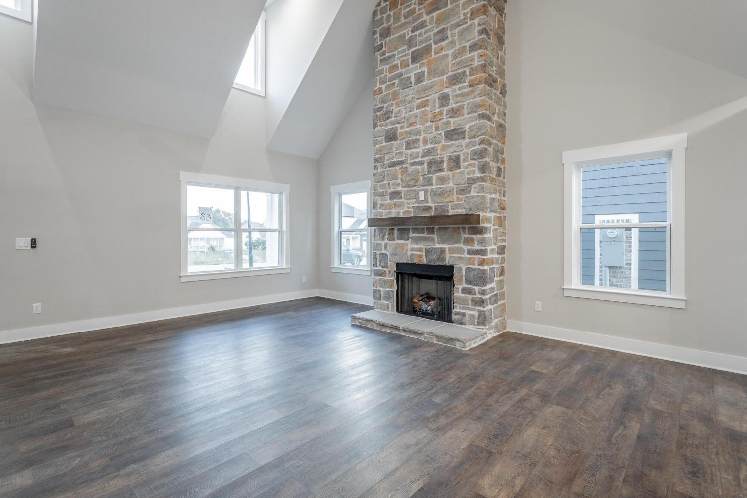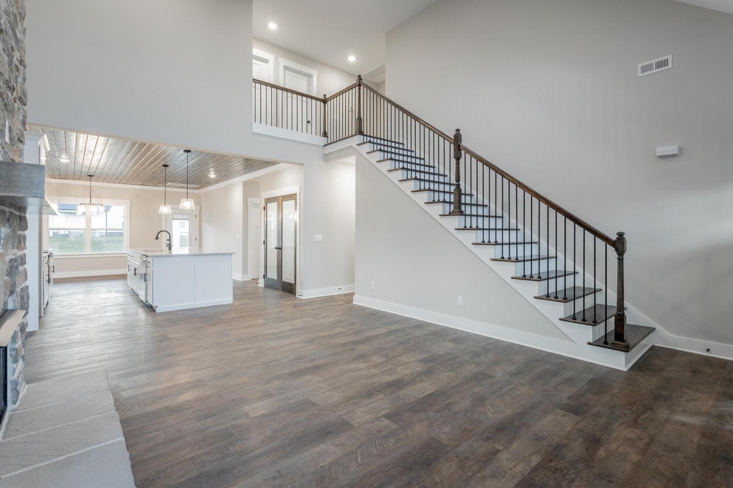 Welcome to The Grove, a convenient Ringgold neighborhood zoned for Heritage schools. This NEW 4 Bedroom, 3.5 Bath home, spanning just under 2,400 square feet, includes a builder's new home warranty for peace of mind. The exterior features low-maintenance fiber cement siding, brick on the foundation elevation, low-E vinyl windows, a zero-entry raised slab foundation, and a fully sodded, landscaped yard. This charming sidewalk-lined neighborhood has a swimming pool, community pond, and walking paths, and it's just 2.7 miles from I-75 at Battlefield Parkway—23 minutes to Dalton and 19 minutes to downtown Chattanooga. The Great Room (15'4'' x 20'10'') welcomes you with a vaulted ceiling, gas log fireplace with stone surround and wood beam mantel, and ''Wine Barrel'' SPC vinyl plank flooring—waterproof and scratch-resistant—flowing into the Kitchen and Dining Areas. The Kitchen includes an oversized island, stainless steel sink, quartz countertops, Whirlpool stainless appliances, soft-close cabinetry, double-door pantry, and stained v-groove ceiling. An adjacent Dining Area (14'5'' x 11') overlooks the covered back porch with views of the community pond. The main-level primary suite (14'2'' x 16'1'') offers a vaulted ceiling, barn door to an ensuite bath with an oversized tiled shower, 6-foot soaking tub, Delta fixtures, quartz countertops, and a walk-in closet connected to the Laundry Room (6'10' x 9'9''). Located on the back of the home, the primary suite also has windows with pond views. Upstairs, you'll find three bedrooms and two full baths. Bedroom 2 includes a full ensuite bath. Unlike other homes, this functional floor plan has generously sized closets and bedrooms. Enjoy picturesque sunsets over the community pond from your back porch, stroll the many walking paths around the community, or use the community swimming pool on hot summer days. Move-in ready, this home provides a practical, low-maintenance home with a thoughtfully designed, efficient floor plan.