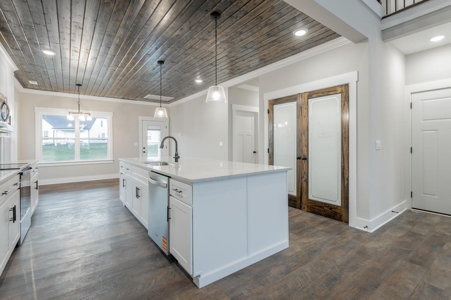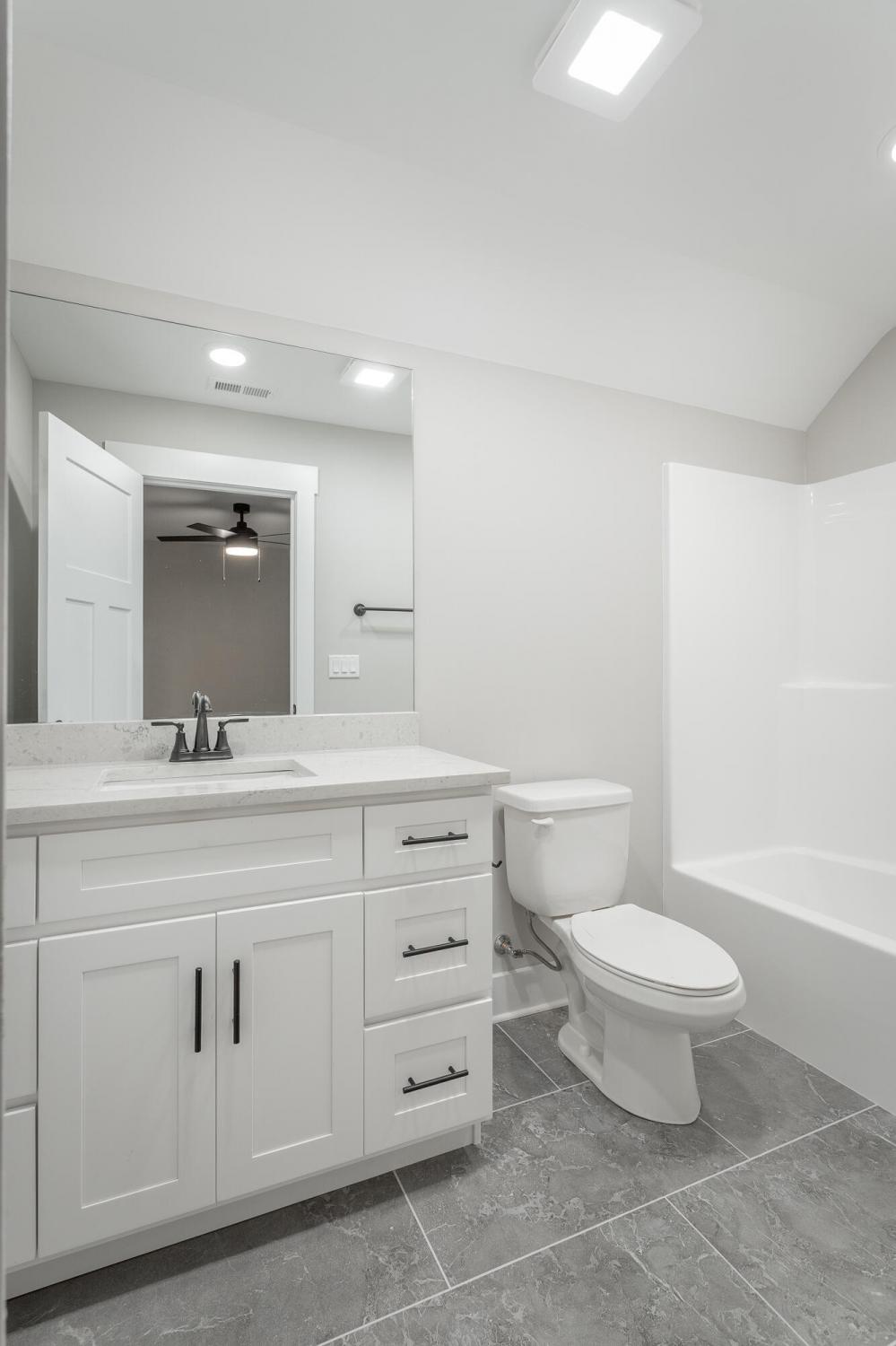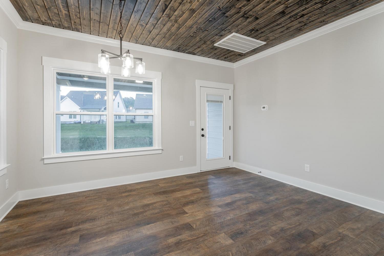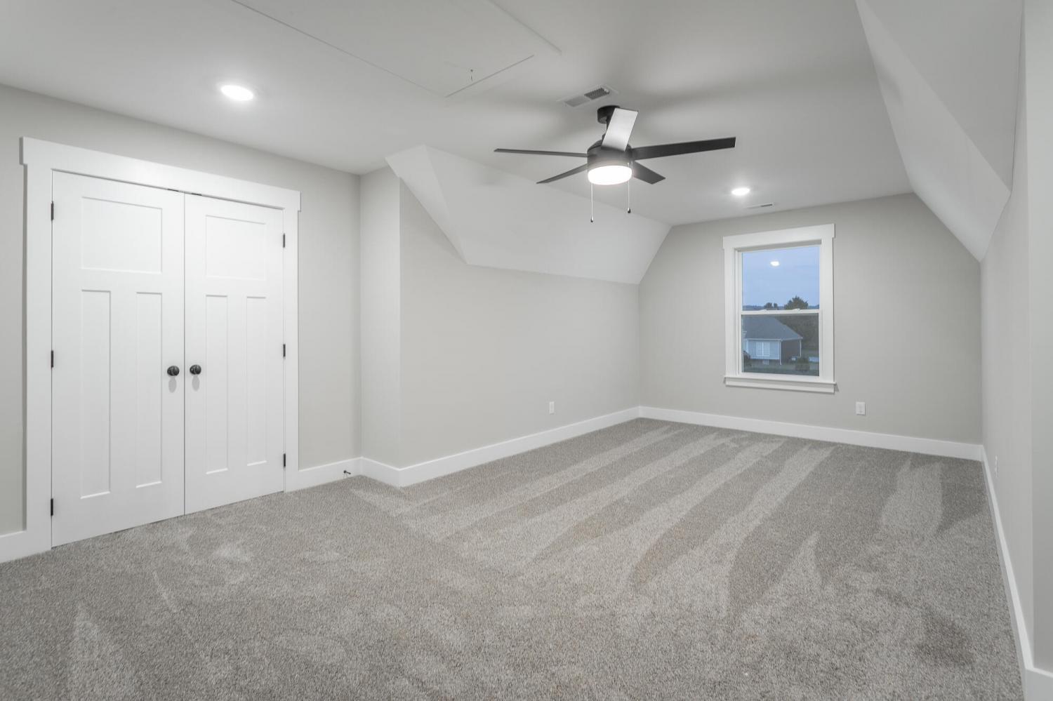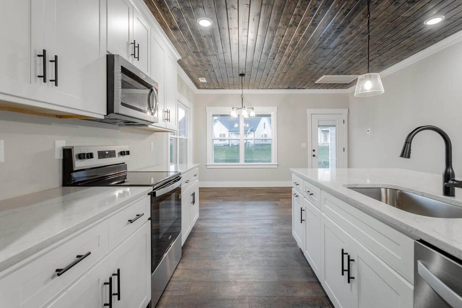 Welcome to The Grove, a convenient Ringgold neighborhood zoned for Heritage schools. This NEW 4 Bedroom, 3.5 Bath home, spanning just under 2,400 square feet, includes a builder's new home warranty for peace of mind. The exterior features low-maintenance fiber cement siding, brick on the foundation elevation, low-E vinyl windows, a zero-entry raised slab foundation, and a fully sodded, landscaped yard. This charming sidewalk-lined neighborhood has a swimming pool, community pond, and walking paths, and it's just 2.7 miles from I-75 at Battlefield Parkway—23 minutes to Dalton and 19 minutes to downtown Chattanooga. The Great Room (15'4'' x 20'10'') welcomes you with a vaulted ceiling, gas log fireplace with stone surround and wood beam mantel, and ''Wine Barrel'' SPC vinyl plank flooring—waterproof and scratch-resistant—flowing into the Kitchen and Dining Areas. The Kitchen includes an oversized island, stainless steel sink, quartz countertops, Whirlpool stainless appliances, soft-close cabinetry, double-door pantry, and stained v-groove ceiling. An adjacent Dining Area (14'5'' x 11') overlooks the covered back porch with views of the community pond. The main-level primary suite (14'2'' x 16'1'') offers a vaulted ceiling, barn door to an ensuite bath with an oversized tiled shower, 6-foot soaking tub, Delta fixtures, quartz countertops, and a walk-in closet connected to the Laundry Room (6'10' x 9'9''). Located on the back of the home, the primary suite also has windows with pond views. Upstairs, you'll find three bedrooms and two full baths. Bedroom 2 includes a full ensuite bath. Unlike other homes, this functional floor plan has generously sized closets and bedrooms. Enjoy picturesque sunsets over the community pond from your back porch, stroll the many walking paths around the community, or use the community swimming pool on hot summer days. Move-in ready, this home provides a practical, low-maintenance home with a thoughtfully designed, efficient floor plan.