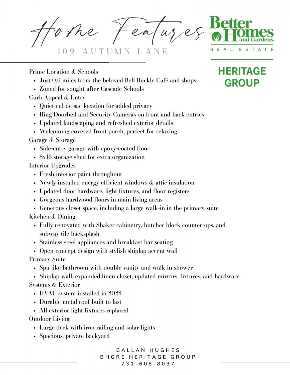 Welcome to 109 Autumn Ln in the heart of charming Bell Buckle, TN! Nestled on a quiet cul-de-sac just 0.4 miles from downtown and minutes from The Webb School, this beautifully renovated 3 bed, 2 bath home combines comfort, efficiency, and style. The open-concept kitchen features shaker cabinetry, butcher block counters, stainless steel appliances, a chic tile backsplash, and bar seating, while both bathrooms have been fully updated with spa-like finishes. Energy-efficient windows and a newly insulated attic add year-round savings, and hardwood floors flow through the main living area with plush carpet in each bedroom. Step outside to a massive deck overlooking the private, fully fenced backyard—complete with a storage shed and fresh landscaping. Move-in ready and full of charm, this home is the perfect blend of modern living and small-town appeal!