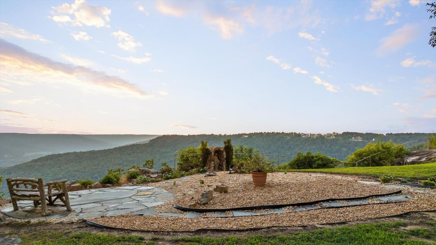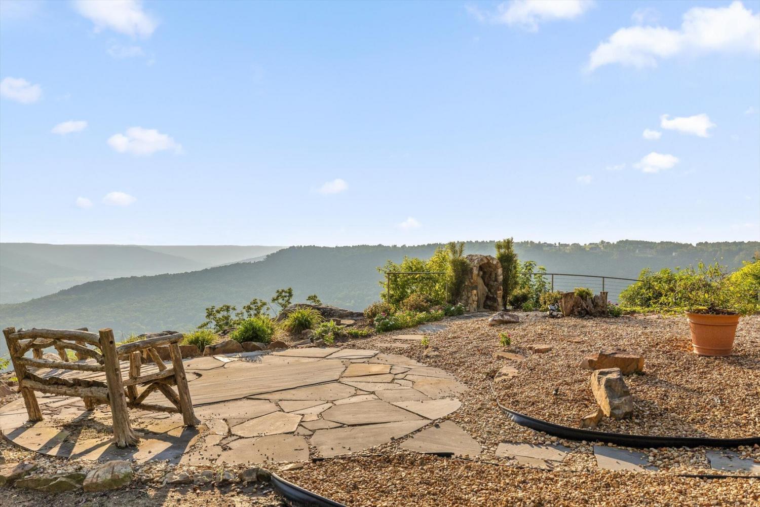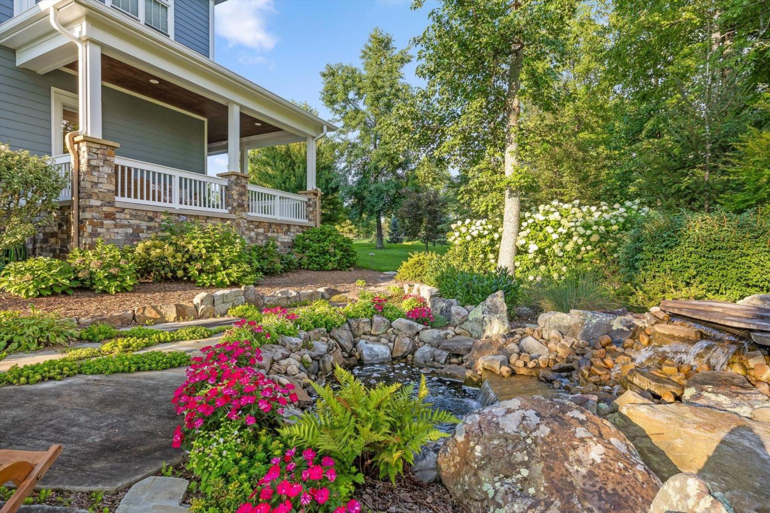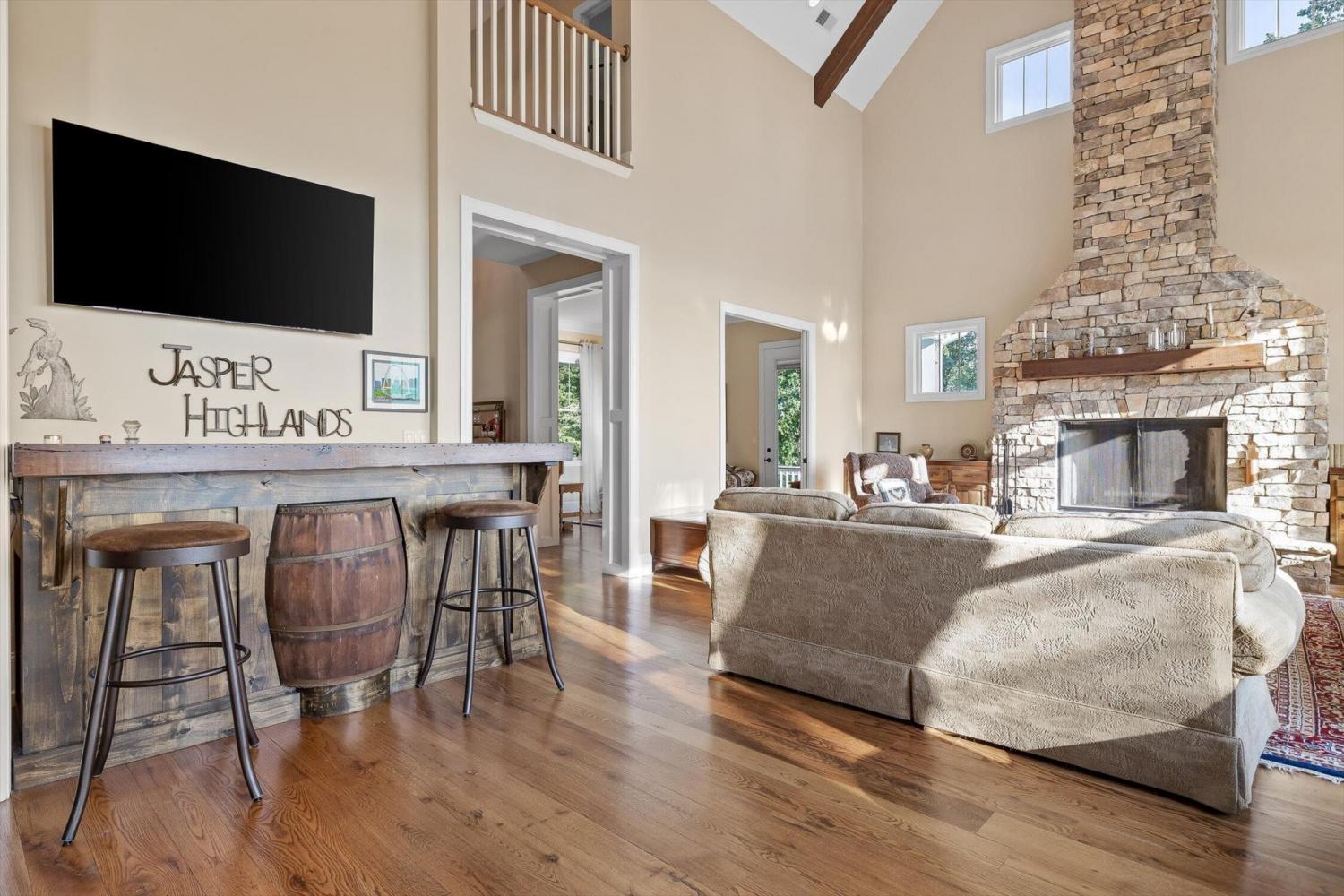 Nestled atop a bluff in the highly sought-after Jasper Highlands community, this stunning estate offers nearly 5.3 acres of pristinely landscaped grounds adorned with flowering gardens, dogwood, crabapple, and redbud trees, and a peaceful waterfall. A spacious patio overlooks the sweeping bluff views, providing the perfect setting to enjoy both sunrise and sunset, each more breathtaking than the last. The exterior blends craftsman and modern farmhouse charm, with soft blue siding, crisp white trim, and natural stone accents. Expansive windows along the back of the home capture the views and flood the interiors with natural light, while a walkout patio and shaded dining area create an inviting space for outdoor living. Step inside and you are greeted by a dramatic foyer that opens into a grand living room, where a floor-to-ceiling stone fireplace anchors the space. Rows of windows frame the panoramic scenery, connecting the interior to the remarkable outdoors. Just off the living room, the piano room provides a touch of elegance, while the dedicated dining room creates a warm and welcoming place for gatherings. The gourmet kitchen features a large island, walk-in pantry, and a breakfast nook that flows seamlessly into the sunroom—an ideal spot to relax while soaking in the views year-round. A bar area off the living room adds to the entertaining appeal. Multiple offices, including one on the main level and another in the finished basement, make working from home both private and convenient. The second floor opens to a spacious family room and balcony area overlooking the living room below. The primary suite is a true retreat, offering a luxurious spa-inspired bath with a double walk-in shower, an oversized soaking tub, and a vanity area designed for comfort and style. The large walk-in closet includes custom built-in shelving and organization, making storage both functional and elegant.