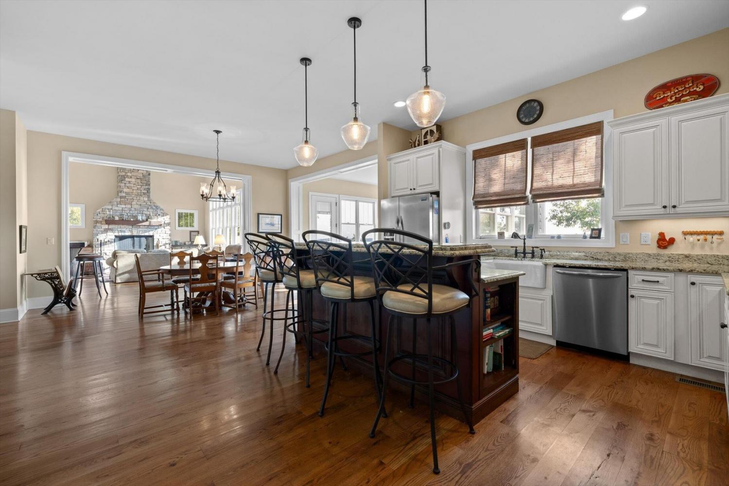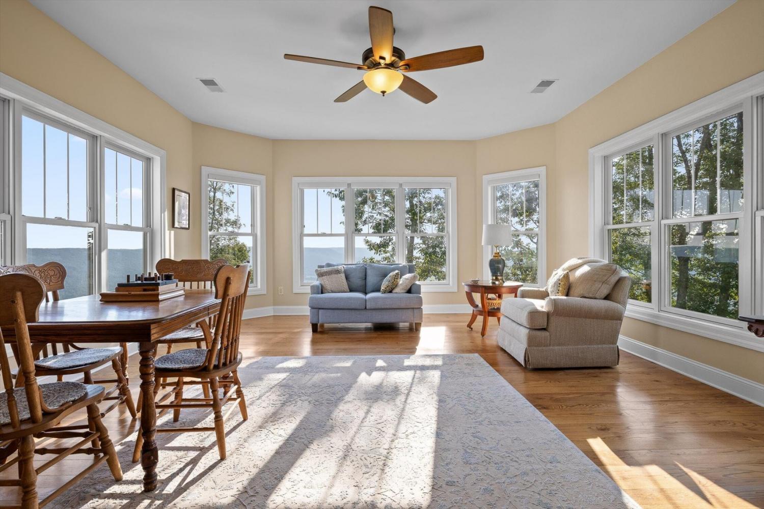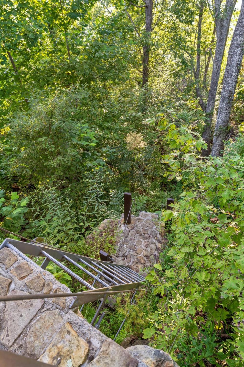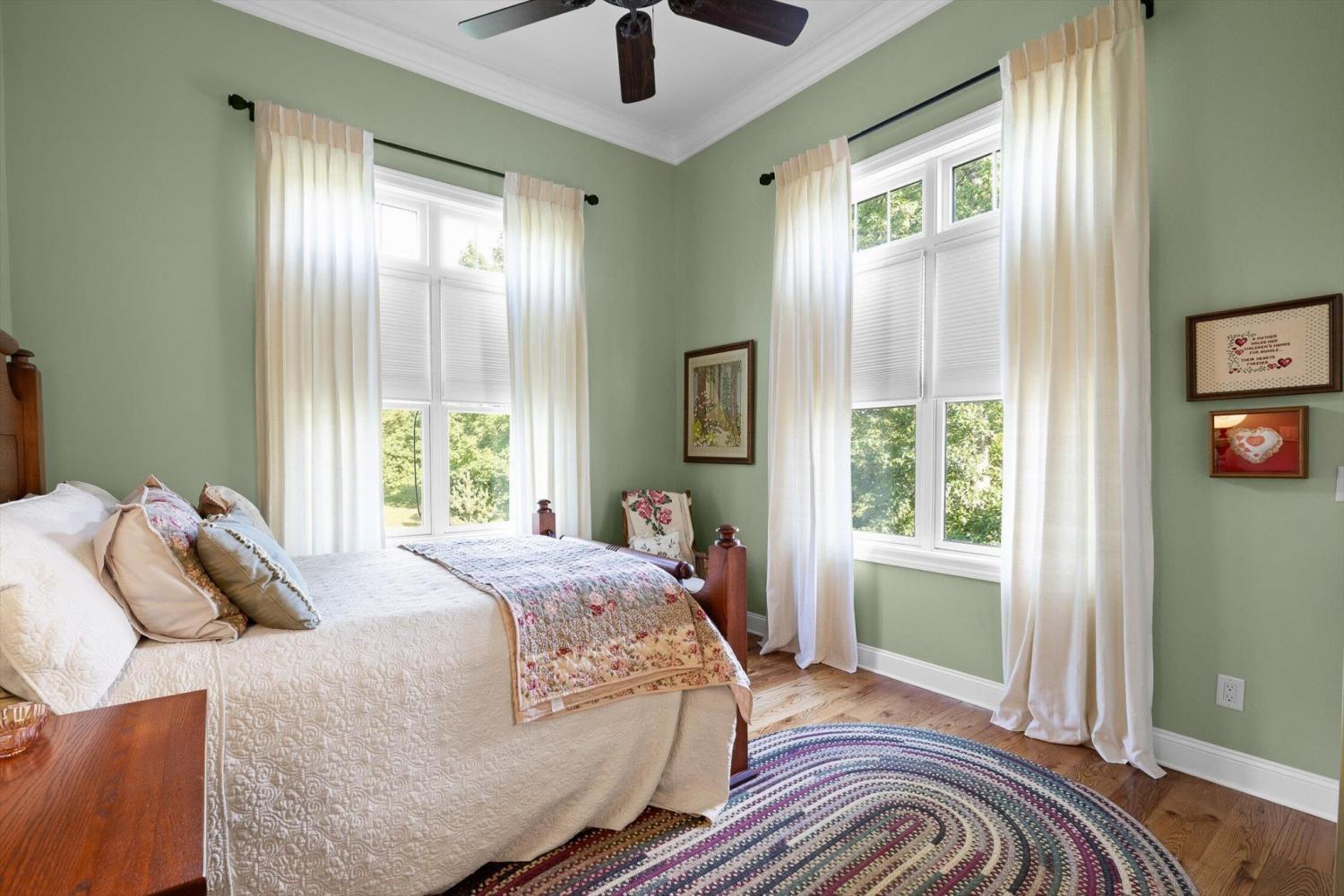 Nestled atop a bluff in the highly sought-after Jasper Highlands community, this stunning estate offers nearly 5.3 acres of pristinely landscaped grounds adorned with flowering gardens, dogwood, crabapple, and redbud trees, and a peaceful waterfall. A spacious patio overlooks the sweeping bluff views, providing the perfect setting to enjoy both sunrise and sunset, each more breathtaking than the last. The exterior blends craftsman and modern farmhouse charm, with soft blue siding, crisp white trim, and natural stone accents. Expansive windows along the back of the home capture the views and flood the interiors with natural light, while a walkout patio and shaded dining area create an inviting space for outdoor living. Step inside and you are greeted by a dramatic foyer that opens into a grand living room, where a floor-to-ceiling stone fireplace anchors the space. Rows of windows frame the panoramic scenery, connecting the interior to the remarkable outdoors. Just off the living room, the piano room provides a touch of elegance, while the dedicated dining room creates a warm and welcoming place for gatherings. The gourmet kitchen features a large island, walk-in pantry, and a breakfast nook that flows seamlessly into the sunroom—an ideal spot to relax while soaking in the views year-round. A bar area off the living room adds to the entertaining appeal. Multiple offices, including one on the main level and another in the finished basement, make working from home both private and convenient. The second floor opens to a spacious family room and balcony area overlooking the living room below. The primary suite is a true retreat, offering a luxurious spa-inspired bath with a double walk-in shower, an oversized soaking tub, and a vanity area designed for comfort and style. The large walk-in closet includes custom built-in shelving and organization, making storage both functional and elegant.