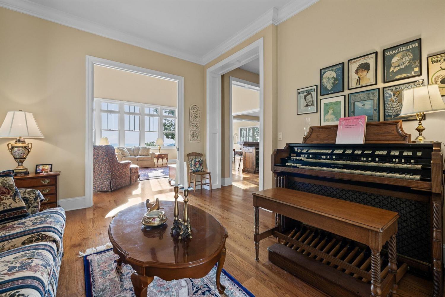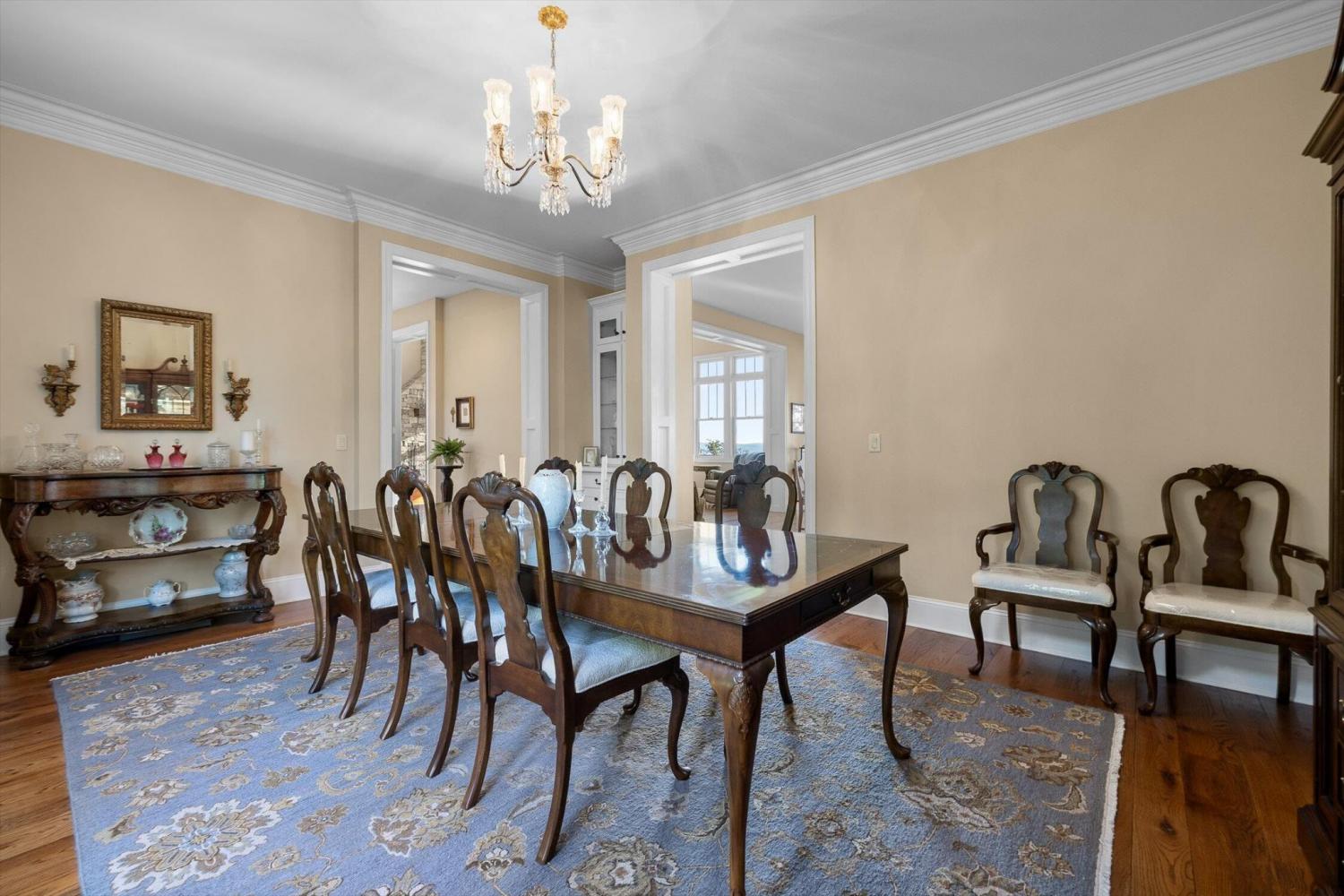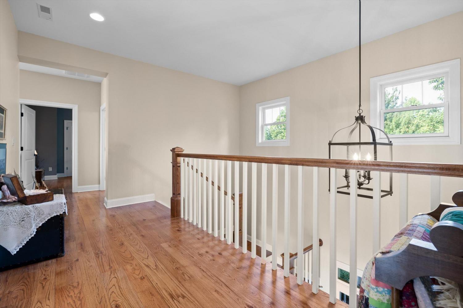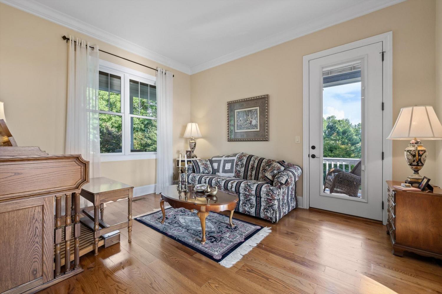 Nestled atop a bluff in the highly sought-after Jasper Highlands community, this stunning estate offers nearly 5.3 acres of pristinely landscaped grounds adorned with flowering gardens, dogwood, crabapple, and redbud trees, and a peaceful waterfall. A spacious patio overlooks the sweeping bluff views, providing the perfect setting to enjoy both sunrise and sunset, each more breathtaking than the last. The exterior blends craftsman and modern farmhouse charm, with soft blue siding, crisp white trim, and natural stone accents. Expansive windows along the back of the home capture the views and flood the interiors with natural light, while a walkout patio and shaded dining area create an inviting space for outdoor living. Step inside and you are greeted by a dramatic foyer that opens into a grand living room, where a floor-to-ceiling stone fireplace anchors the space. Rows of windows frame the panoramic scenery, connecting the interior to the remarkable outdoors. Just off the living room, the piano room provides a touch of elegance, while the dedicated dining room creates a warm and welcoming place for gatherings. The gourmet kitchen features a large island, walk-in pantry, and a breakfast nook that flows seamlessly into the sunroom—an ideal spot to relax while soaking in the views year-round. A bar area off the living room adds to the entertaining appeal. Multiple offices, including one on the main level and another in the finished basement, make working from home both private and convenient. The second floor opens to a spacious family room and balcony area overlooking the living room below. The primary suite is a true retreat, offering a luxurious spa-inspired bath with a double walk-in shower, an oversized soaking tub, and a vanity area designed for comfort and style. The large walk-in closet includes custom built-in shelving and organization, making storage both functional and elegant.