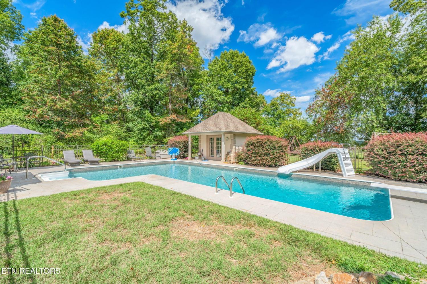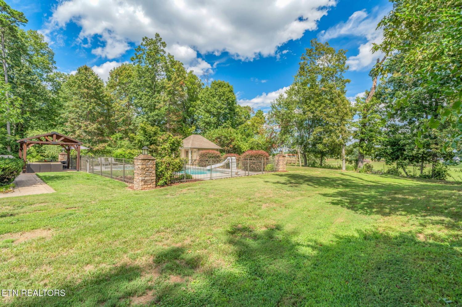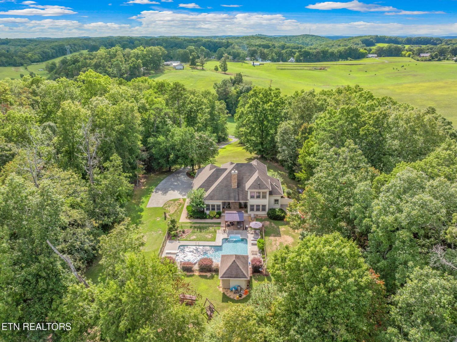 AMAZING HOME WITH NEARLY 6 ACRES OF PRIVACY!! FIRST TIME ON MARKET! Custom built home in immaculate condition with an open floor plan, master on the main, hickory hardwood floors throughout except in the baths and theatre room. Kitchen features a cathedral ceiling, archways, custom cherry cabinetry, corian counters, Samsung stainless appliances convey, new disposal, butler's pantry, desk area, island, breakfast area overlooking the pool, formal dining area with trey ceiling and columns, Samsung stainless appliances convey, owner is using electric but natural gas is available, living area is open to all the main level and upstairs, features a stackstone wood burning fireplace but owner is currently using a gas insert, living area has tinted windows on the front and back and exits to the large covered patio that you can enjoy year round. From the patio is more concrete with a recent gazebo added for more outdoor living space. Wrought iron fencing with brick columns featuring lighting, surrounds the true L shaped inground pool with a large walk in shallow area and owners added a foot deeper in the end with the slide and diving board. Pool house is finished nicely, features crown molding, fresh paint, a half bath and plenty of storage area. It also has a door opening to the rear with the pump out of sight and no noise while you enjoy the pool. The pooll has been updated with a new salt system, motor, light, a borderless liner and a new cover. Back inside the living area is completely open and great for entertaining and the host will never be secluded in the kitchen. Also on the main level you will find a large office with french doors (could be used for a nursery or a bonus room if needed) Master is on the main and also walks out to the covered patio, large master bath with dbl vanities with granite, plantation shutters, walk in closet, jacuzzi tub, a large (recently renovated) walk in tile shower.