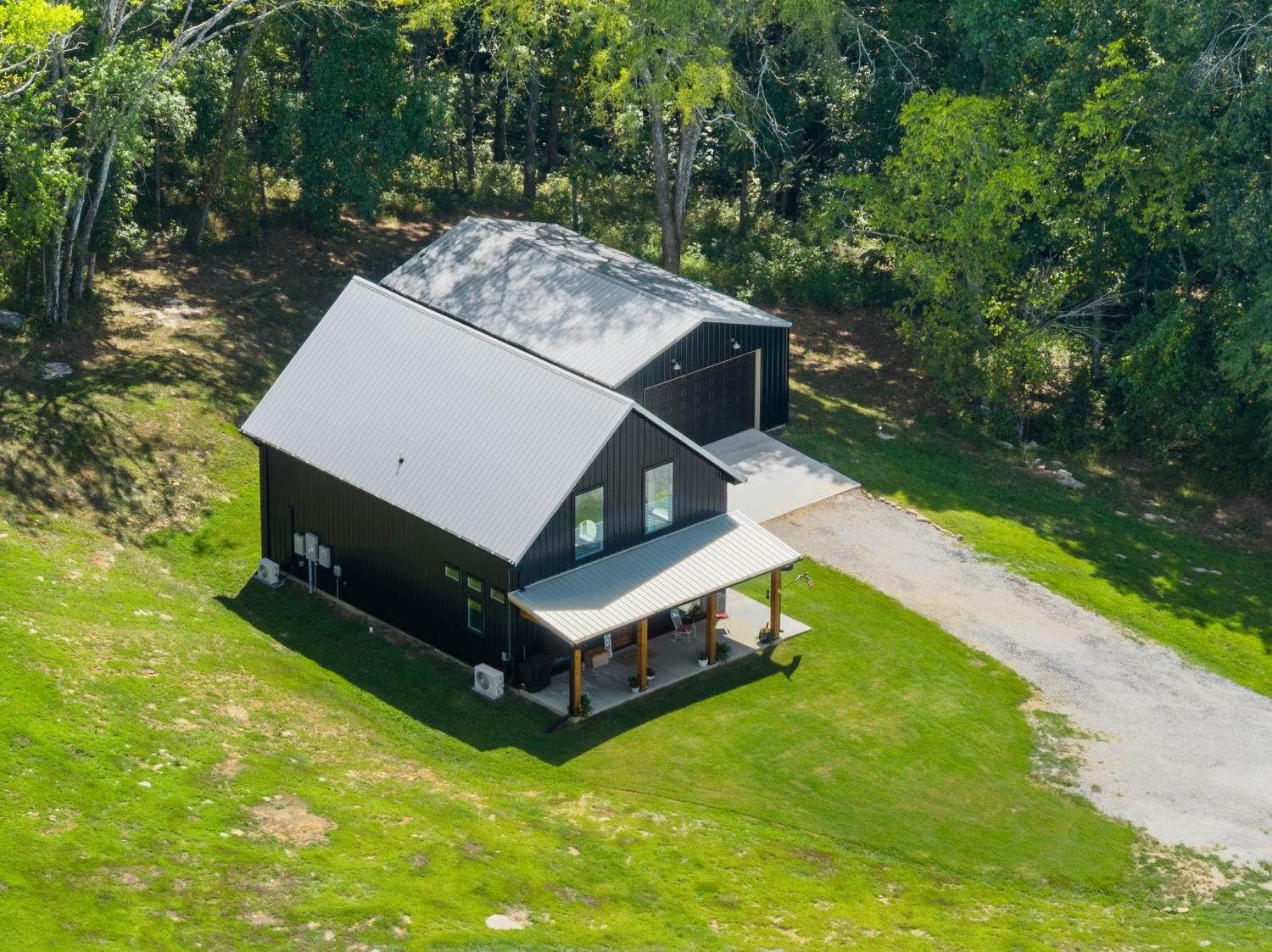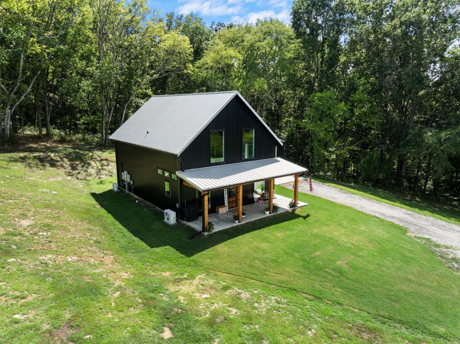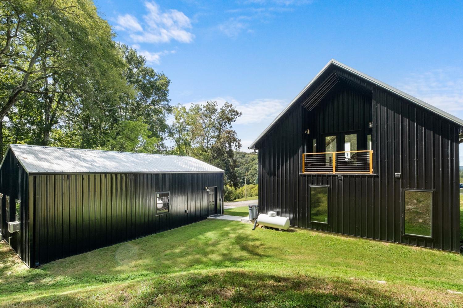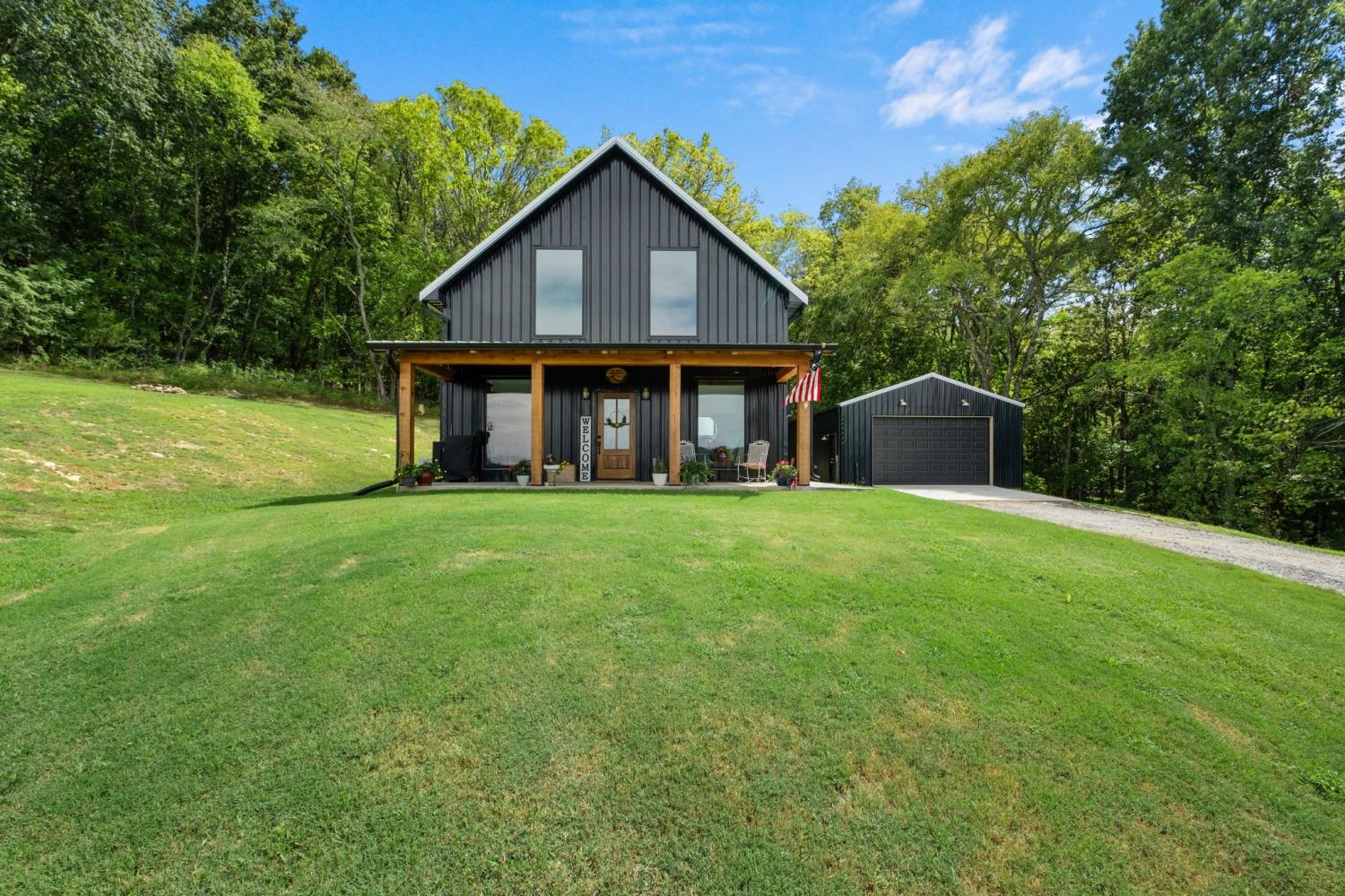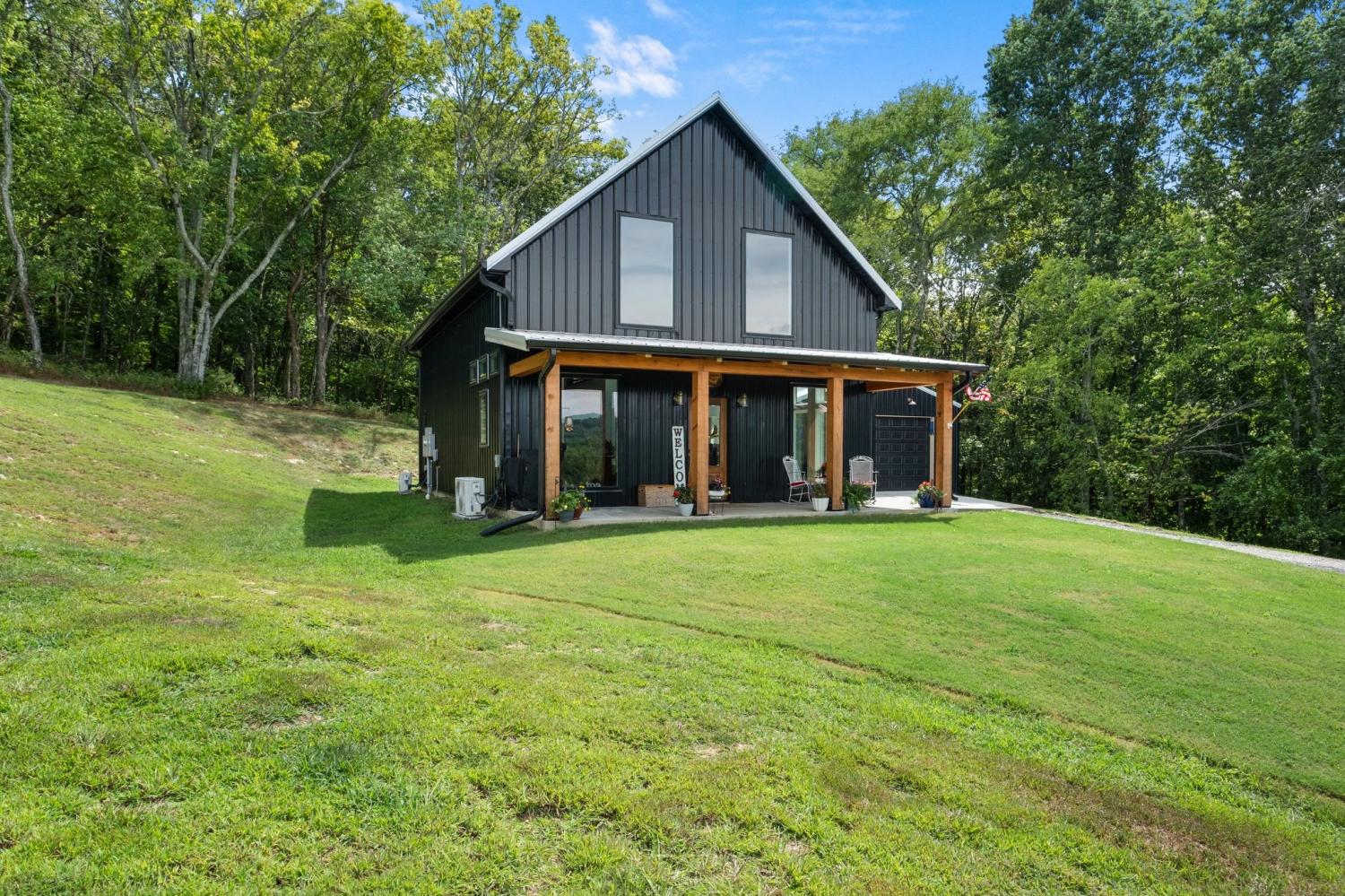 Barndominium Beauty! This newly built stunning home combines rustic charm with modern luxury, offering high-end finishes throughout. Step inside to soaring tongue and groove ceilings, an open-concept floor plan, and designer touches at every turn. The gourmet kitchen features custom cabinetry, upgraded appliances, and a spacious island made of leathered Marble, perfect for entertaining and cooking. The microwave also air fries, the oven is convection and air fryer, the cooktop is induction, and the freezer boasts craft ice. Relax in the serene primary suite with a spa-inspired bath, or enjoy gatherings in the expansive living area filled with natural light and amazing views from inside, or on the second floor balcony. Durable construction meets elegant style, creating a one-of-a-kind property that’s both functional and breathtaking. The serene land is nearly 14 acres of woods with a natural spring, deer and turkey. The detached 2 car garage offers finished space as well as room for all your toys or vehicles and a RV plug. At the base of the parcel there is room to build a shop or park recreational vehicles. Underground electric service means no wires to obstruct your view from the timber framed front porch.On demand propane powered water heater. True country luxury living, and just 45 minutes to Nashville. Bring your rocking chairs for the best porch sitting you can imagine!