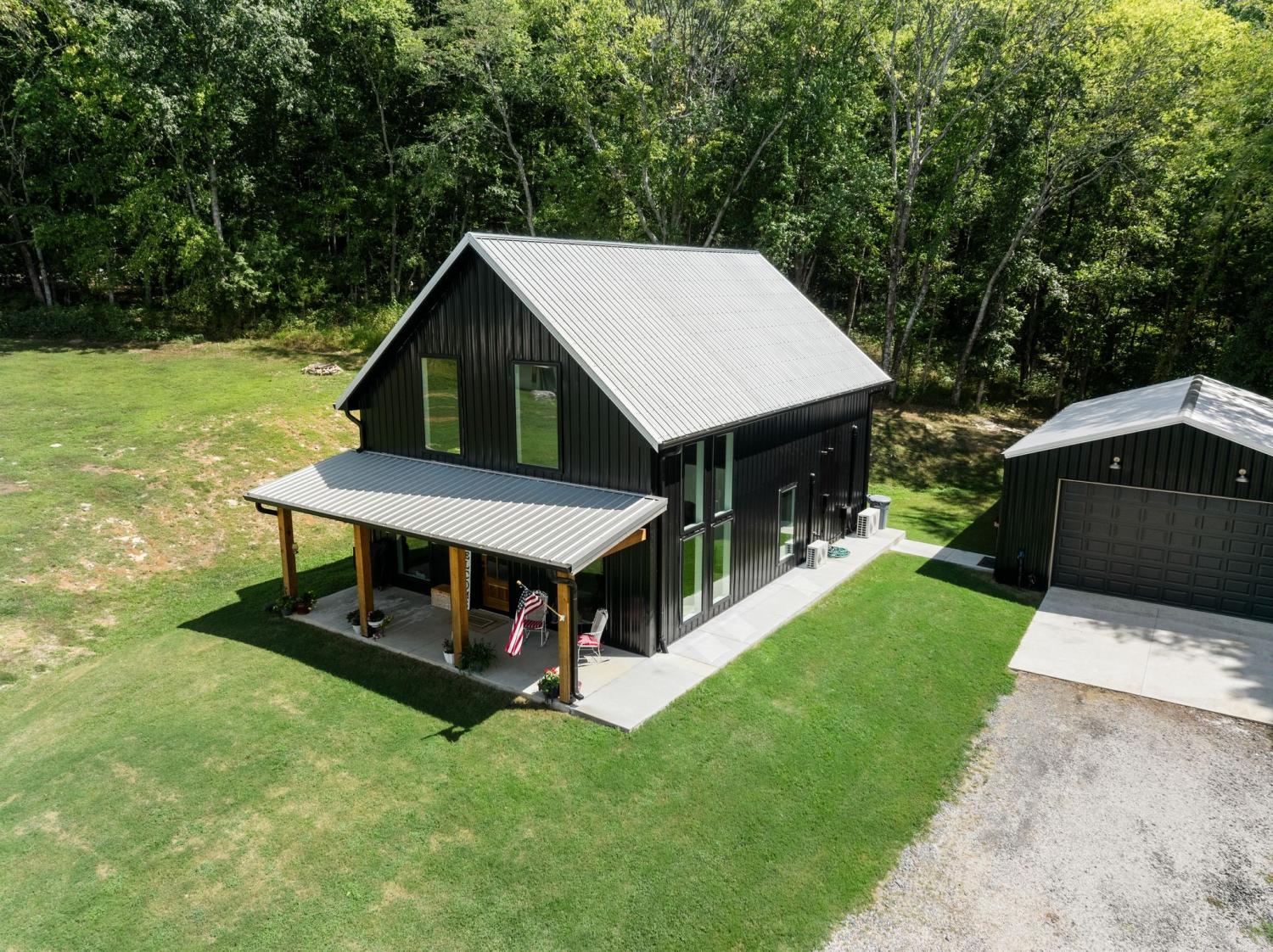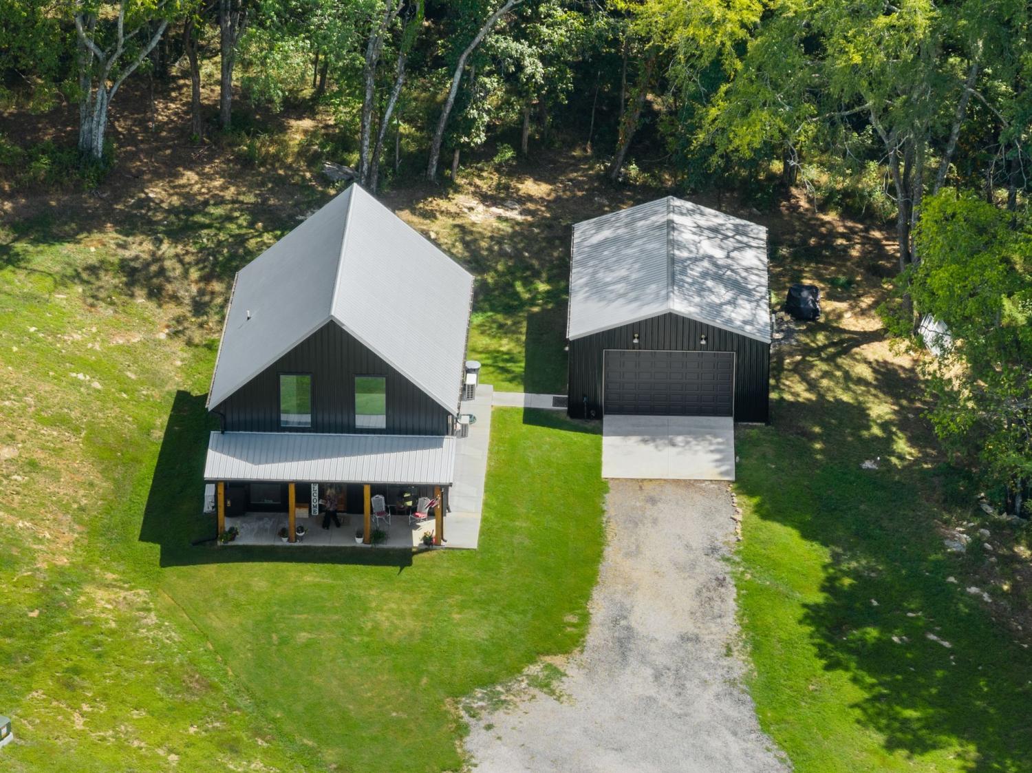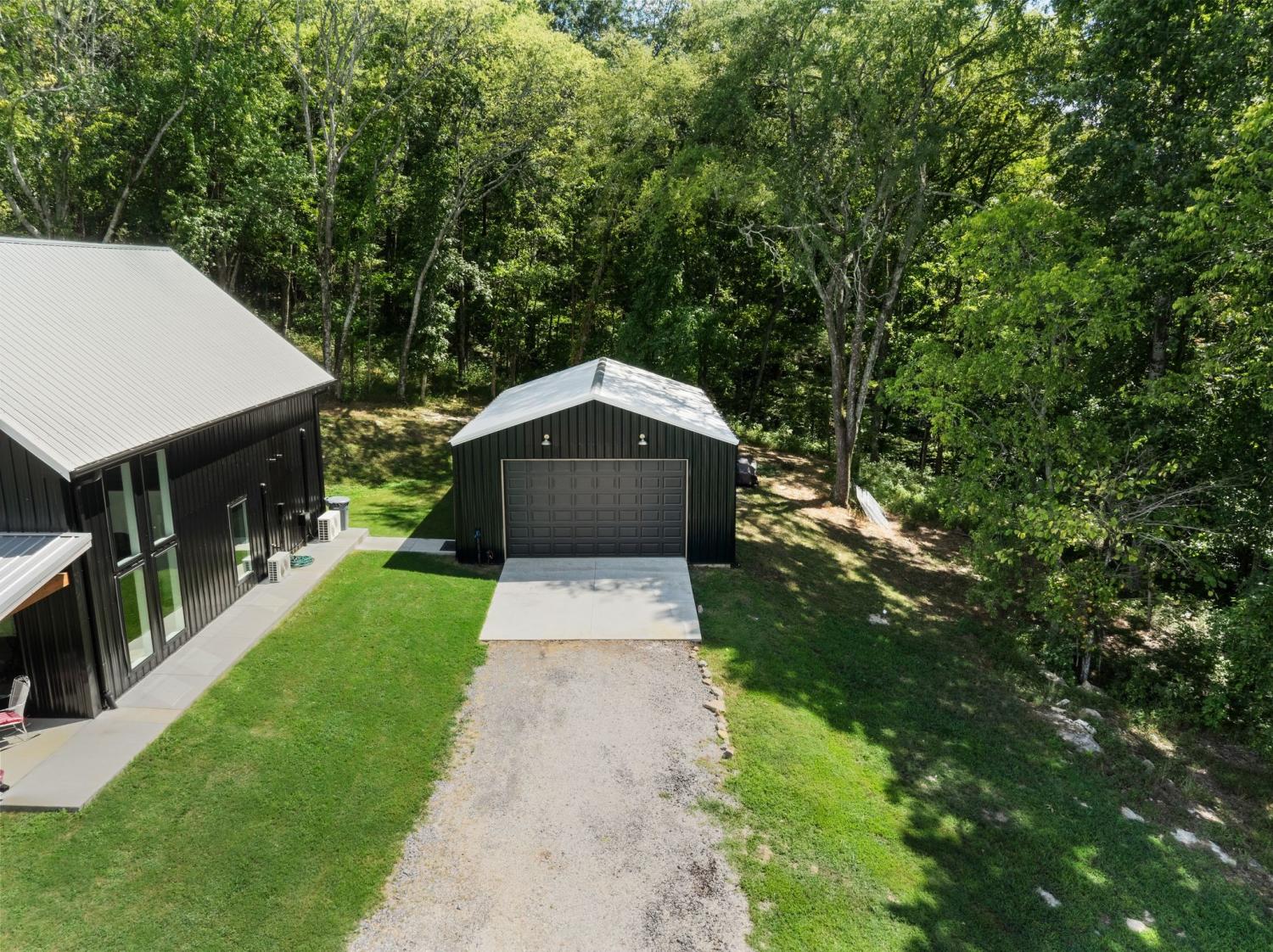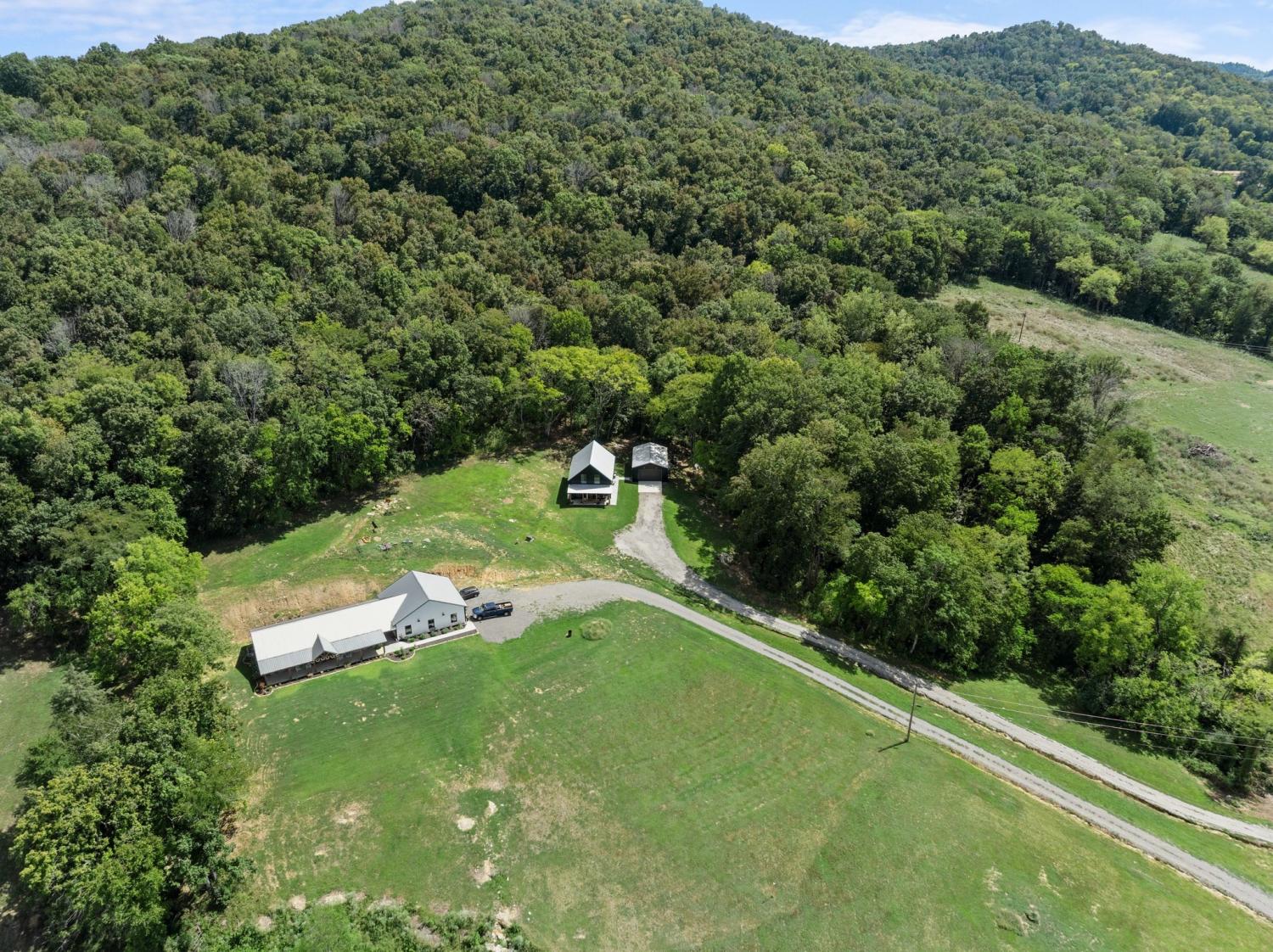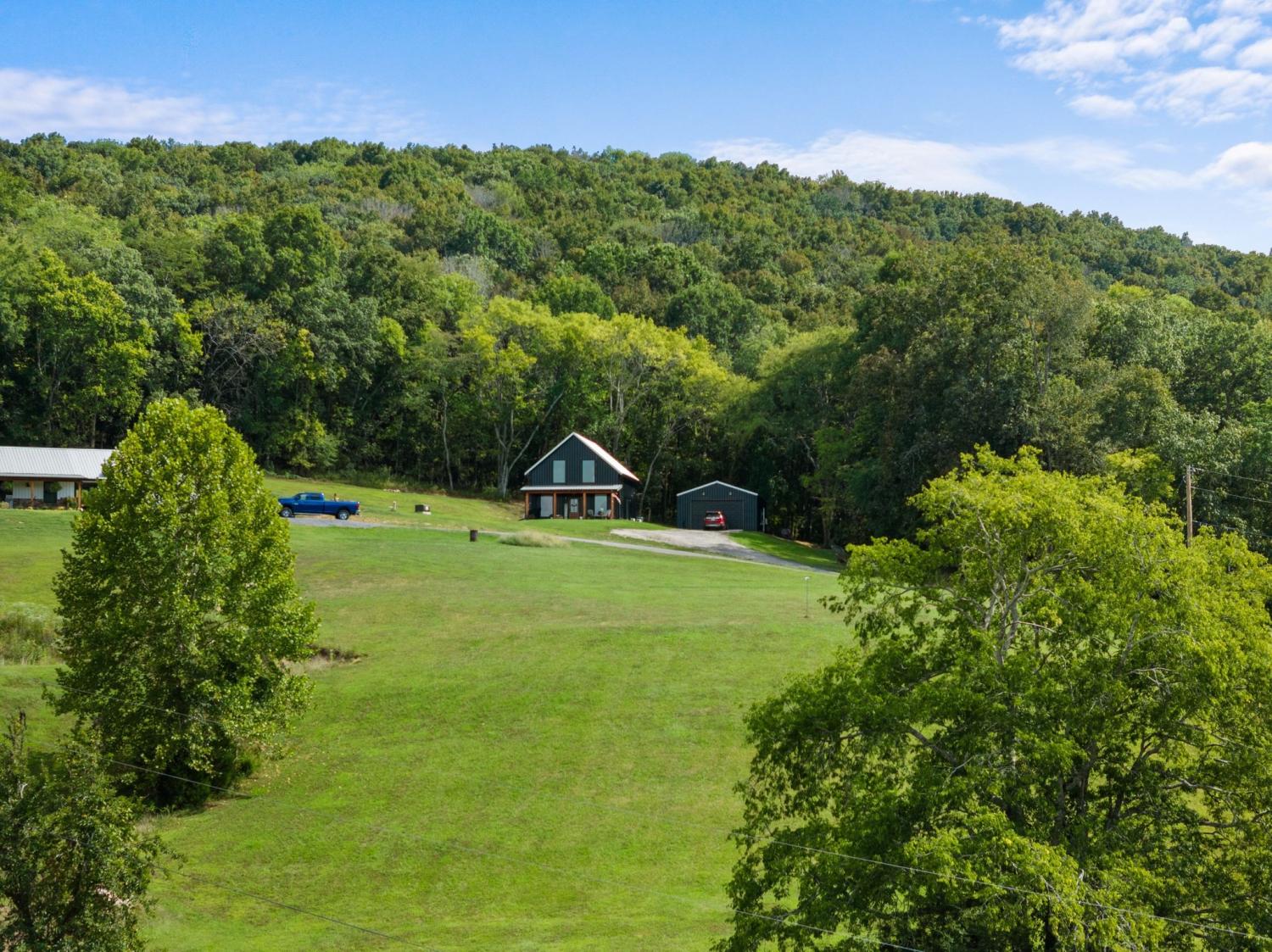 Barndominium Beauty! This newly built stunning home combines rustic charm with modern luxury, offering high-end finishes throughout. Step inside to soaring tongue and groove ceilings, an open-concept floor plan, and designer touches at every turn. The gourmet kitchen features custom cabinetry, upgraded appliances, and a spacious island made of leathered Marble, perfect for entertaining and cooking. The microwave also air fries, the oven is convection and air fryer, the cooktop is induction, and the freezer boasts craft ice. Relax in the serene primary suite with a spa-inspired bath, or enjoy gatherings in the expansive living area filled with natural light and amazing views from inside, or on the second floor balcony. Durable construction meets elegant style, creating a one-of-a-kind property that’s both functional and breathtaking. The serene land is nearly 14 acres of woods with a natural spring, deer and turkey. The detached 2 car garage offers finished space as well as room for all your toys or vehicles and a RV plug. At the base of the parcel there is room to build a shop or park recreational vehicles. Underground electric service means no wires to obstruct your view from the timber framed front porch.On demand propane powered water heater. True country luxury living, and just 45 minutes to Nashville. Bring your rocking chairs for the best porch sitting you can imagine!