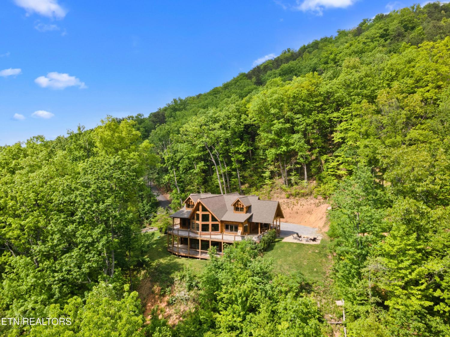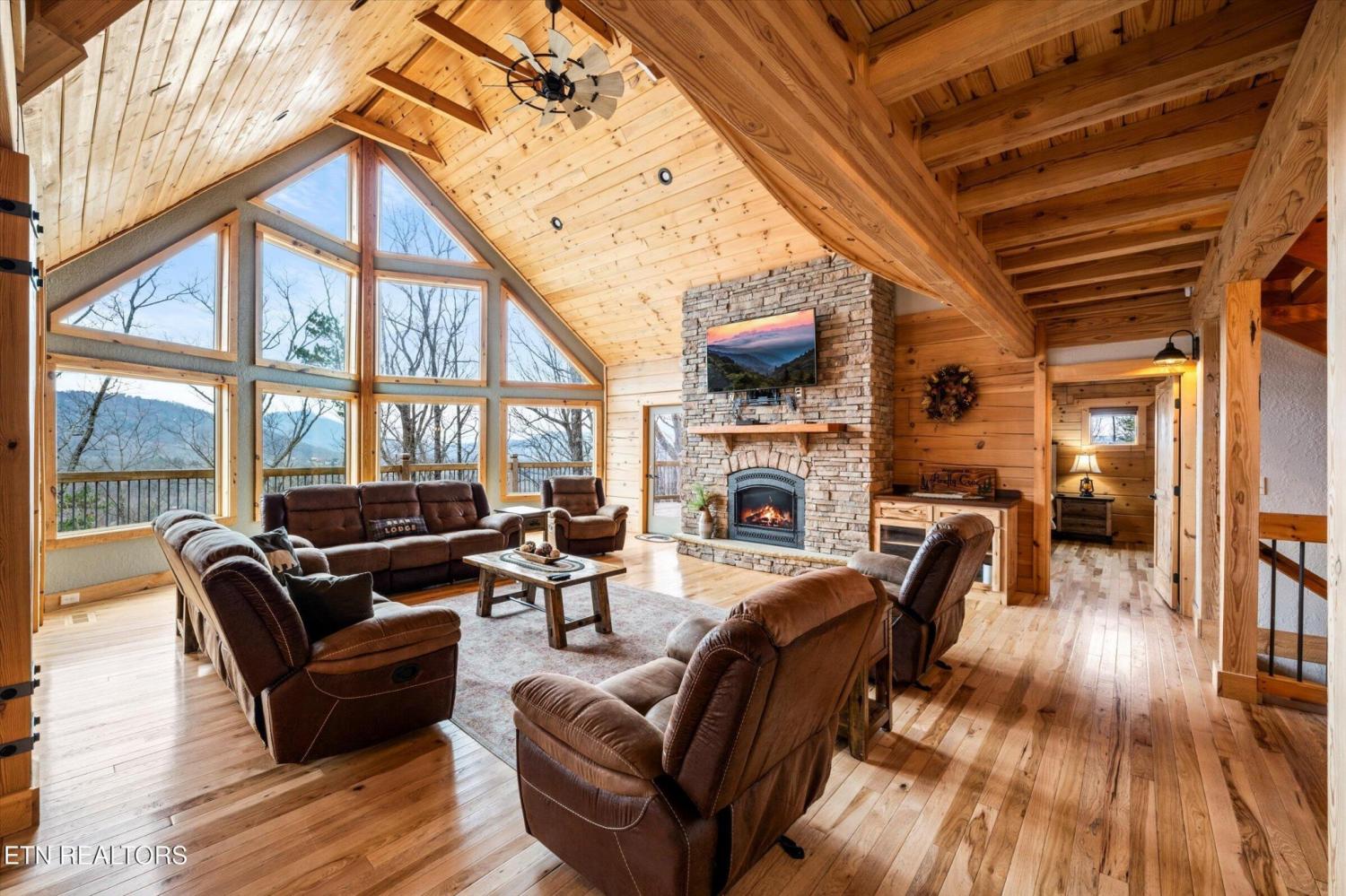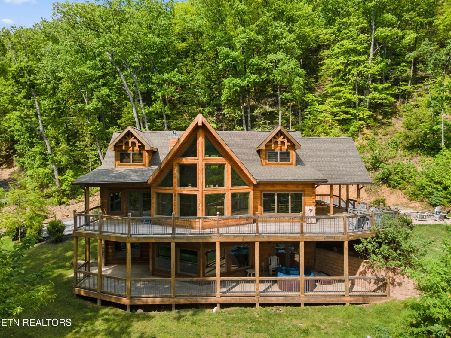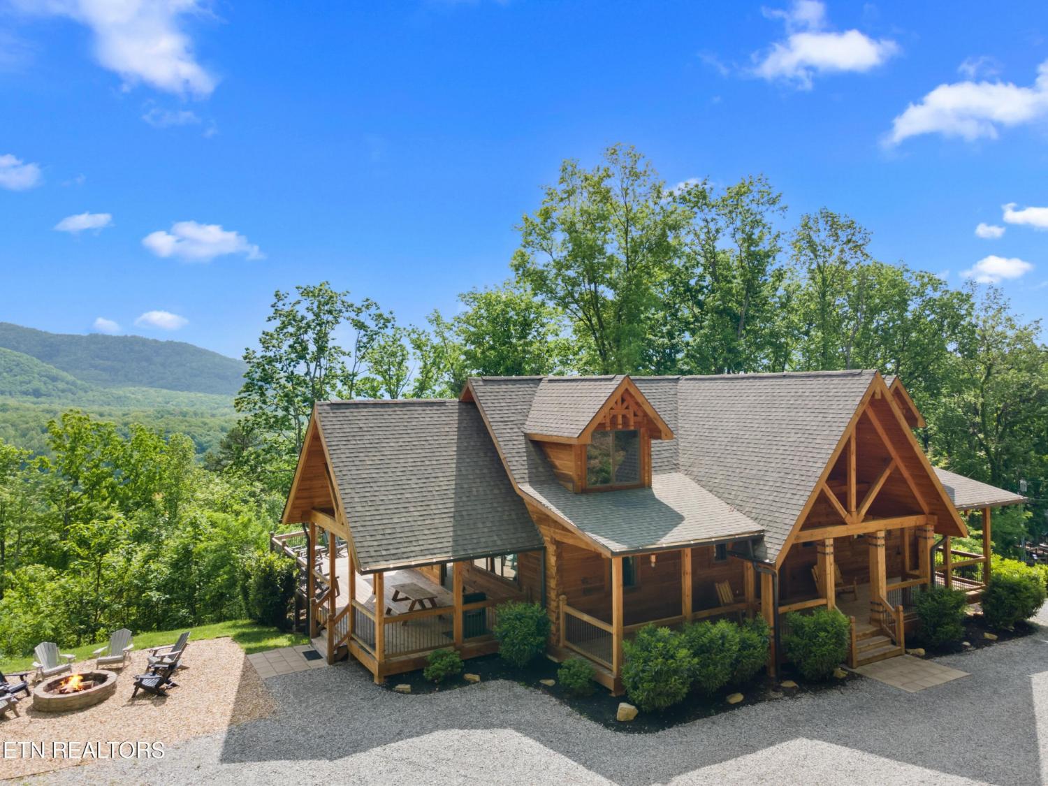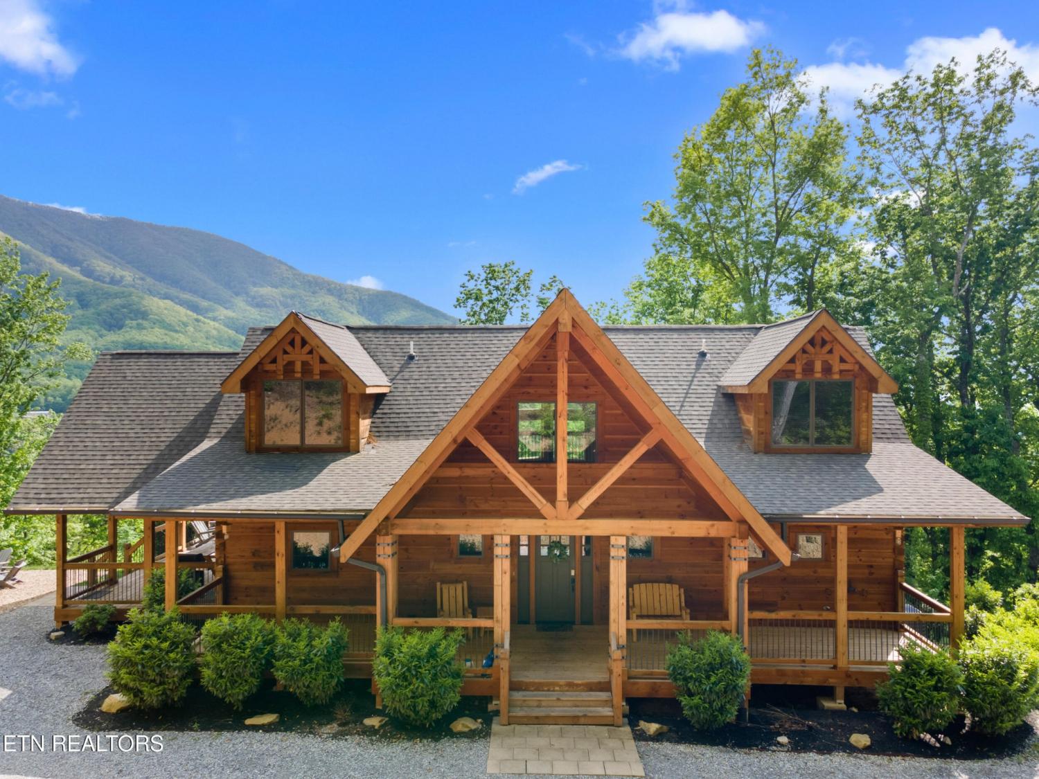 This stunning 5-bedroom, 3.5-bathroom Southland Log Timber Frame Home offers approximately 4300 square feet of luxurious living space on a private 2.89-acre lot with breathtaking, elevated mountain views. Located int eh heart of Wears Vallely, this home is just 15 minutes from Pigeon Forge, 30 minutes to Gatlinburg, and a short drive to the Wears Valley entrance of the Great Smoky Mountains National Park. Designed for both relaxation and entertainment, the home features soaring cathedral ceilings, abundant windows that fill the space with natural light, and a grand stone gas fireplace in the great room. The gourmet kitchen includes custom cabinetry, an oversized island, and premium appliances, making it ideal for hosting. a dedicated game and home theater room provide additional entertainment opportunities. The expansive wrap-around deck on the main level is perfect for outdoor living and offers space for a future outdoor kitchen. The walkout lower level features a hot tub and a scenic outdoor fire pit. This home is pre-wired for smart home capabilities, including Sonos audio and music, a security system, and high-speed Wi-Fi. It is also wired with a 100 AMP service to accommodate a future garage addition. A high-efficiency three-zone HVAC system ensures year-round comfort, while an instant hot water heater UV light water filter, particle sediment filter, and water softener add to the home's modern convenience. Currently sleeping up to 12 guests. Adding a sprinkler system could further increase occupancy and maximize rental income. This property offers exceptional short-term rental potential with projected annual revenue of $175K+. Whether as a luxury mountain retreat or an investment opportunity, this home is truly one of a kind. Schedule your private showing today.