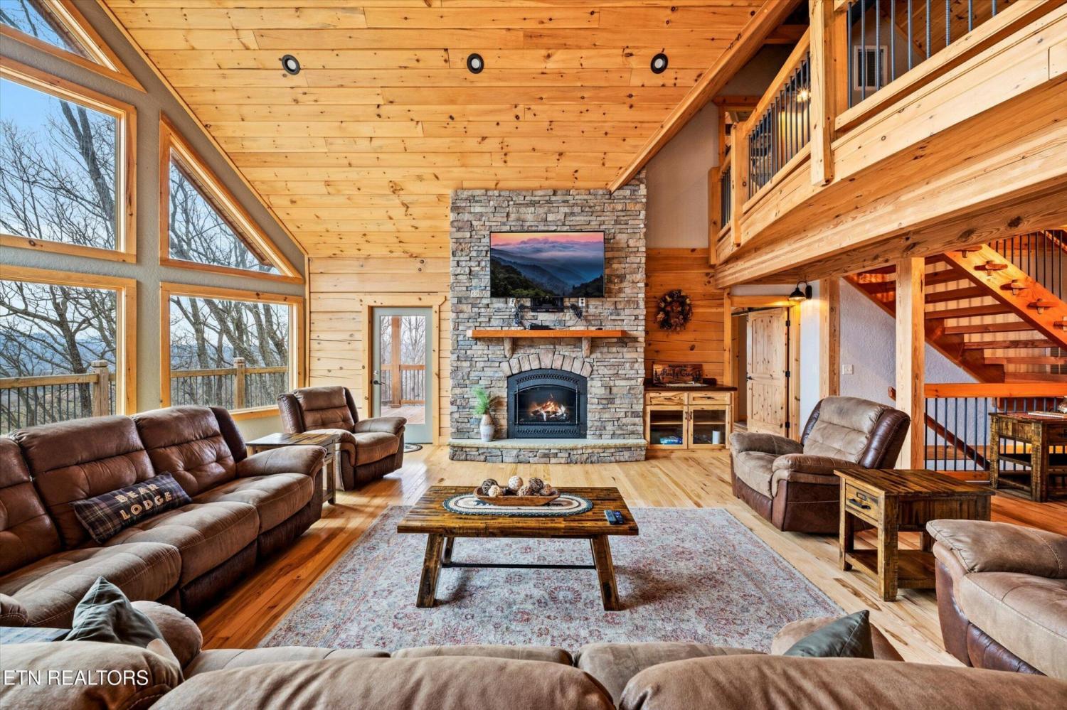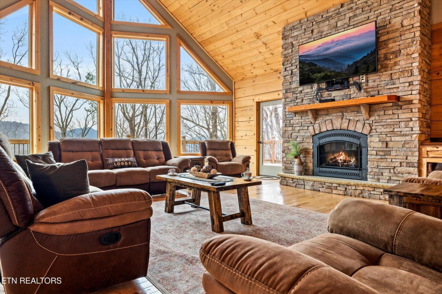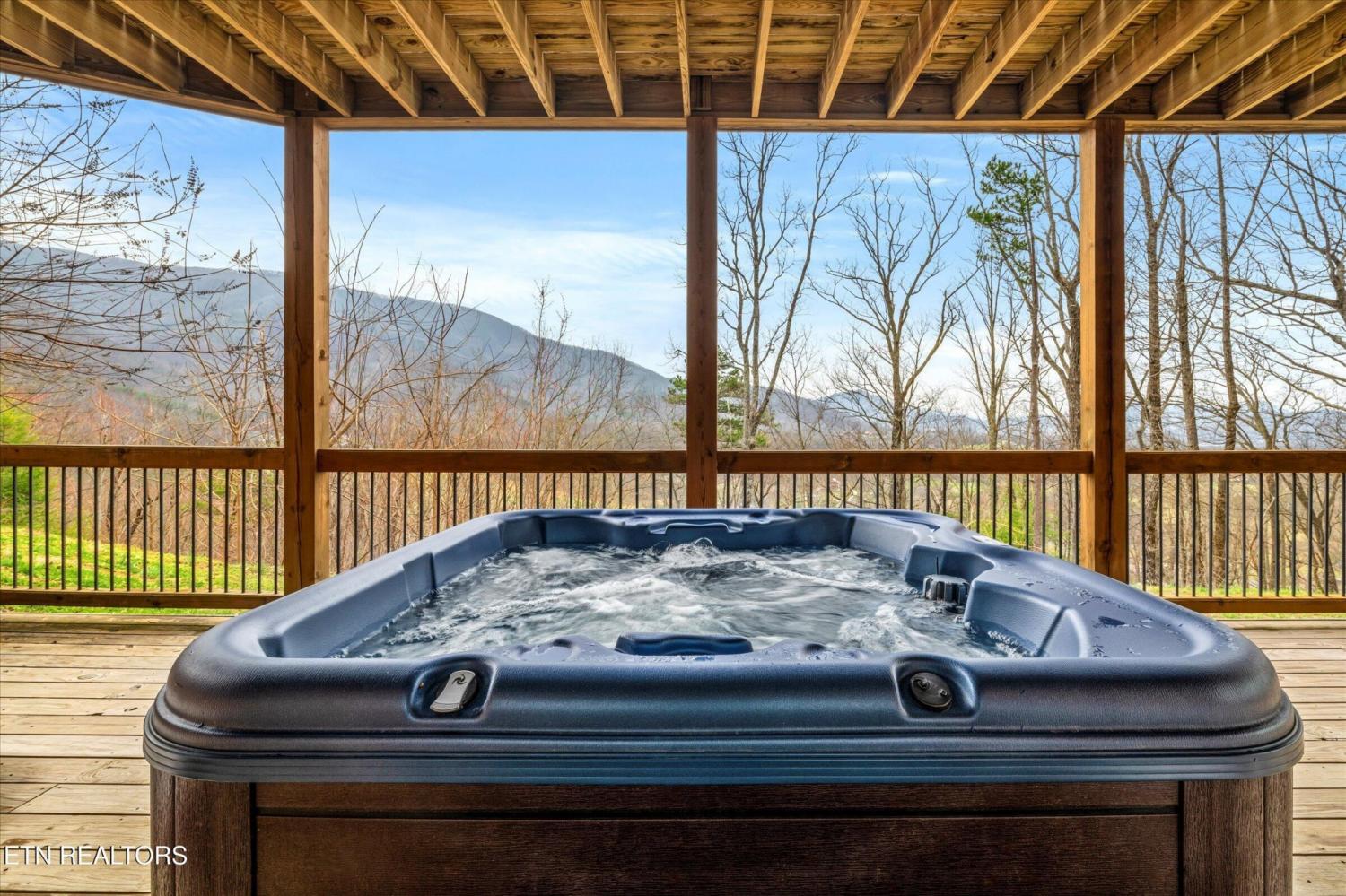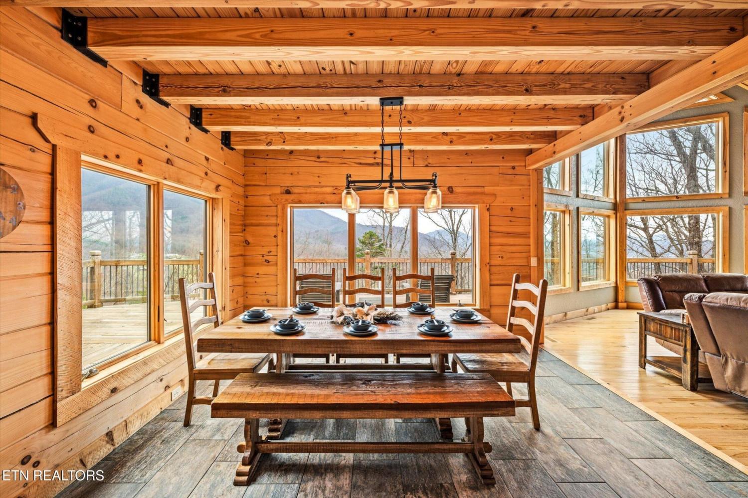 This stunning 5-bedroom, 3.5-bathroom Southland Log Timber Frame Home offers approximately 4300 square feet of luxurious living space on a private 2.89-acre lot with breathtaking, elevated mountain views. Located int eh heart of Wears Vallely, this home is just 15 minutes from Pigeon Forge, 30 minutes to Gatlinburg, and a short drive to the Wears Valley entrance of the Great Smoky Mountains National Park. Designed for both relaxation and entertainment, the home features soaring cathedral ceilings, abundant windows that fill the space with natural light, and a grand stone gas fireplace in the great room. The gourmet kitchen includes custom cabinetry, an oversized island, and premium appliances, making it ideal for hosting. a dedicated game and home theater room provide additional entertainment opportunities. The expansive wrap-around deck on the main level is perfect for outdoor living and offers space for a future outdoor kitchen. The walkout lower level features a hot tub and a scenic outdoor fire pit. This home is pre-wired for smart home capabilities, including Sonos audio and music, a security system, and high-speed Wi-Fi. It is also wired with a 100 AMP service to accommodate a future garage addition. A high-efficiency three-zone HVAC system ensures year-round comfort, while an instant hot water heater UV light water filter, particle sediment filter, and water softener add to the home's modern convenience. Currently sleeping up to 12 guests. Adding a sprinkler system could further increase occupancy and maximize rental income. This property offers exceptional short-term rental potential with projected annual revenue of $175K+. Whether as a luxury mountain retreat or an investment opportunity, this home is truly one of a kind. Schedule your private showing today.