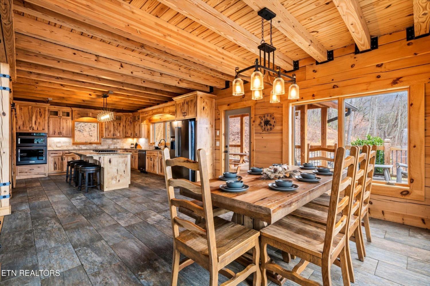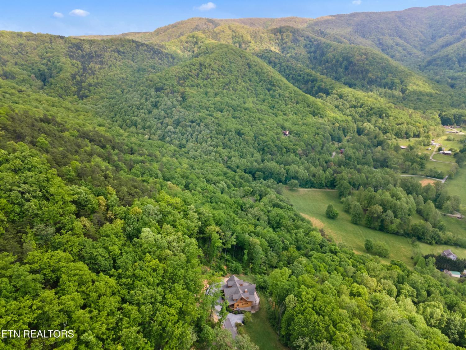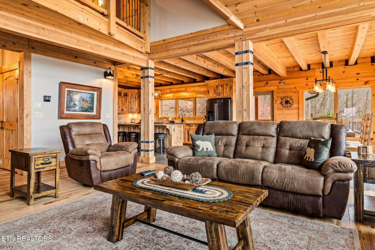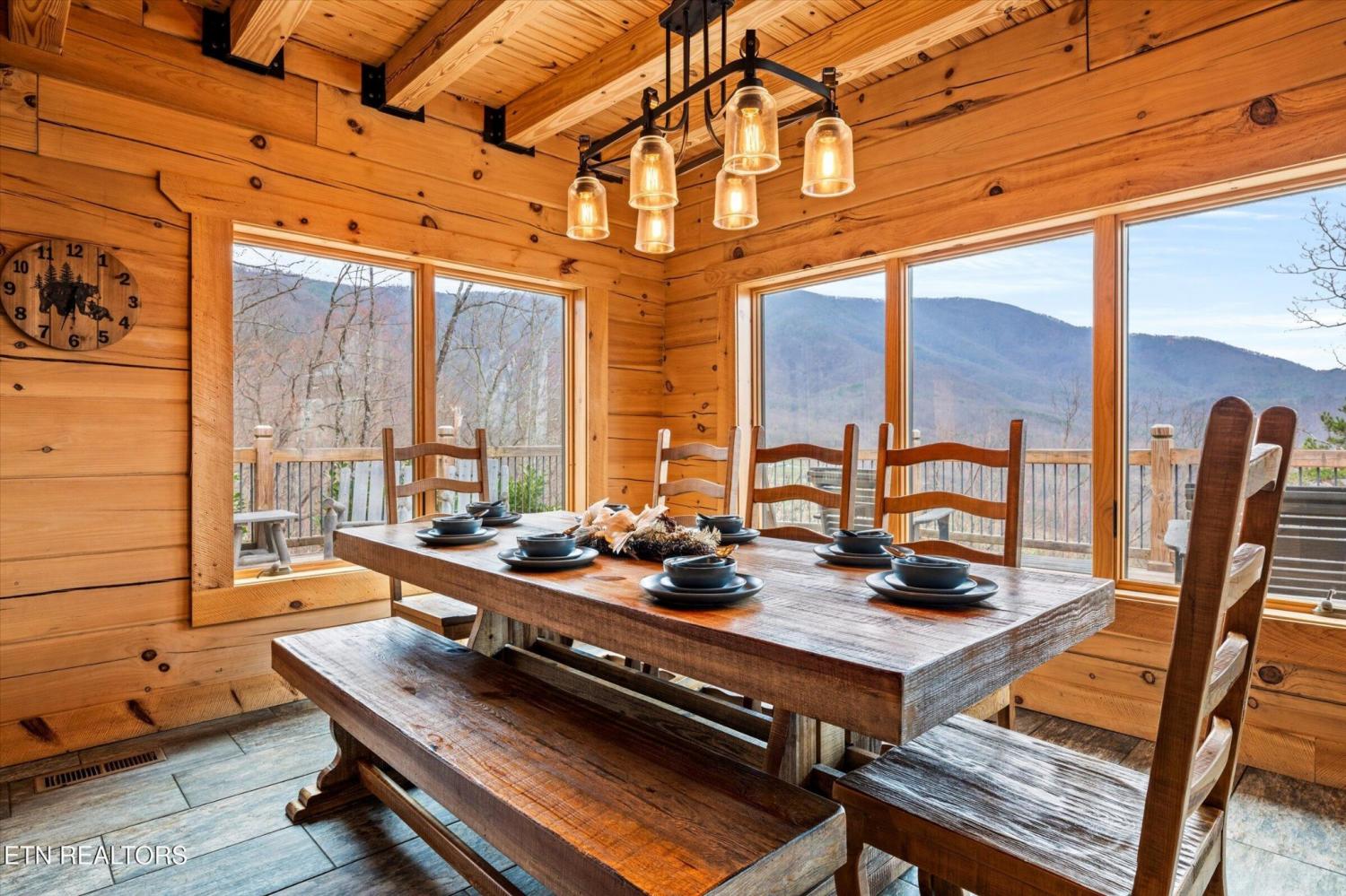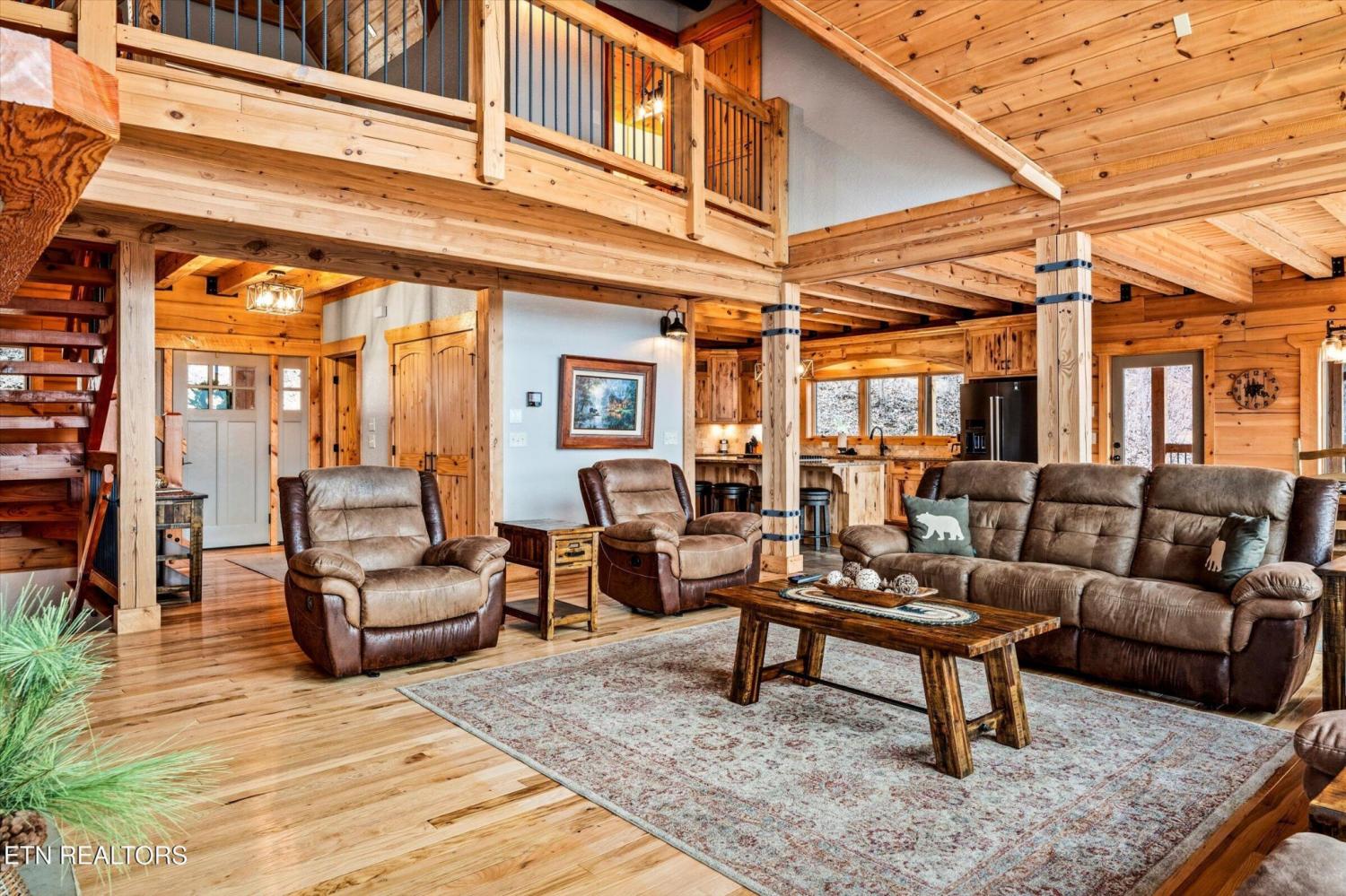 This stunning 5-bedroom, 3.5-bathroom Southland Log Timber Frame Home offers approximately 4300 square feet of luxurious living space on a private 2.89-acre lot with breathtaking, elevated mountain views. Located int eh heart of Wears Vallely, this home is just 15 minutes from Pigeon Forge, 30 minutes to Gatlinburg, and a short drive to the Wears Valley entrance of the Great Smoky Mountains National Park. Designed for both relaxation and entertainment, the home features soaring cathedral ceilings, abundant windows that fill the space with natural light, and a grand stone gas fireplace in the great room. The gourmet kitchen includes custom cabinetry, an oversized island, and premium appliances, making it ideal for hosting. a dedicated game and home theater room provide additional entertainment opportunities. The expansive wrap-around deck on the main level is perfect for outdoor living and offers space for a future outdoor kitchen. The walkout lower level features a hot tub and a scenic outdoor fire pit. This home is pre-wired for smart home capabilities, including Sonos audio and music, a security system, and high-speed Wi-Fi. It is also wired with a 100 AMP service to accommodate a future garage addition. A high-efficiency three-zone HVAC system ensures year-round comfort, while an instant hot water heater UV light water filter, particle sediment filter, and water softener add to the home's modern convenience. Currently sleeping up to 12 guests. Adding a sprinkler system could further increase occupancy and maximize rental income. This property offers exceptional short-term rental potential with projected annual revenue of $175K+. Whether as a luxury mountain retreat or an investment opportunity, this home is truly one of a kind. Schedule your private showing today.