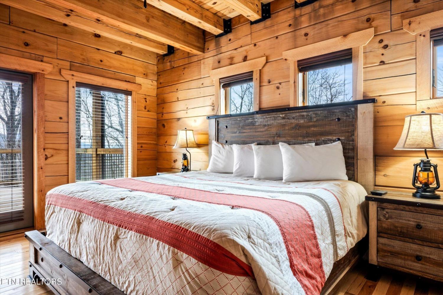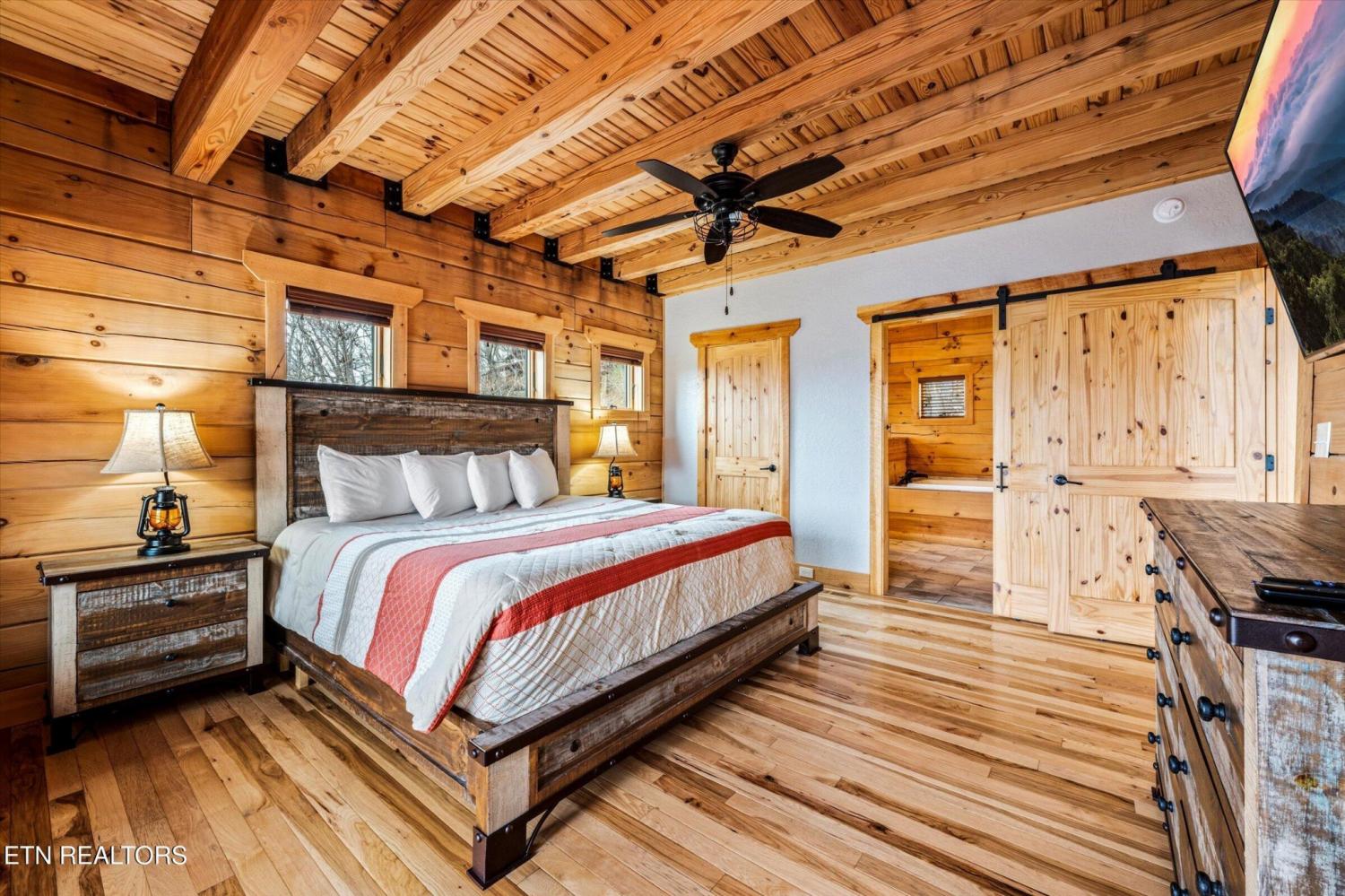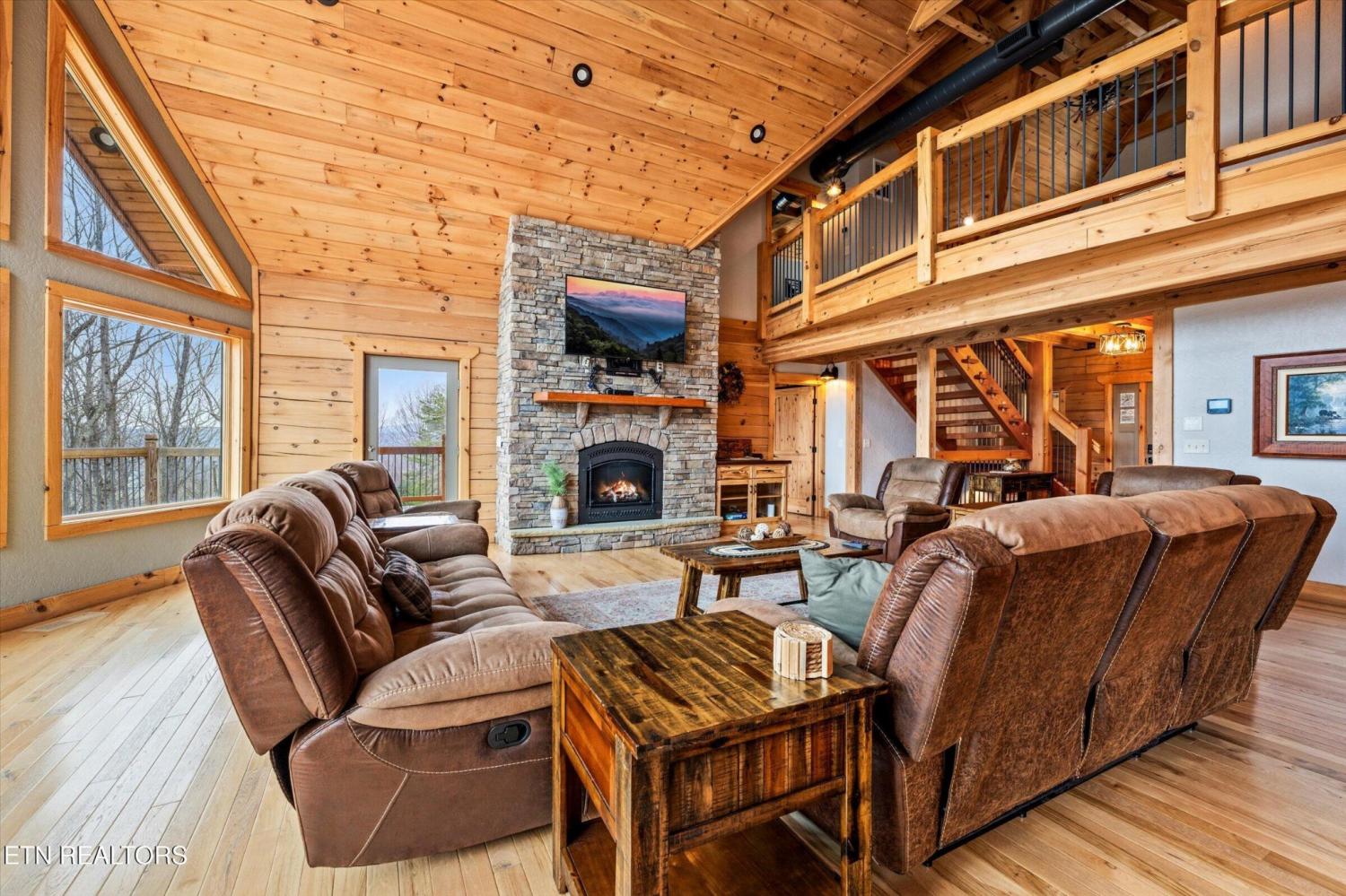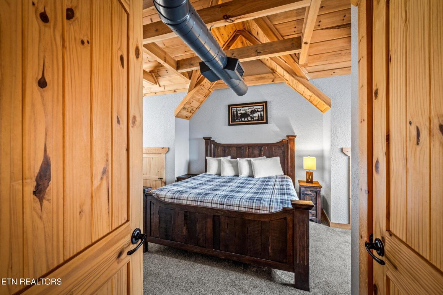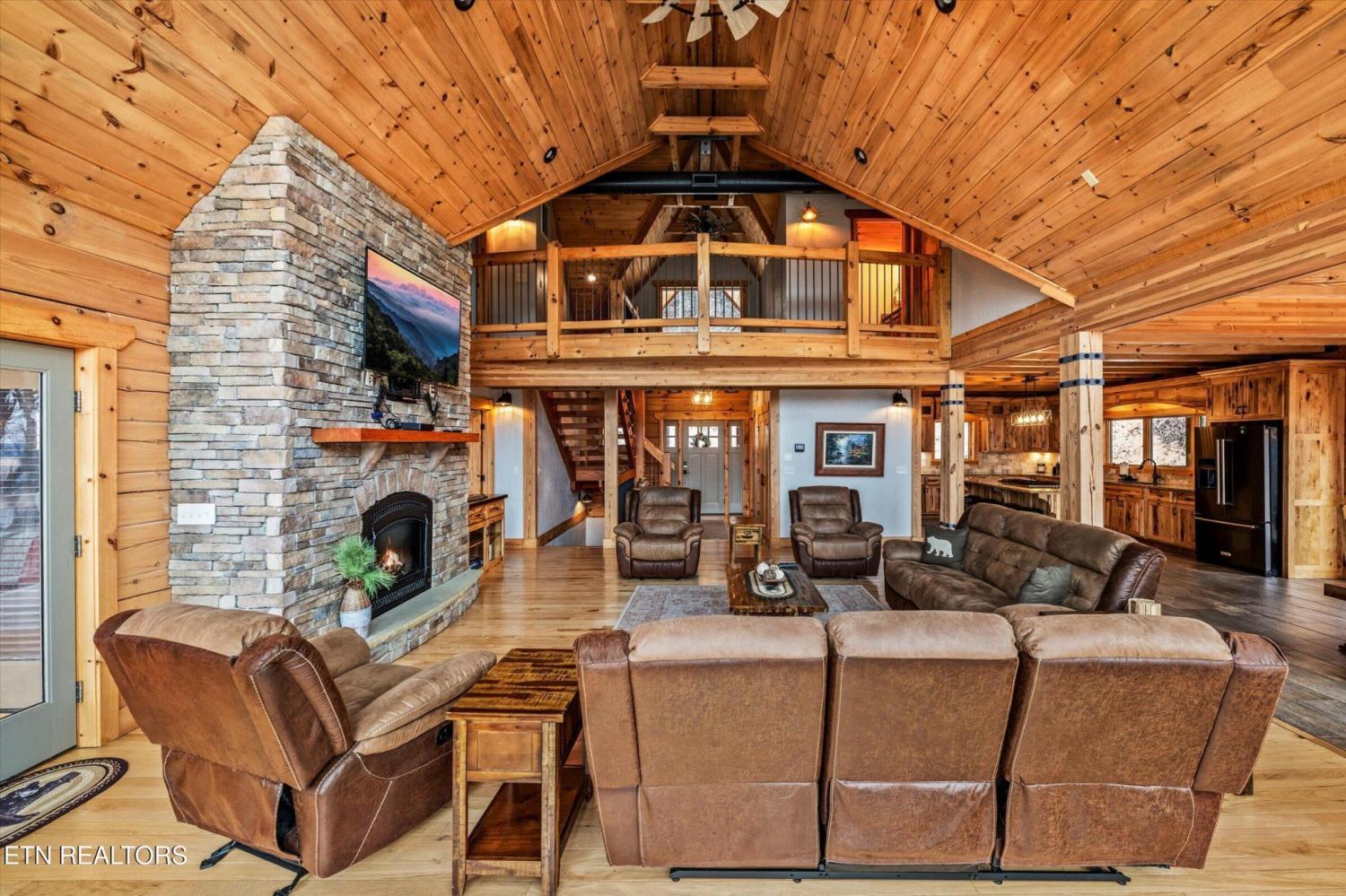 This stunning 5-bedroom, 3.5-bathroom Southland Log Timber Frame Home offers approximately 4300 square feet of luxurious living space on a private 2.89-acre lot with breathtaking, elevated mountain views. Located int eh heart of Wears Vallely, this home is just 15 minutes from Pigeon Forge, 30 minutes to Gatlinburg, and a short drive to the Wears Valley entrance of the Great Smoky Mountains National Park. Designed for both relaxation and entertainment, the home features soaring cathedral ceilings, abundant windows that fill the space with natural light, and a grand stone gas fireplace in the great room. The gourmet kitchen includes custom cabinetry, an oversized island, and premium appliances, making it ideal for hosting. a dedicated game and home theater room provide additional entertainment opportunities. The expansive wrap-around deck on the main level is perfect for outdoor living and offers space for a future outdoor kitchen. The walkout lower level features a hot tub and a scenic outdoor fire pit. This home is pre-wired for smart home capabilities, including Sonos audio and music, a security system, and high-speed Wi-Fi. It is also wired with a 100 AMP service to accommodate a future garage addition. A high-efficiency three-zone HVAC system ensures year-round comfort, while an instant hot water heater UV light water filter, particle sediment filter, and water softener add to the home's modern convenience. Currently sleeping up to 12 guests. Adding a sprinkler system could further increase occupancy and maximize rental income. This property offers exceptional short-term rental potential with projected annual revenue of $175K+. Whether as a luxury mountain retreat or an investment opportunity, this home is truly one of a kind. Schedule your private showing today.