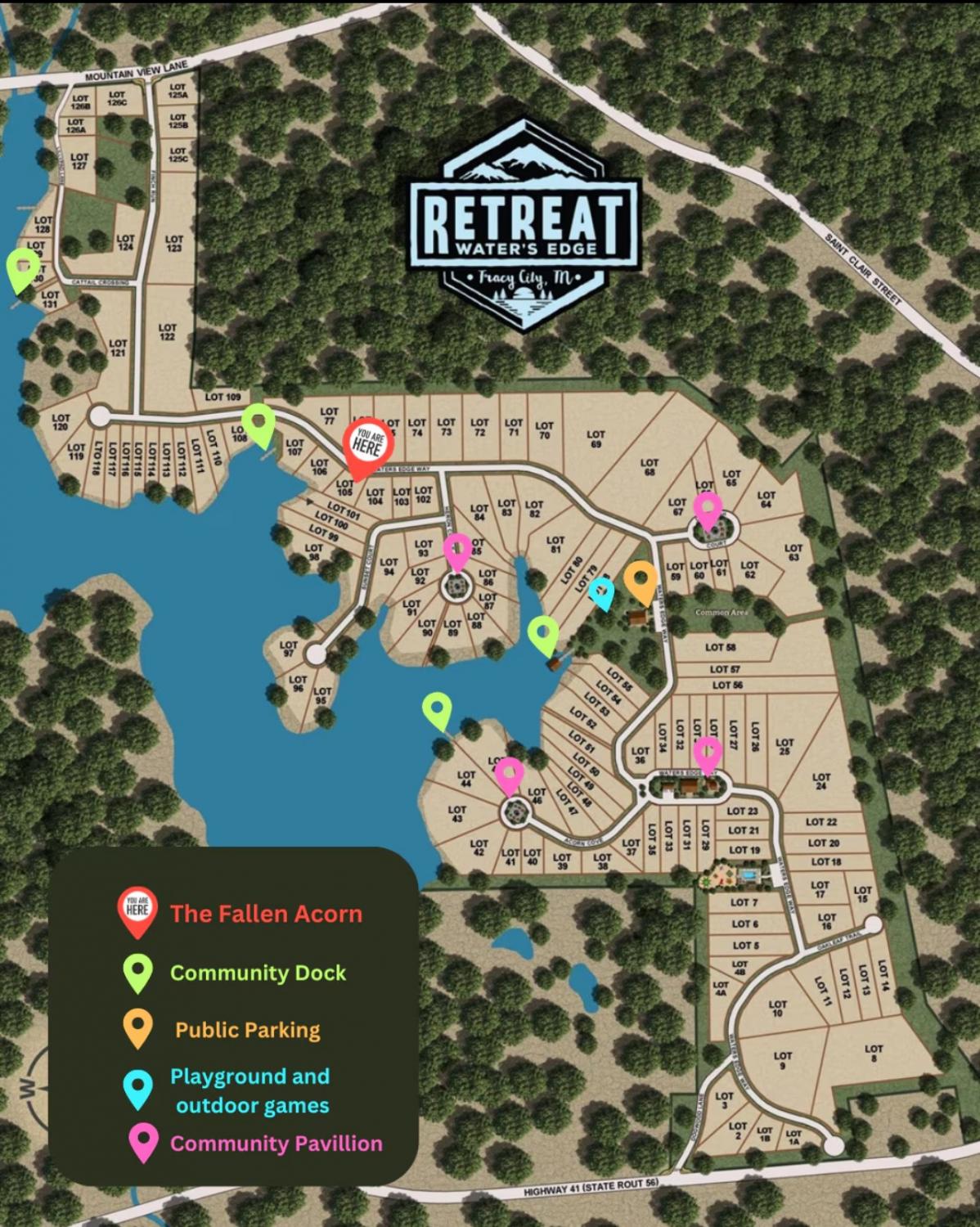 I-24 to Monteagle exit 134. Keep right, towards Tracy City on 41A. Take left at Hwy 41, continue for approx 5 miles. Gated entrance to The Retreat at Water's Edge is on the left.