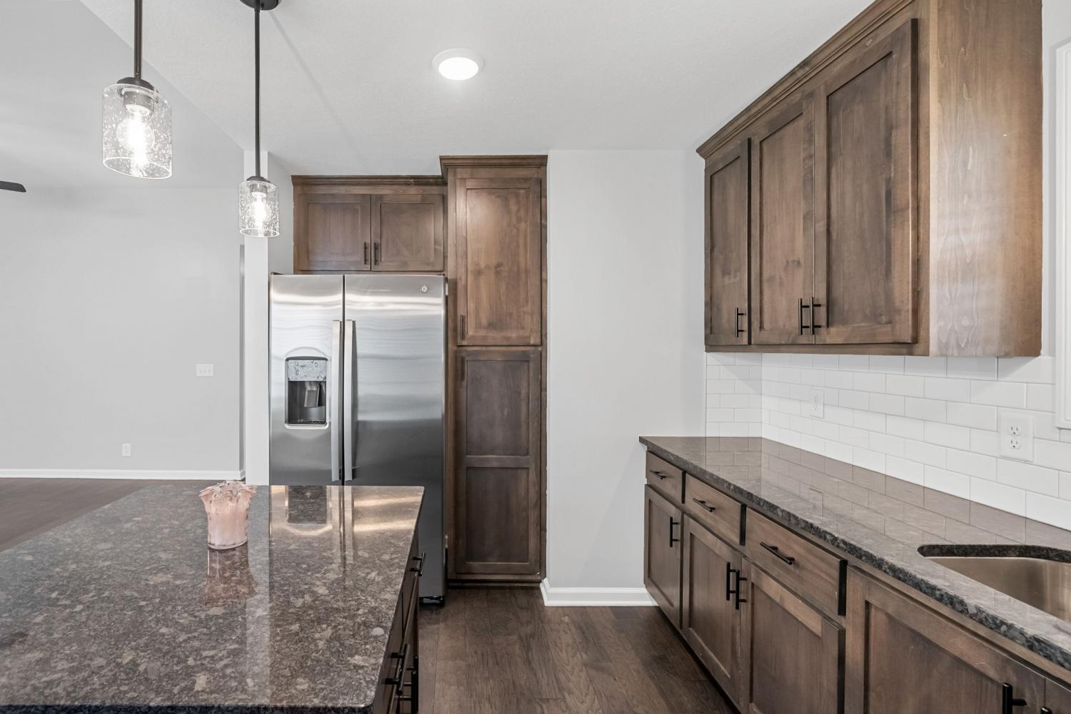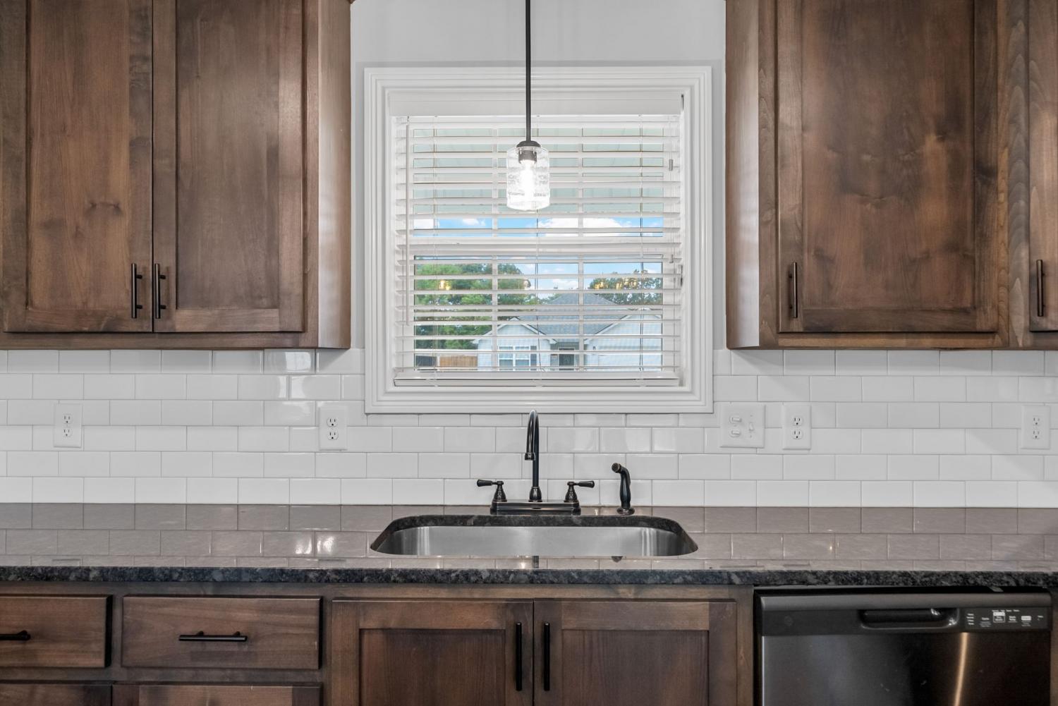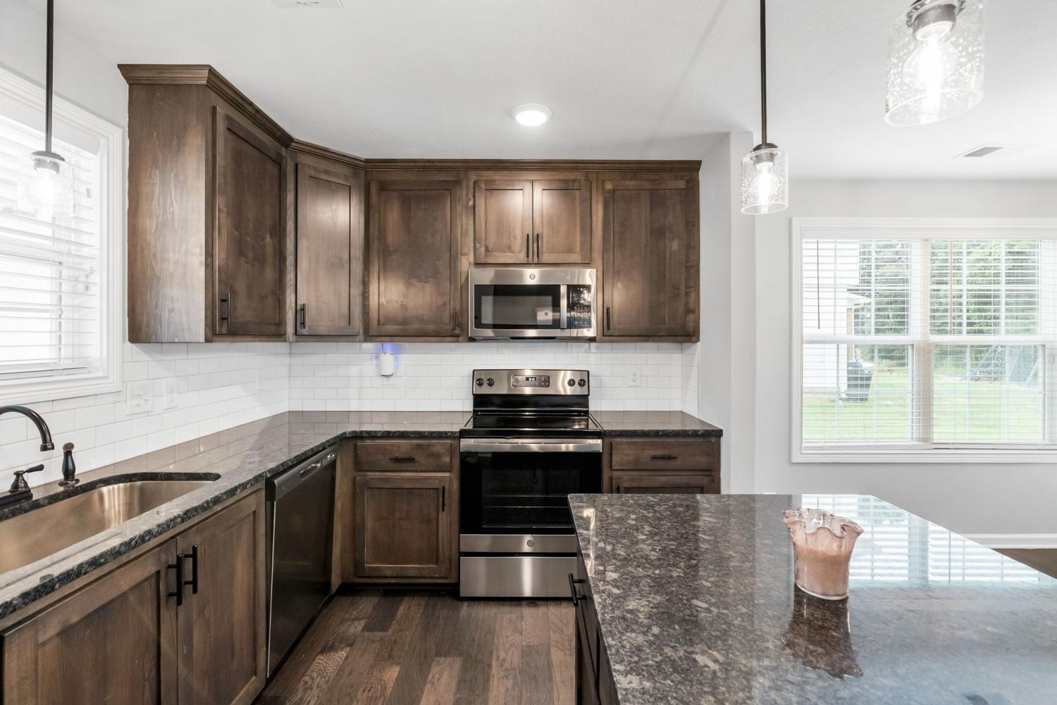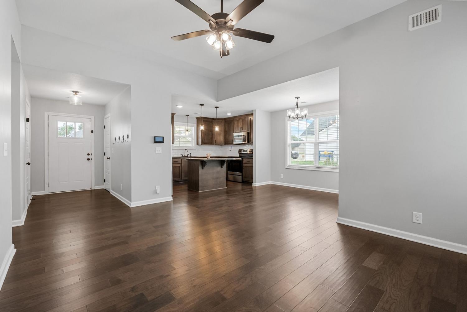 Welcome to this beautifully designed one-level home that perfectly blends style, comfort, and convenience. Featuring 3 spacious bedrooms, 2 full bathrooms, and a 2-car garage, this property offers everything you need for modern living. Step inside to a bright and airy open-concept layout with soaring vaulted ceilings and hardwood flooring throughout the main living spaces. The gourmet kitchen is a chef’s dream, complete with a large island, stainless steel appliances, marble countertops, tile backsplash, and rich hardwood cabinets. The master suite is a private retreat featuring a walk-in closet and a luxurious en-suite bath with double sinks, a walk-in shower, and sleek storage cabinetry. Secondary bedrooms are carpeted for comfort and share a well-appointed bath, each with over-the-toilet storage for added functionality. Enjoy outdoor living on the back patio that overlooks a spacious backyard, perfect for entertaining or relaxing. The community also offers an on-site playground. With its modern finishes, thoughtful layout, and convenient amenities, this home is ready to welcome its next residents.
