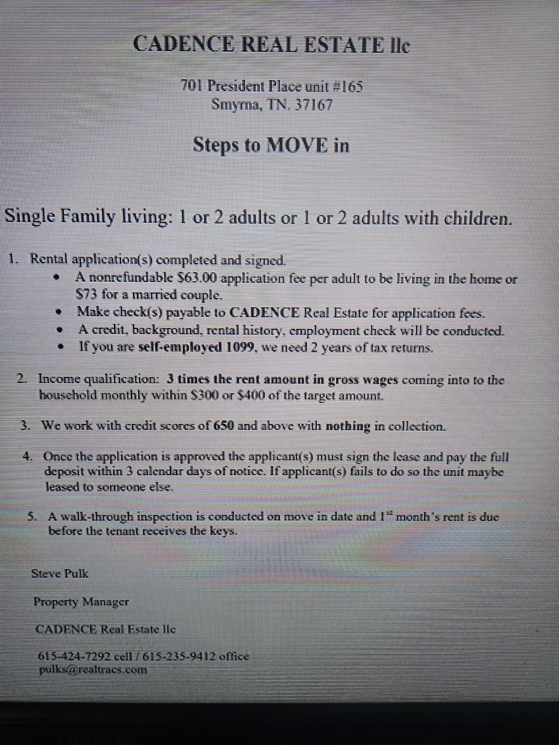 All one level unit with 3 bedrooms and two baths with NO CARPET. Great location for all needs. Shopping, dinning and I-24 is close to this home. Tile floors in the main rooms. Nice front porch, A concrete driveway and a storage shed are nice addictions to the unit. 650 credit score and up with nothing in collects. Small pet must be approved by owner $350 pet fee
