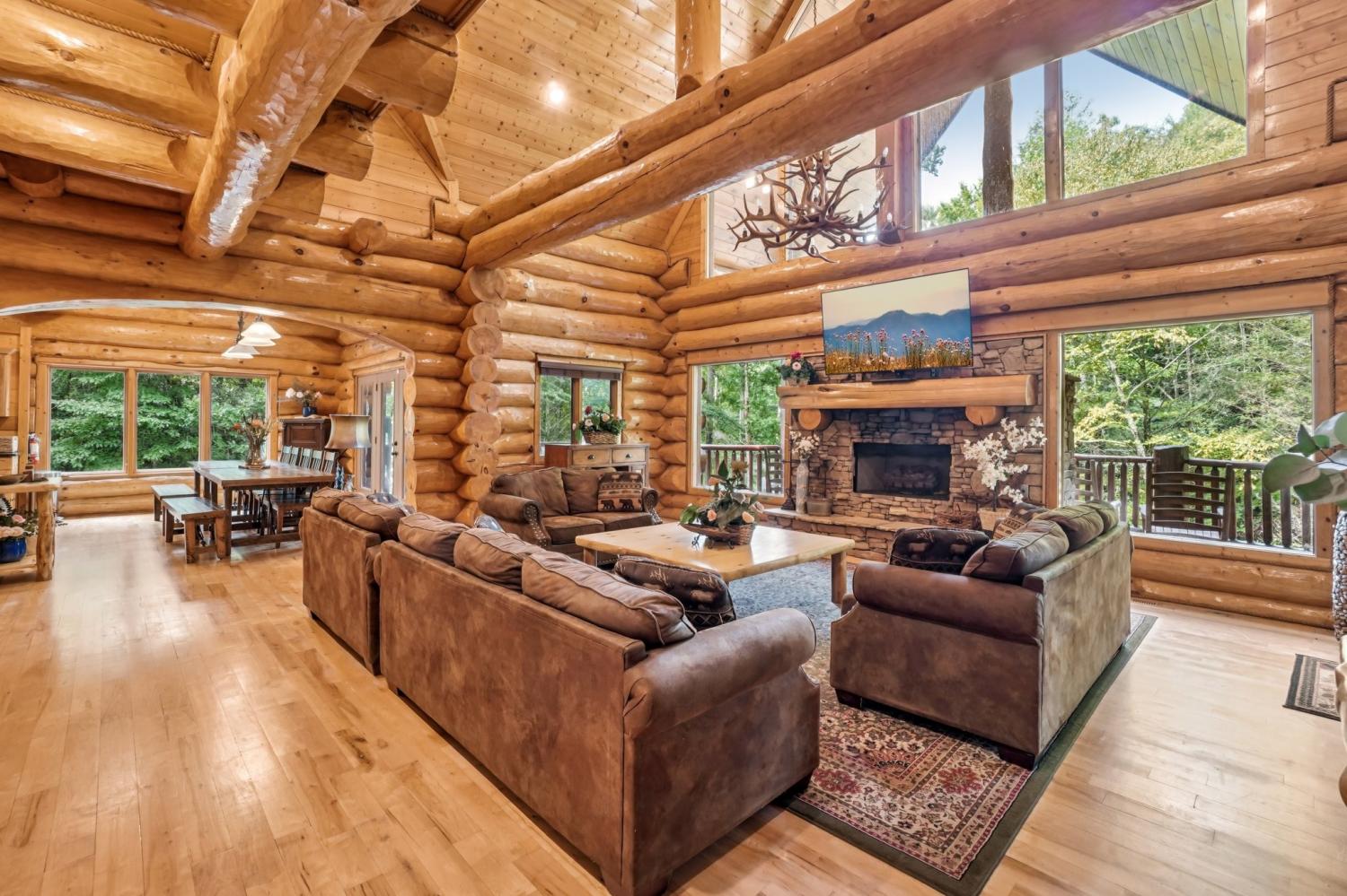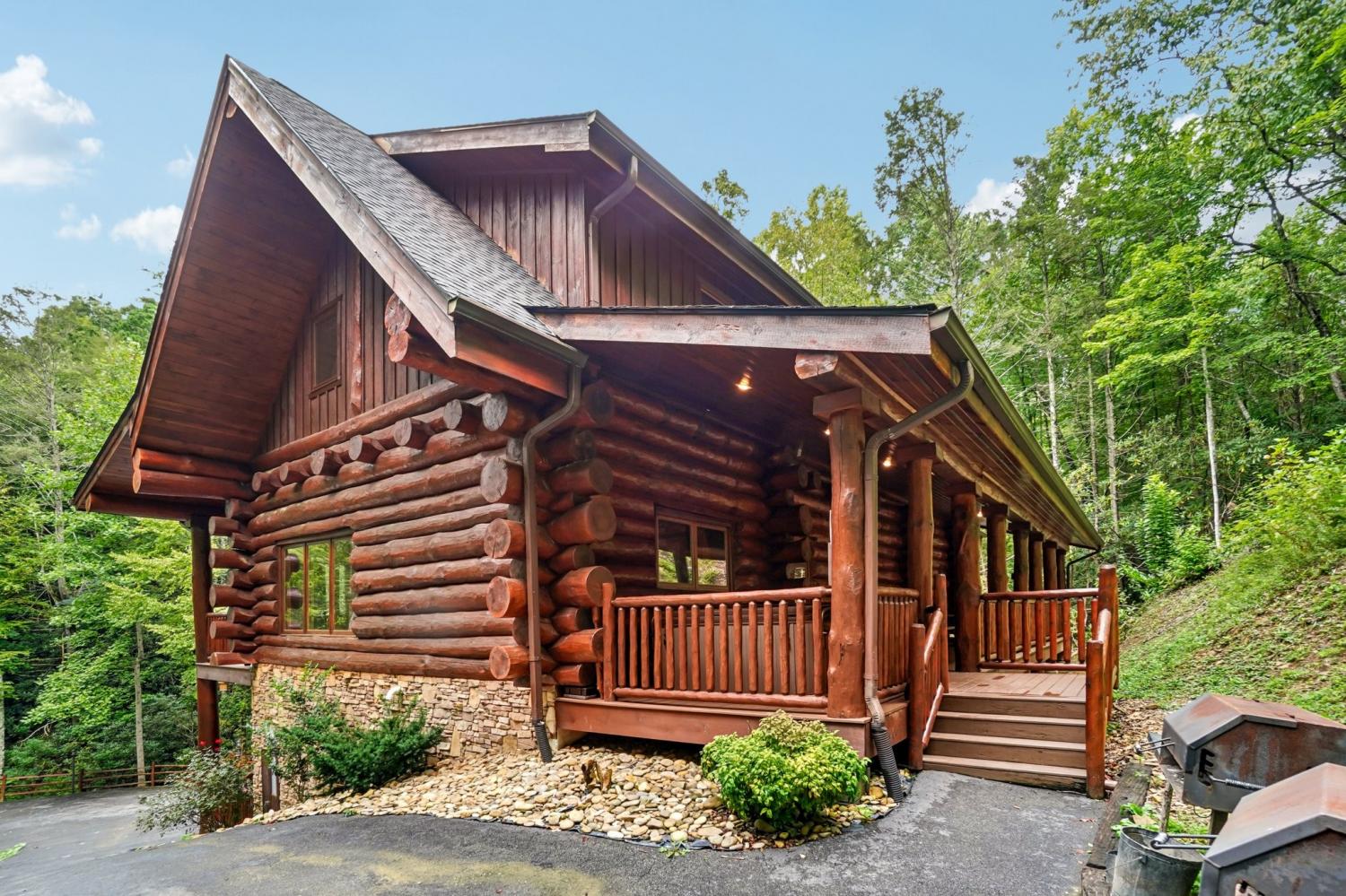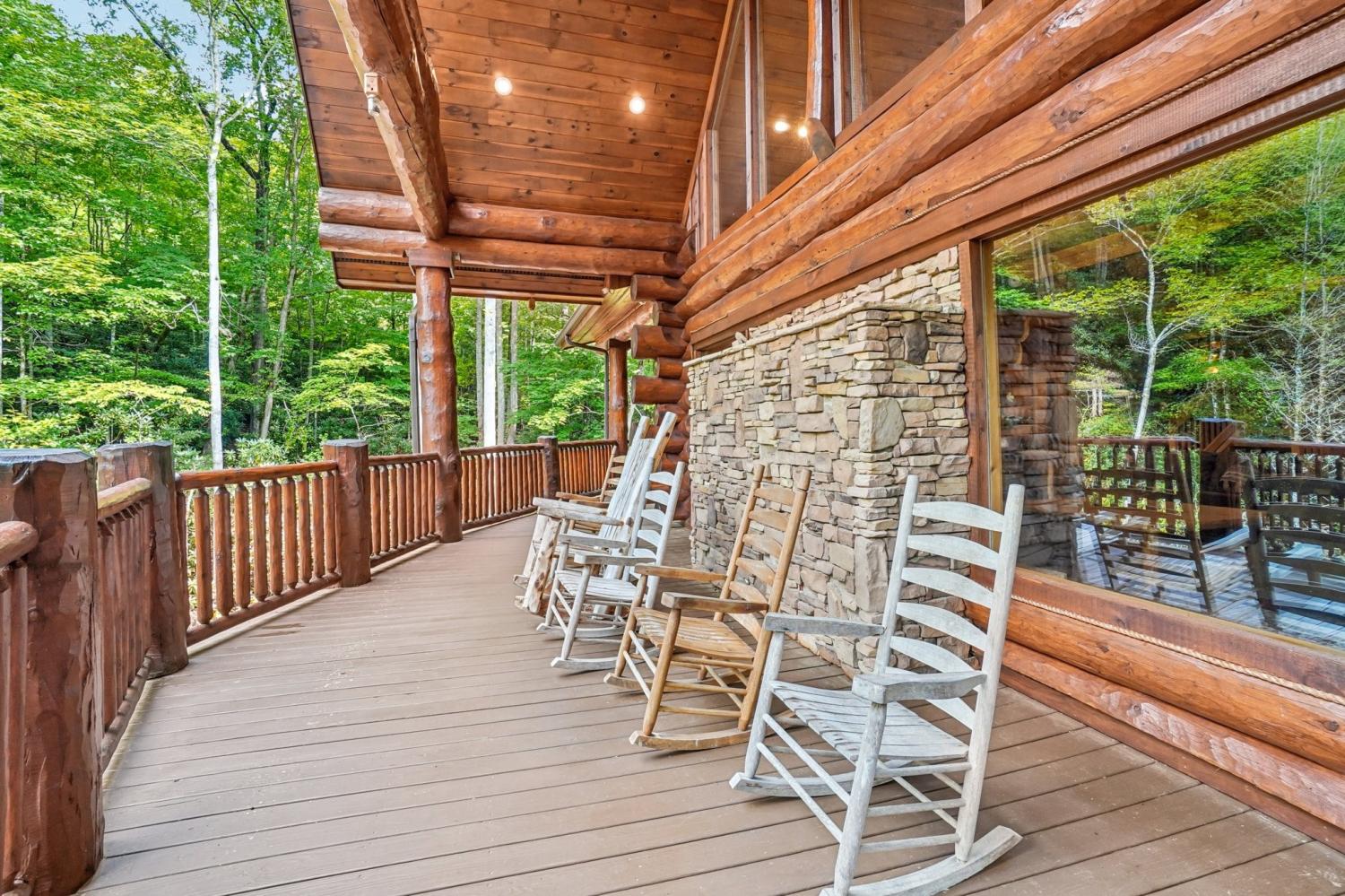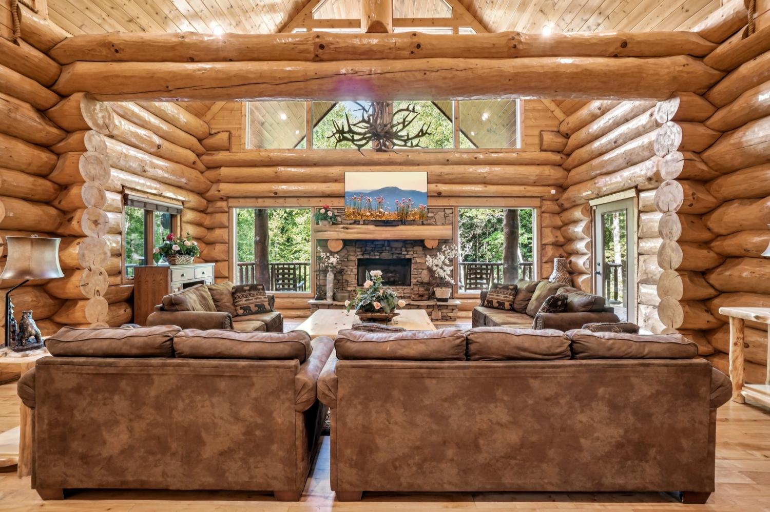 Luxury meets mountain charm in this stunning 4,500+ sq ft log cabin retreat, nestled on over 2 private acres in highly sought-after Pittman Center. Crafted from hand-peeled lodge pole pine logs, this 5-bedroom, 6-bathroom estate offers a perfect blend of rustic elegance and modern comfort, along with impressive rental income. The property generates impressive rental income. ****New roof and other updates**** The main level features soaring vaulted ceilings, a dramatic stacked stone fireplace, and massive picture windows that frame peaceful forest views and a serene mountain stream. A chef’s kitchen includes custom hickory cabinets, high-end appliances, and a 14-foot log dining table. The spacious great room with four oversized sofas is ideal for entertaining. The primary suite offers a spa-like en-suite bath and walk-in closet. Step outside to the wraparound deck with outdoor dining, a hot tub, and wooded views. Upstairs you'll find two large en-suite bedrooms and a flexible loft area. The lower level is made for fun, complete with a large game room, second stone fireplace, pool table, Foosball, arcade games, and additional living space. Two more en-suite bedrooms, a bunk room with log beds, and four portable memory foam beds comfortably accommodate large groups. Each lower-level bedroom opens to its own private deck. Enjoy outdoor living with multiple decks, a fire pit, picnic areas, walking bridge, charcoal grills, and a streamside sitting area. An in-ground basketball goal and private gated driveway add even more appeal. Additional highlights include a whole-house security system, high-speed internet, city-maintained roads, and garbage pickup. There is no HOA. Located just minutes to downtown Gatlinburg, the Smokies, and Bent Creek Golf Course. Turnkey and income-producing, this lodge offers a rare opportunity for both a private retreat and a proven investment.