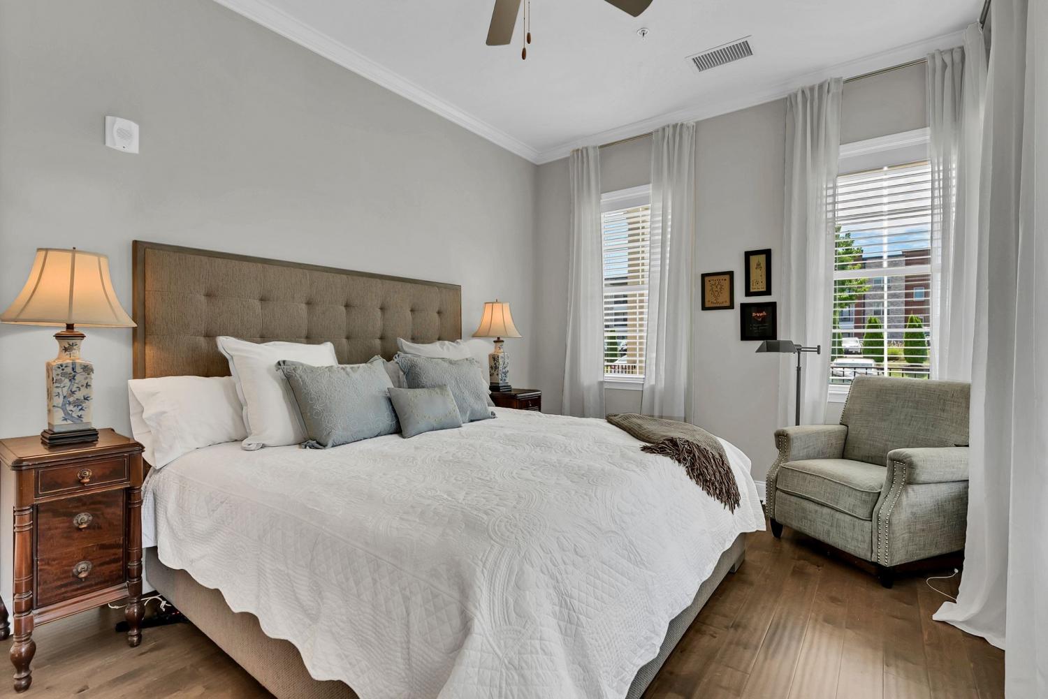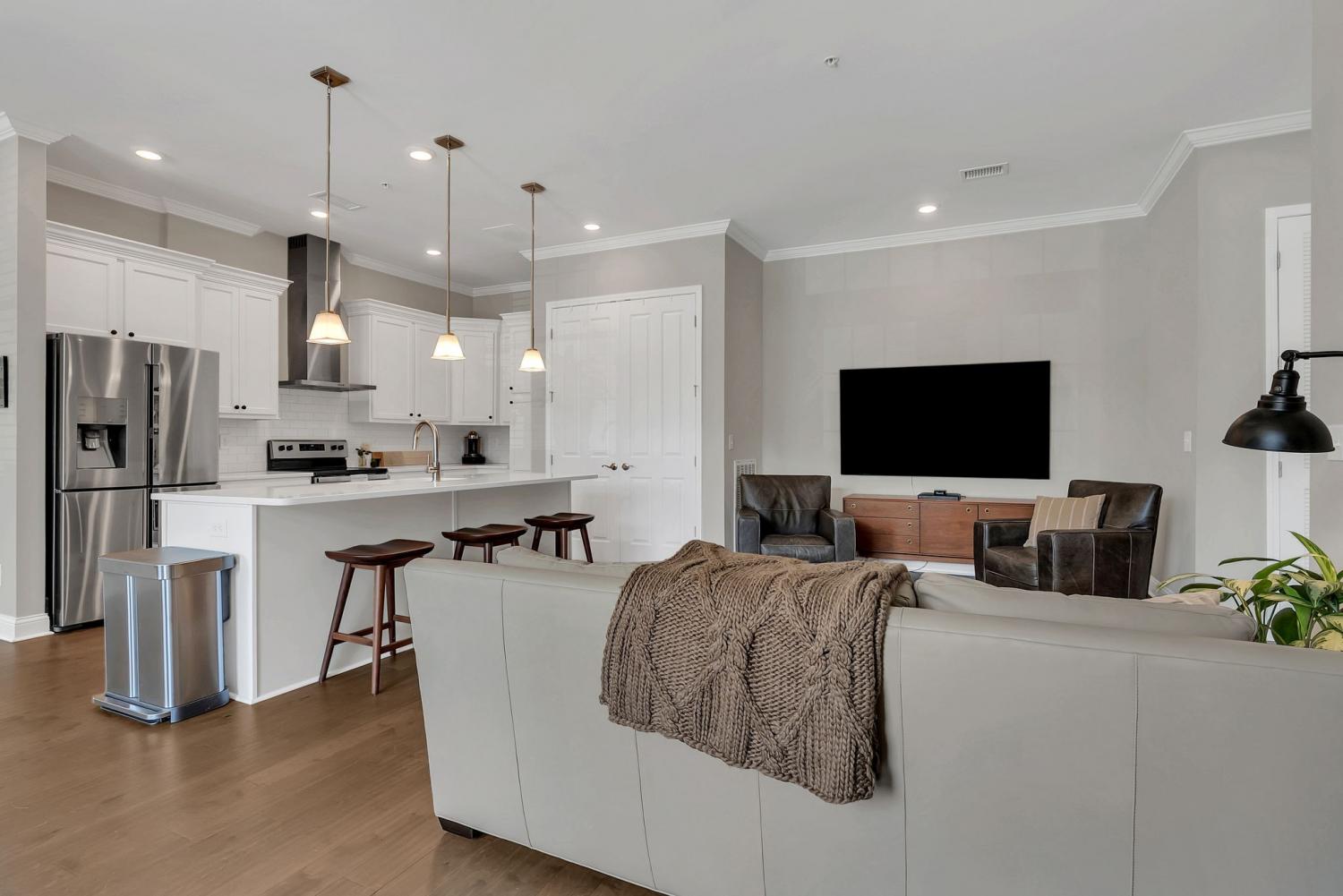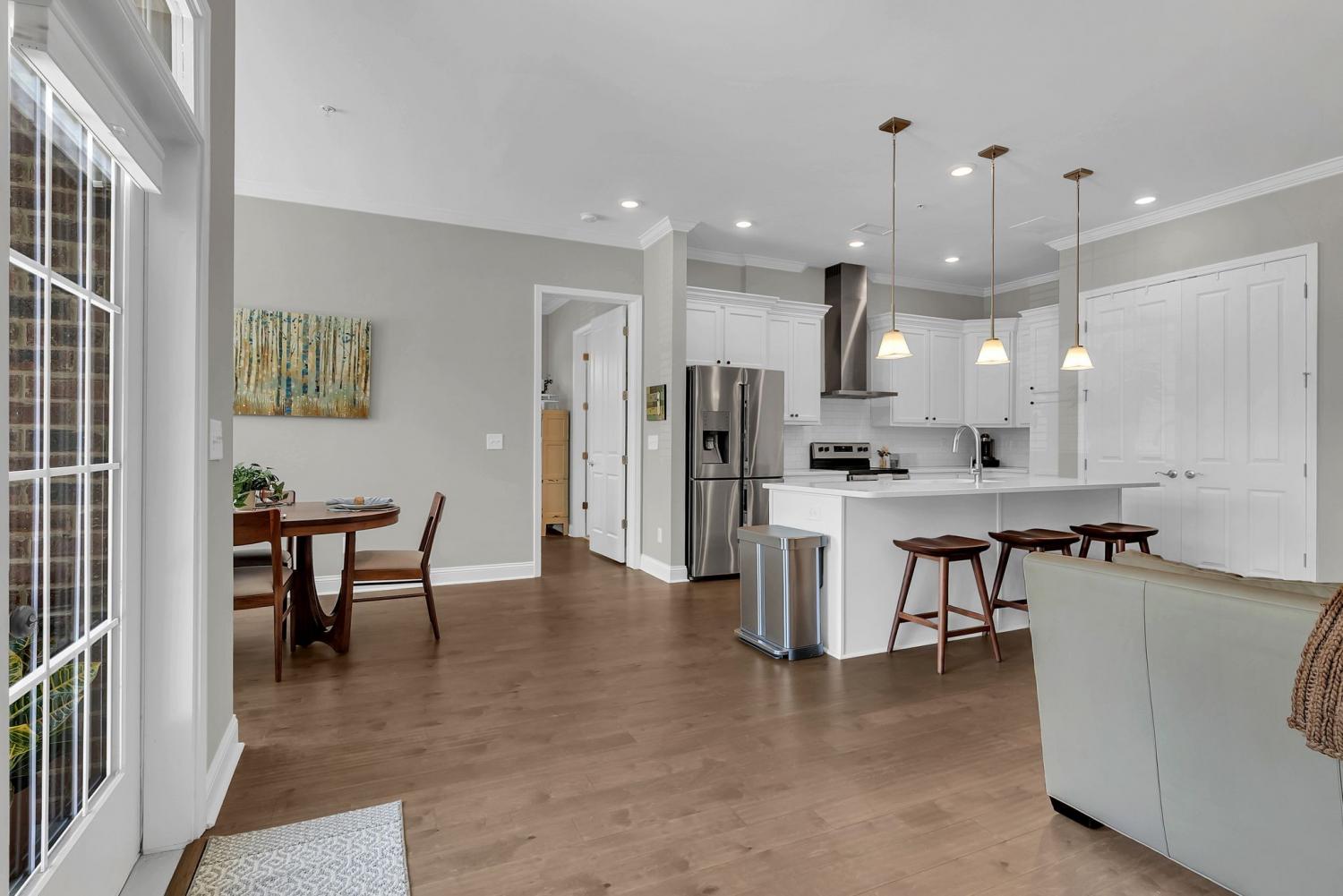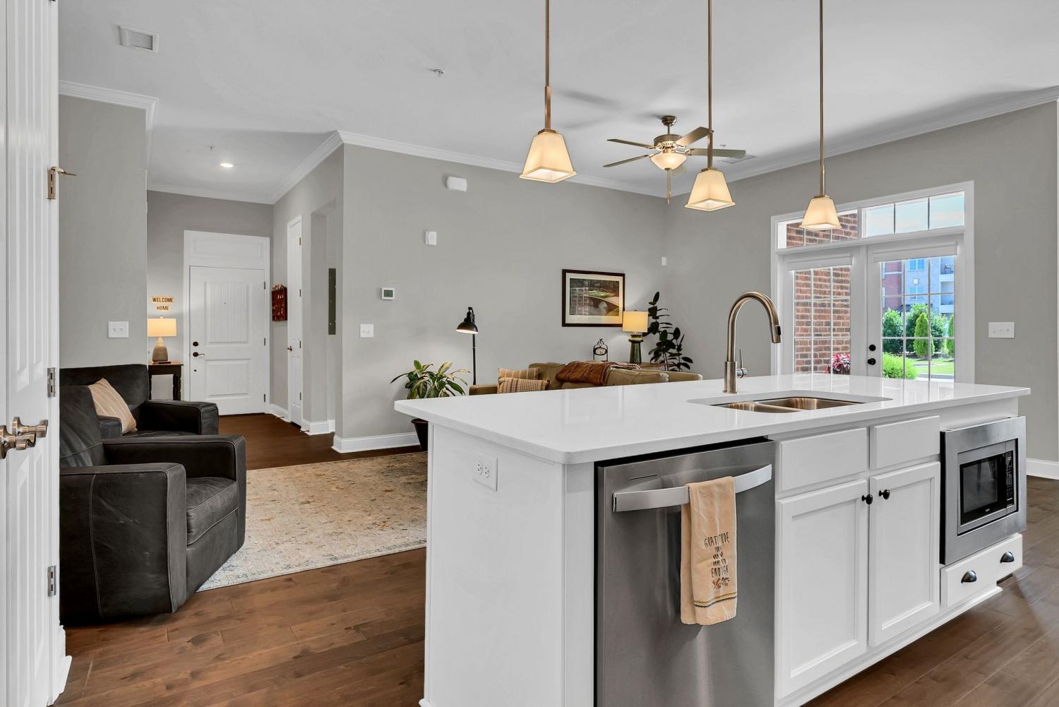 **Stylish First-Floor End Unit with Wraparound Porch** This stunning end-unit condo offers modern style, comfort, and convenience—all on the first floor. Soaring 9.5’ ceilings create an impressive, open feel as you step into the foyer and take in the seamless flow of the kitchen, dining, and great room, with enough space to include a home office area. The kitchen features 42” white cabinetry, quartz countertops, a white subway tile backsplash, and an undermount sink with pull-out faucet. The dining room is filled with natural light from two large windows, while dual glass doors with transoms add even more brightness. The **primary suite** continues the light and airy design, complete with a dual-sink vanity, soaking tub, separate shower, and a spacious walk-in California closet system with great storage! A second bedroom offers tall windows and its own large bath—perfect for guests. One of the home’s most important feature is direct property access, which is you can enter at the side door and patio without having to go thru the building . Speaking of the building there are 12 units and not a lot of traffic with parking spaces and the best feature is a garage. The garage includes additional storage racks for maximum organization. Loocated in a vibrant community designed for **living, working, and playing**, residents enjoy walking trails, peaceful lake views, and a lifestyle full of convenience. DON’T MISS THE HOA FEE INCLUDES WATER, SEWER, TRASH,GROUNDS AND EXTERIOR MAINTENANCE!!!!