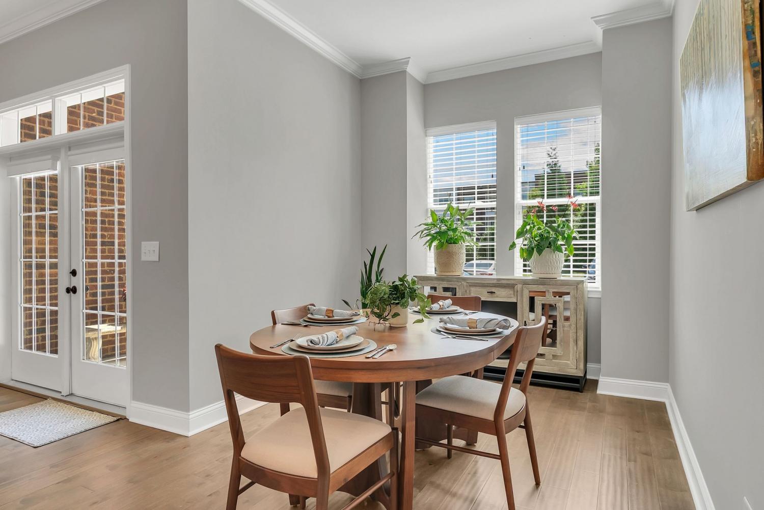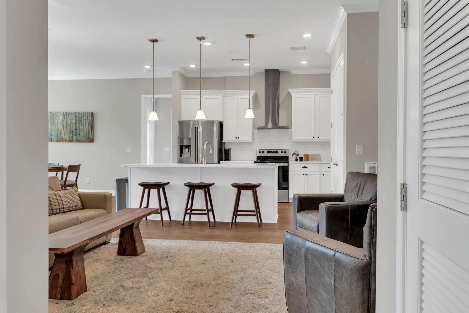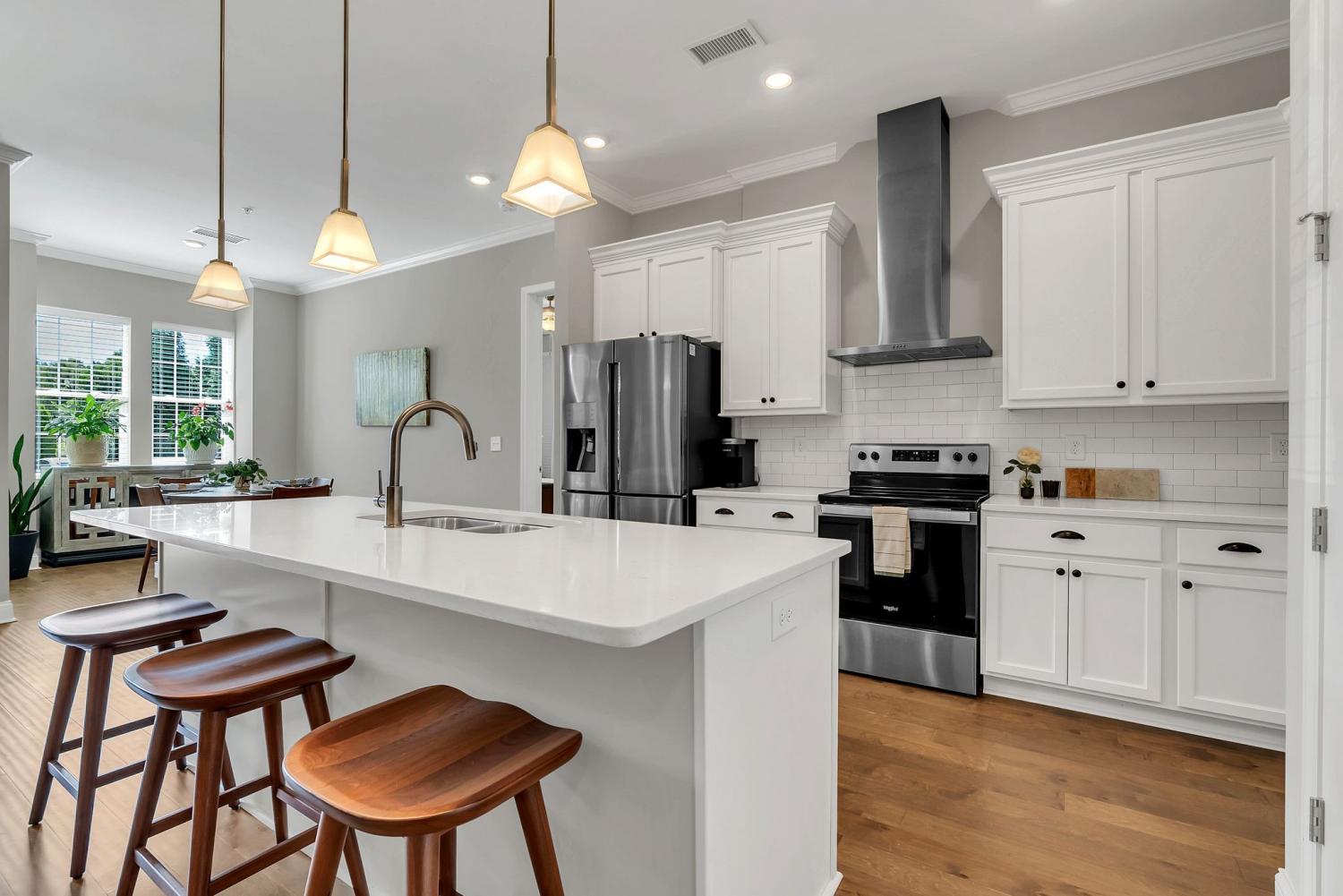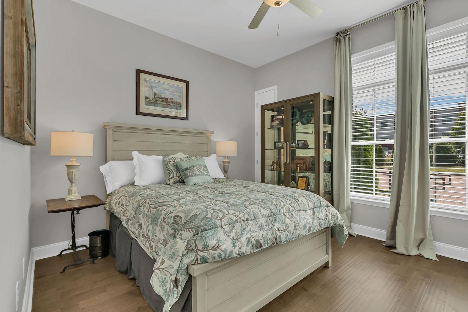 **Stylish First-Floor End Unit with Wraparound Porch** This stunning end-unit condo offers modern style, comfort, and convenience—all on the first floor. Soaring 9.5’ ceilings create an impressive, open feel as you step into the foyer and take in the seamless flow of the kitchen, dining, and great room, with enough space to include a home office area. The kitchen features 42” white cabinetry, quartz countertops, a white subway tile backsplash, and an undermount sink with pull-out faucet. The dining room is filled with natural light from two large windows, while dual glass doors with transoms add even more brightness. The **primary suite** continues the light and airy design, complete with a dual-sink vanity, soaking tub, separate shower, and a spacious walk-in California closet system with great storage! A second bedroom offers tall windows and its own large bath—perfect for guests. One of the home’s most important feature is direct property access, which is you can enter at the side door and patio without having to go thru the building . Speaking of the building there are 12 units and not a lot of traffic with parking spaces and the best feature is a garage. The garage includes additional storage racks for maximum organization. Loocated in a vibrant community designed for **living, working, and playing**, residents enjoy walking trails, peaceful lake views, and a lifestyle full of convenience. DON’T MISS THE HOA FEE INCLUDES WATER, SEWER, TRASH,GROUNDS AND EXTERIOR MAINTENANCE!!!!