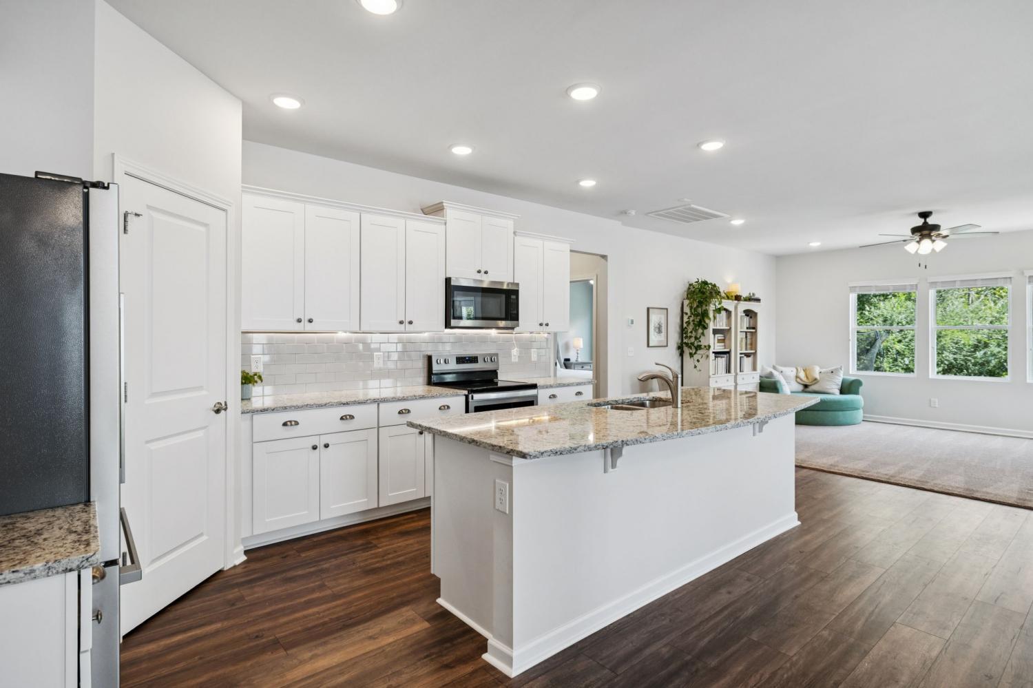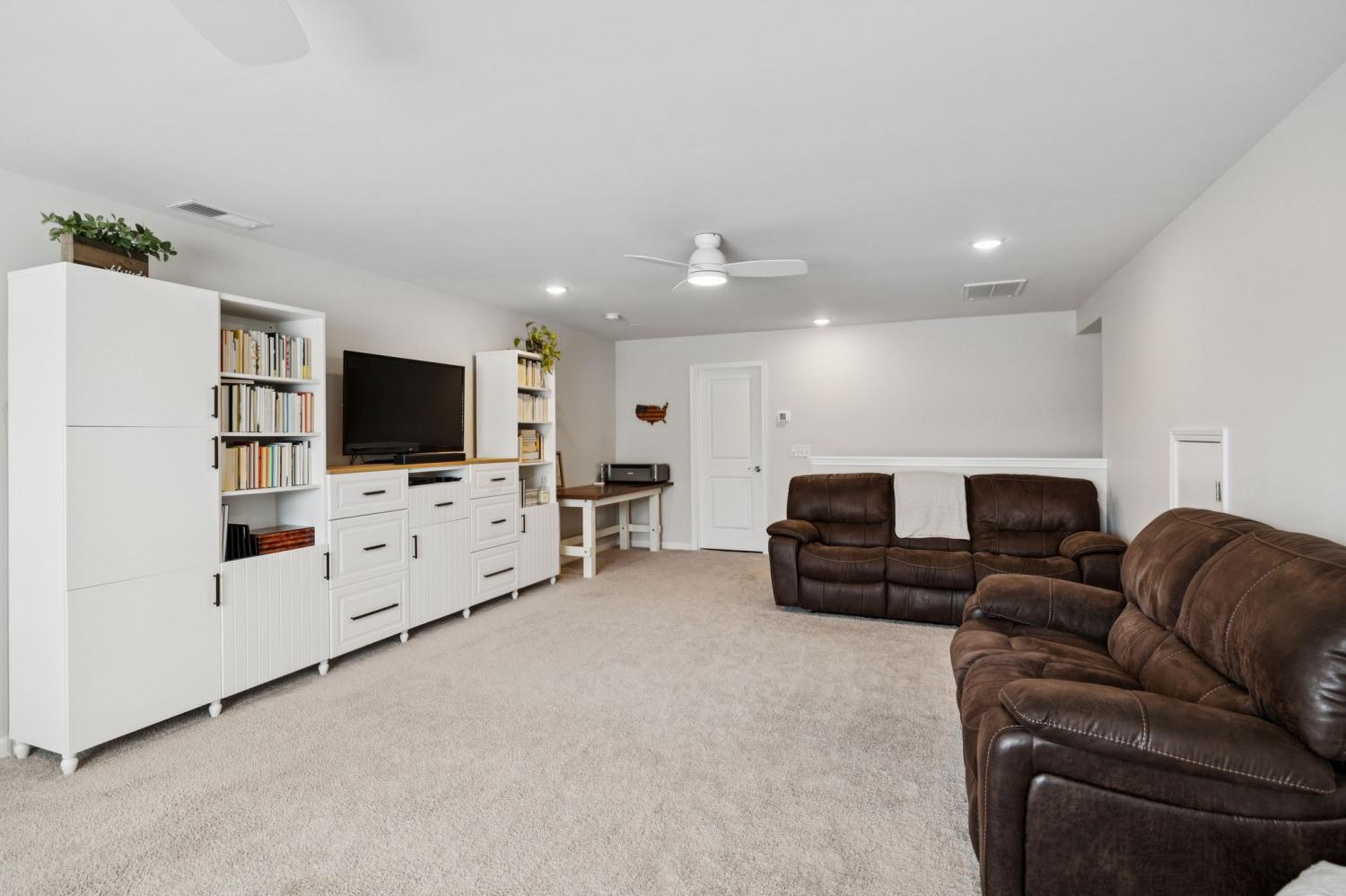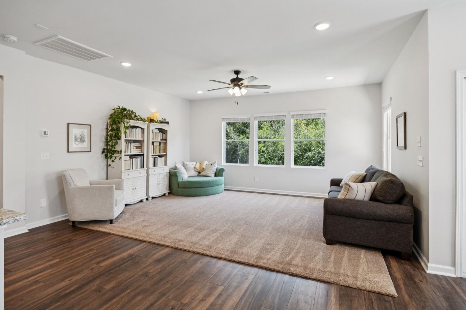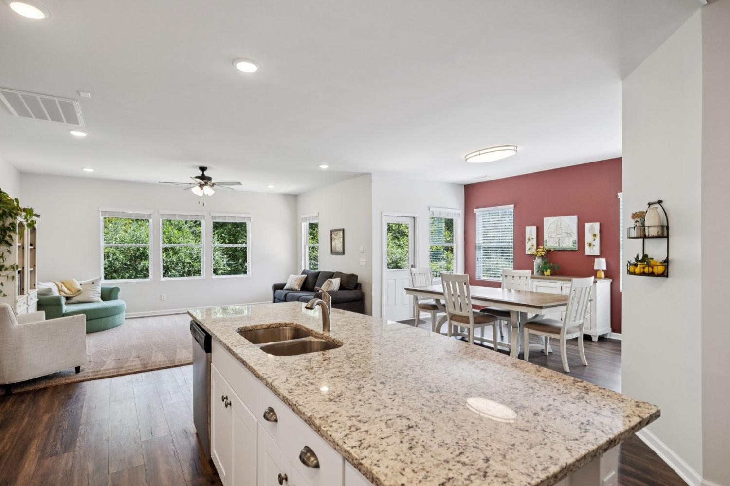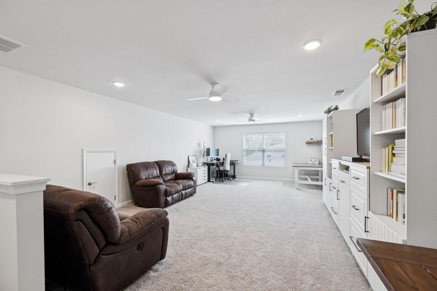 Beautiful, Open-Design home on a spacious, Fenced lot that backs to mature Trees! The main level features a private primary suite, a second bedroom, and a flexible room that could convert to a third bedroom. The generous kitchen shines with granite counters, crisp white cabinetry, and a sprawling island — perfect for cooking and entertaining. The dining area walks out to a covered back porch for easy indoor/outdoor living. The primary suite is a retreat with a trey ceiling, a roomy shower, and a walk-in closet, plus peaceful backyard views from the window. Upstairs finds an exceptionally large recreation room with a walk-in storage closet. This section of the neighborhood offers access to the neighborhood, beautiful pool, plenty of lounge space, and a firepit to enjoy sunsets. Very walkable neighborhood- parks, dog park, sidewalks and close to retail/restaurants!