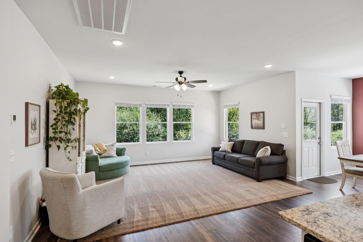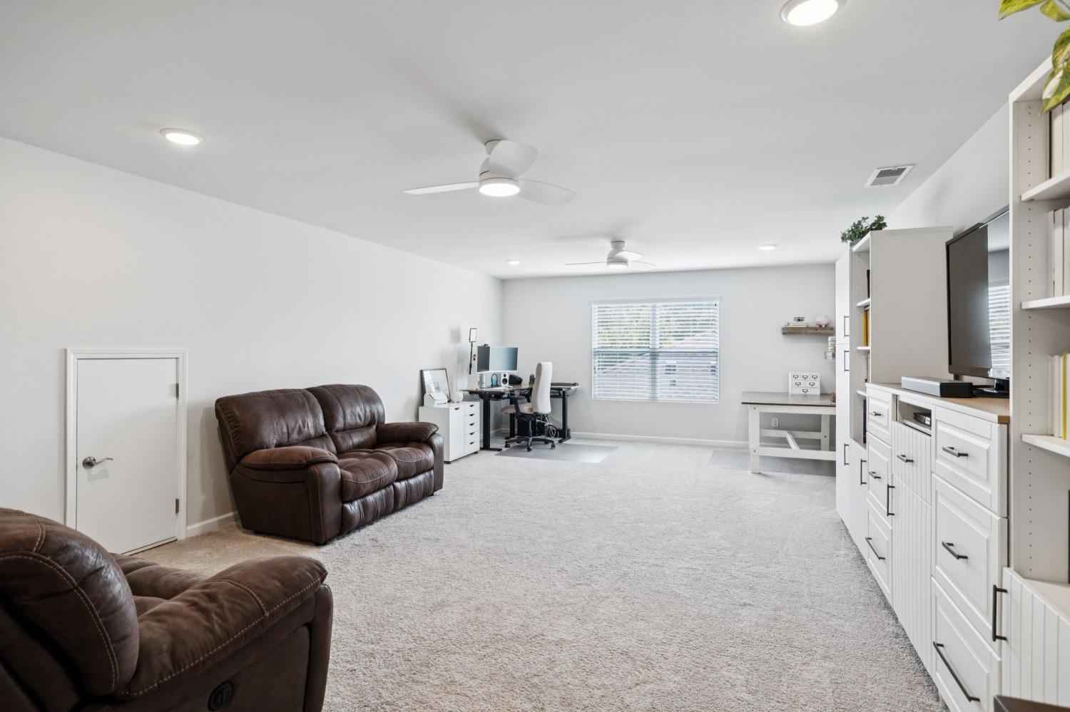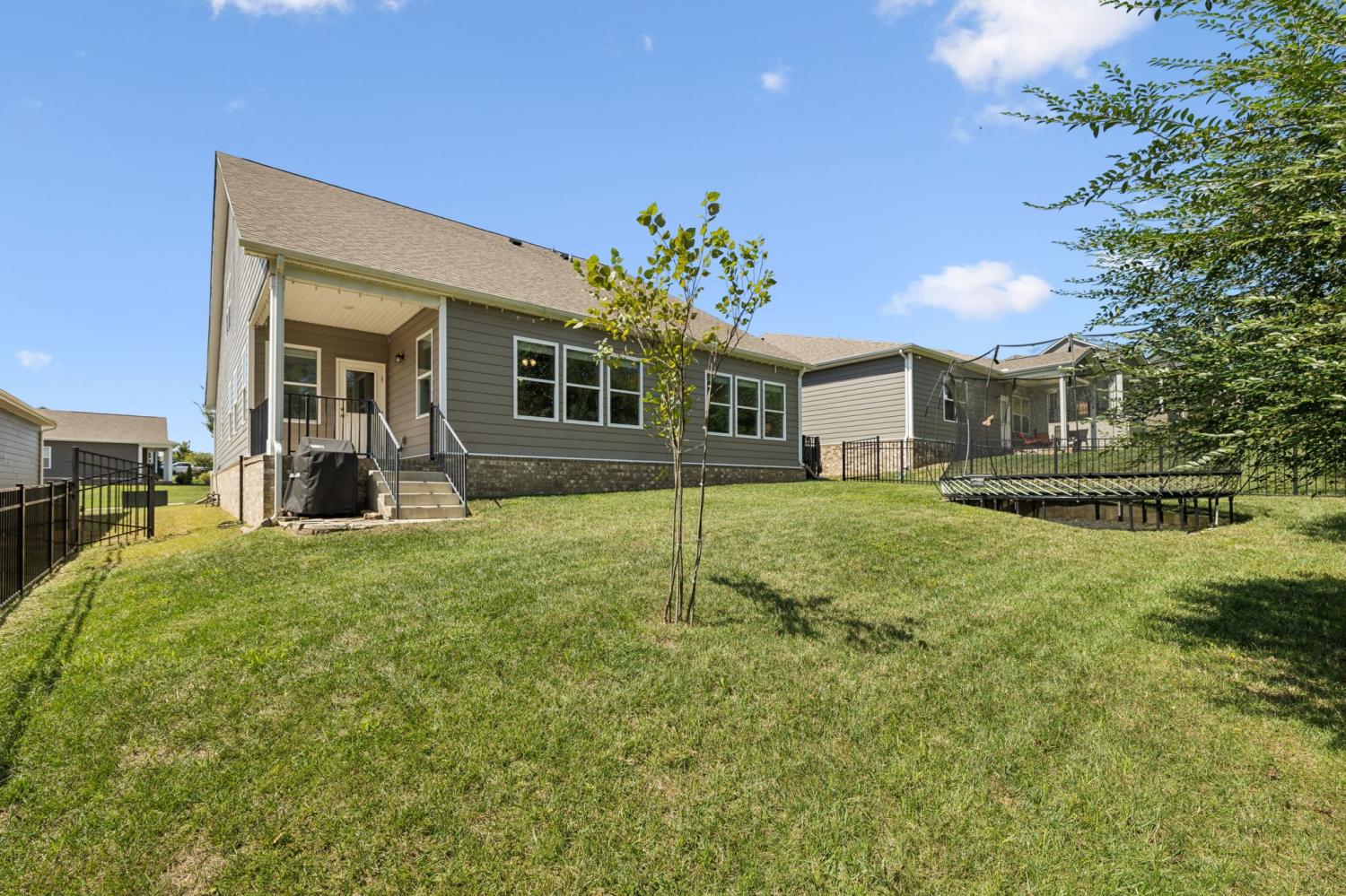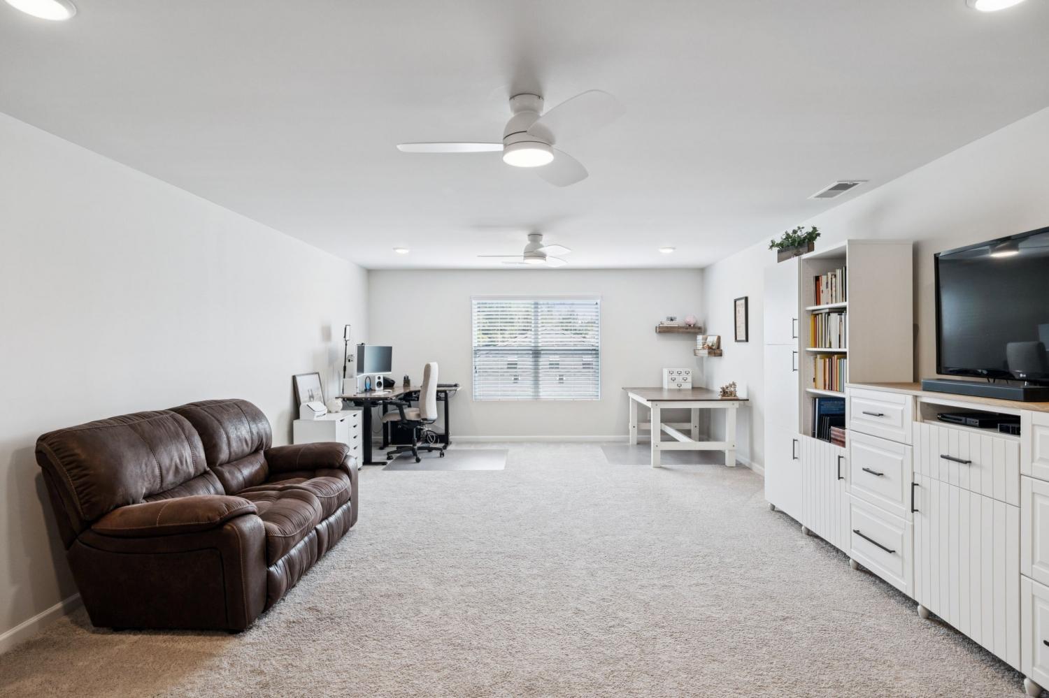 Beautiful, Open-Design home on a spacious, Fenced lot that backs to mature Trees! The main level features a private primary suite, a second bedroom, and a flexible room that could convert to a third bedroom. The generous kitchen shines with granite counters, crisp white cabinetry, and a sprawling island — perfect for cooking and entertaining. The dining area walks out to a covered back porch for easy indoor/outdoor living. The primary suite is a retreat with a trey ceiling, a roomy shower, and a walk-in closet, plus peaceful backyard views from the window. Upstairs finds an exceptionally large recreation room with a walk-in storage closet. This section of the neighborhood offers access to the neighborhood, beautiful pool, plenty of lounge space, and a firepit to enjoy sunsets. Very walkable neighborhood- parks, dog park, sidewalks and close to retail/restaurants!