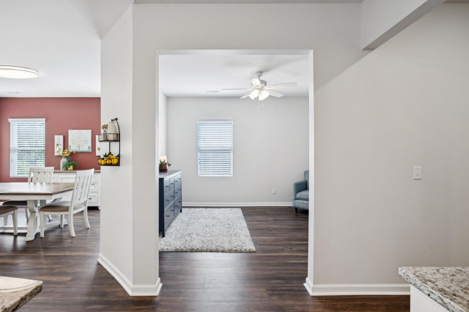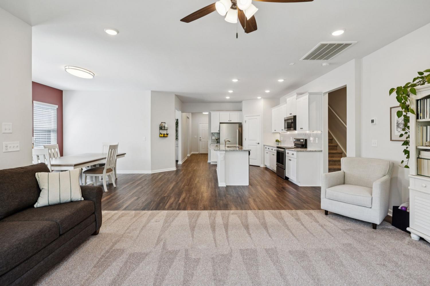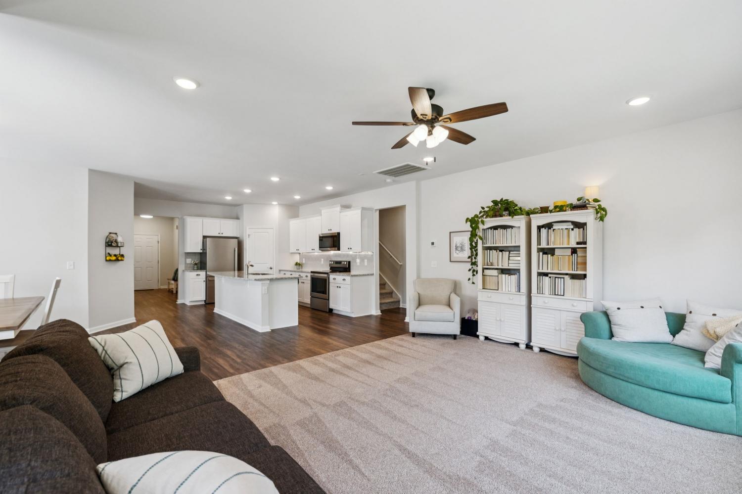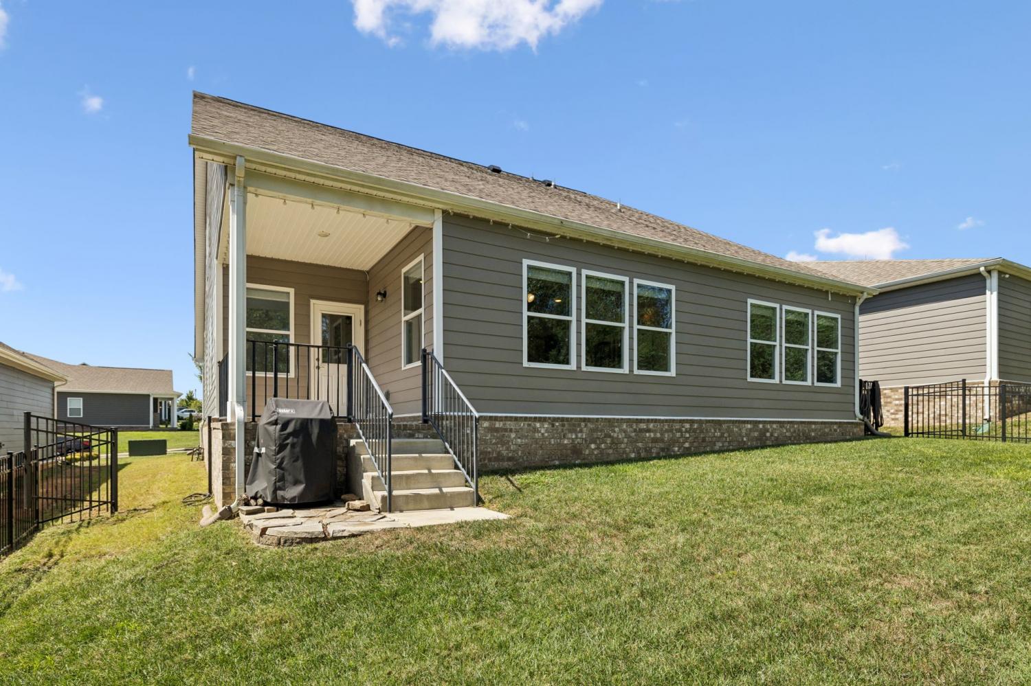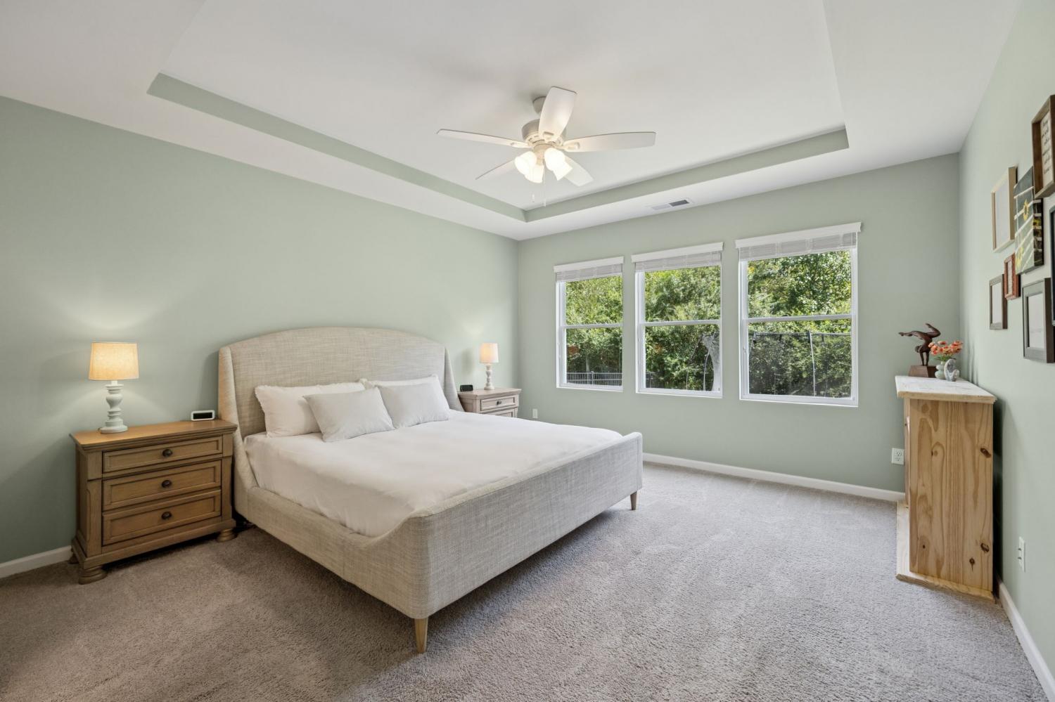 Beautiful, Open-Design home on a spacious, Fenced lot that backs to mature Trees! The main level features a private primary suite, a second bedroom, and a flexible room that could convert to a third bedroom. The generous kitchen shines with granite counters, crisp white cabinetry, and a sprawling island — perfect for cooking and entertaining. The dining area walks out to a covered back porch for easy indoor/outdoor living. The primary suite is a retreat with a trey ceiling, a roomy shower, and a walk-in closet, plus peaceful backyard views from the window. Upstairs finds an exceptionally large recreation room with a walk-in storage closet. This section of the neighborhood offers access to the neighborhood, beautiful pool, plenty of lounge space, and a firepit to enjoy sunsets. Very walkable neighborhood- parks, dog park, sidewalks and close to retail/restaurants!