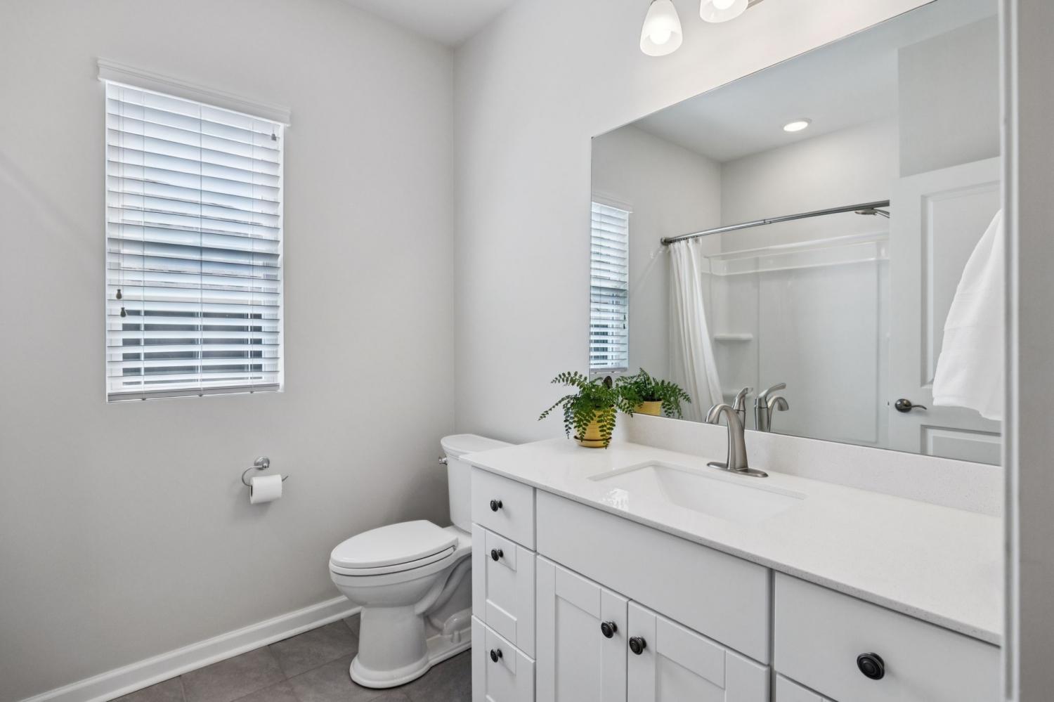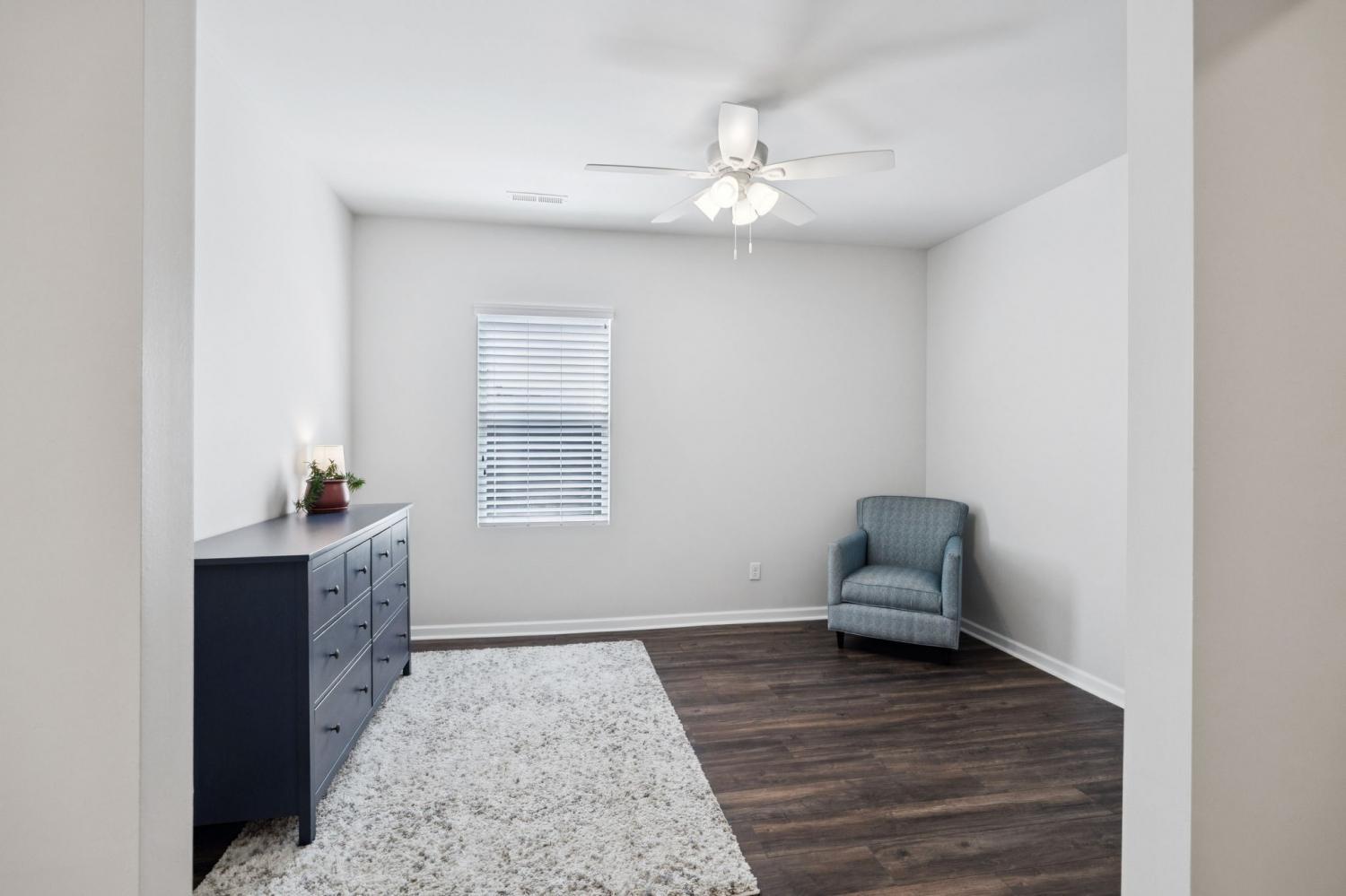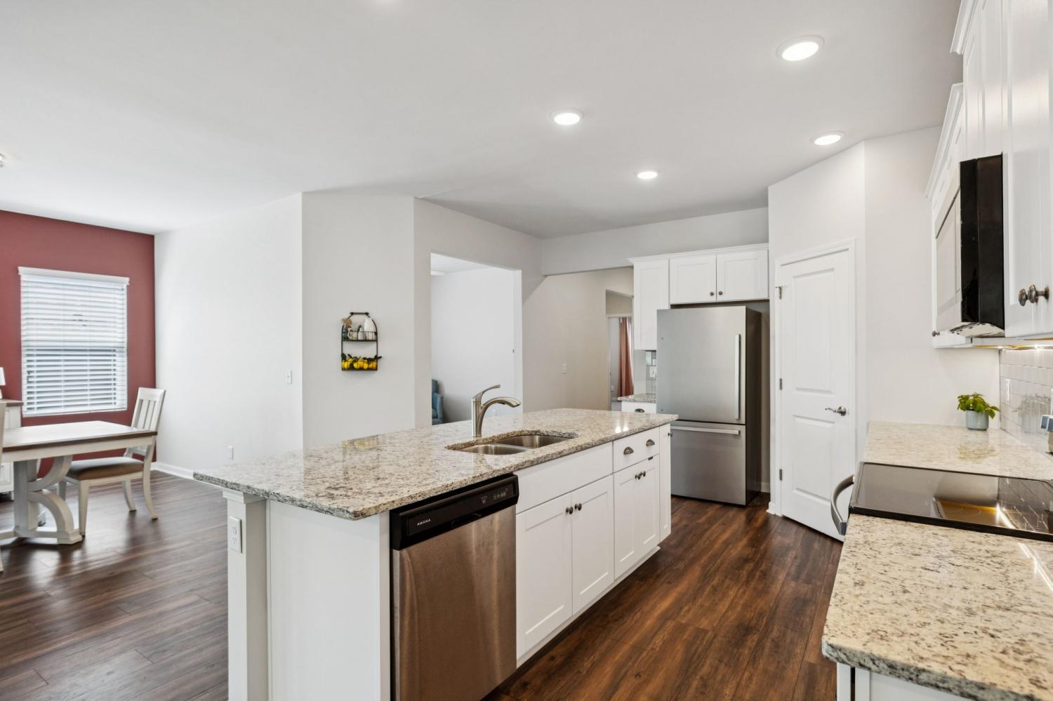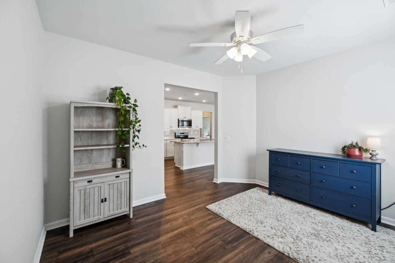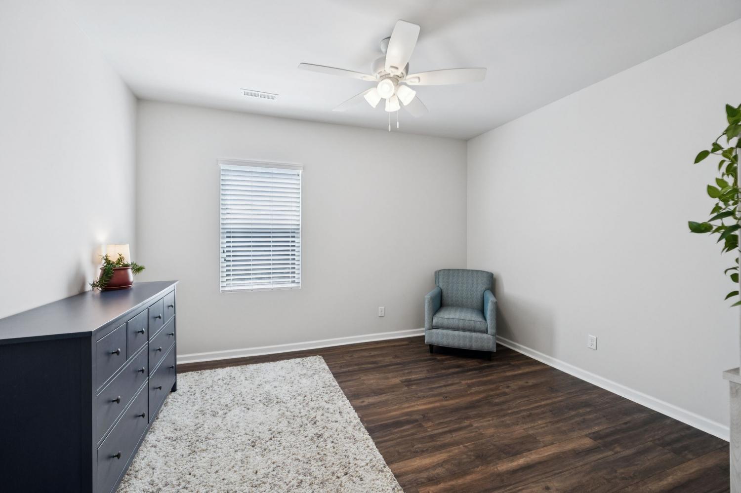 Beautiful, Open-Design home on a spacious, Fenced lot that backs to mature Trees! The main level features a private primary suite, a second bedroom, and a flexible room that could convert to a third bedroom. The generous kitchen shines with granite counters, crisp white cabinetry, and a sprawling island — perfect for cooking and entertaining. The dining area walks out to a covered back porch for easy indoor/outdoor living. The primary suite is a retreat with a trey ceiling, a roomy shower, and a walk-in closet, plus peaceful backyard views from the window. Upstairs finds an exceptionally large recreation room with a walk-in storage closet. This section of the neighborhood offers access to the neighborhood, beautiful pool, plenty of lounge space, and a firepit to enjoy sunsets. Very walkable neighborhood- parks, dog park, sidewalks and close to retail/restaurants!