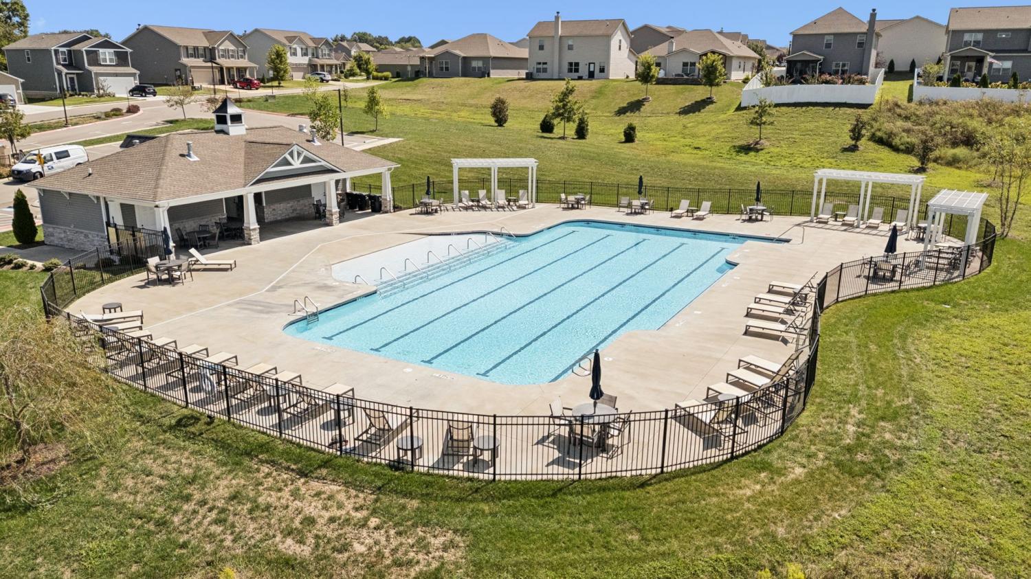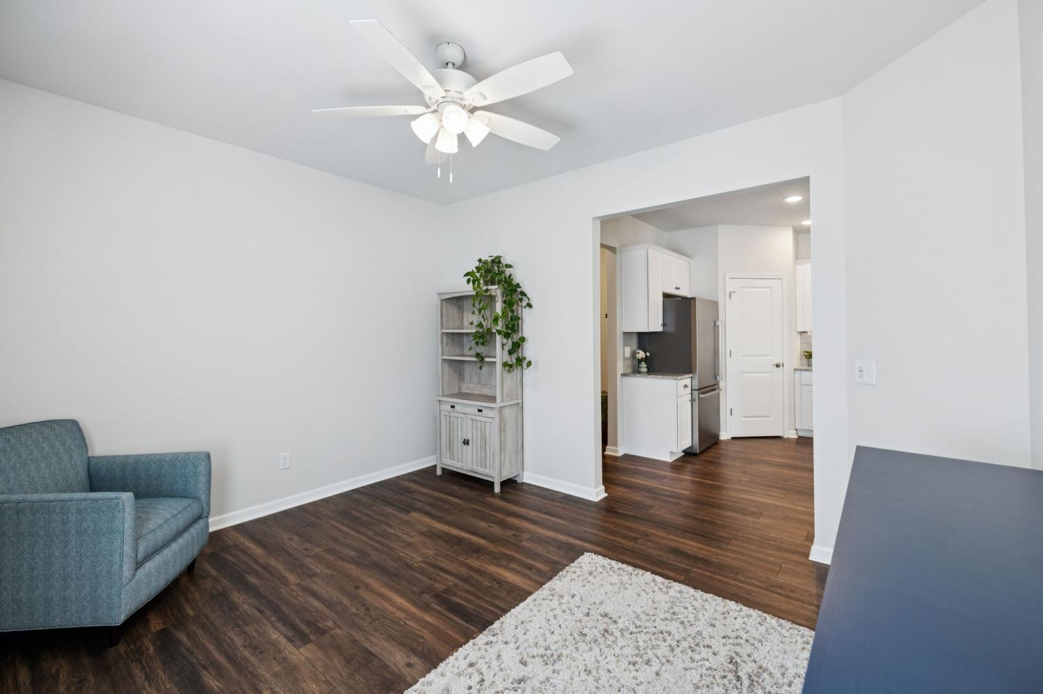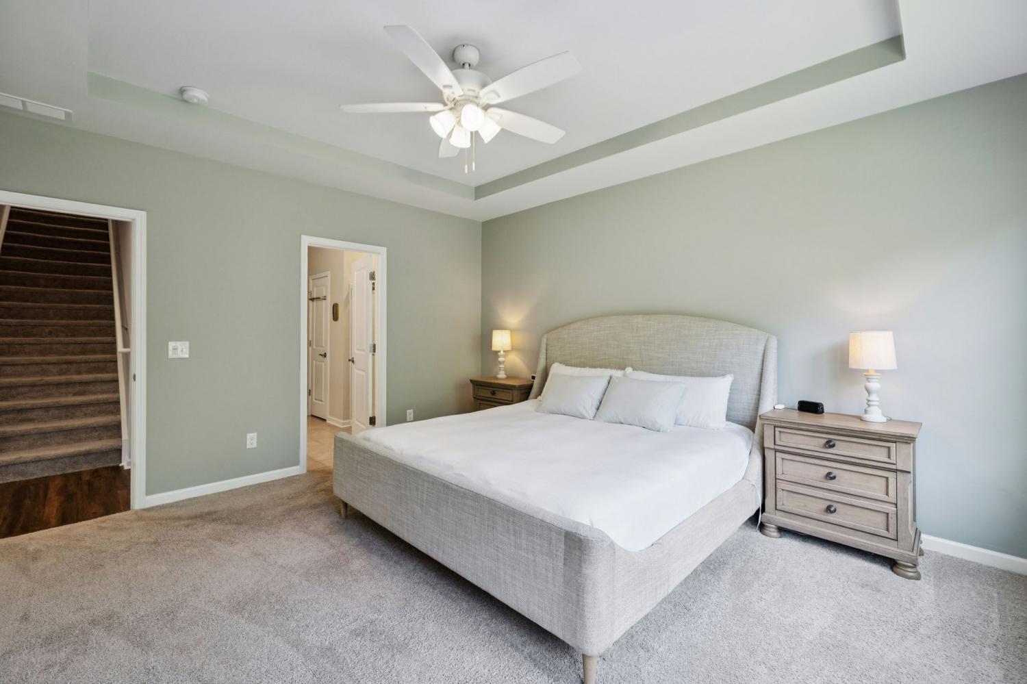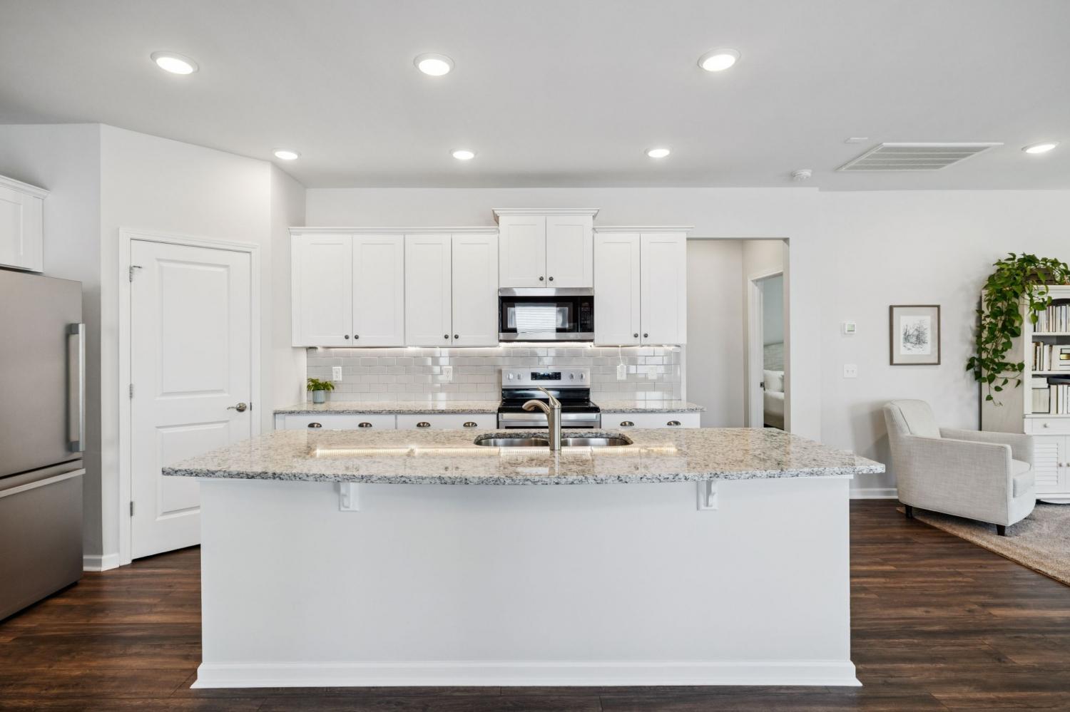 Beautiful, Open-Design home on a spacious, Fenced lot that backs to mature Trees! The main level features a private primary suite, a second bedroom, and a flexible room that could convert to a third bedroom. The generous kitchen shines with granite counters, crisp white cabinetry, and a sprawling island — perfect for cooking and entertaining. The dining area walks out to a covered back porch for easy indoor/outdoor living. The primary suite is a retreat with a trey ceiling, a roomy shower, and a walk-in closet, plus peaceful backyard views from the window. Upstairs finds an exceptionally large recreation room with a walk-in storage closet. This section of the neighborhood offers access to the neighborhood, beautiful pool, plenty of lounge space, and a firepit to enjoy sunsets. Very walkable neighborhood- parks, dog park, sidewalks and close to retail/restaurants!