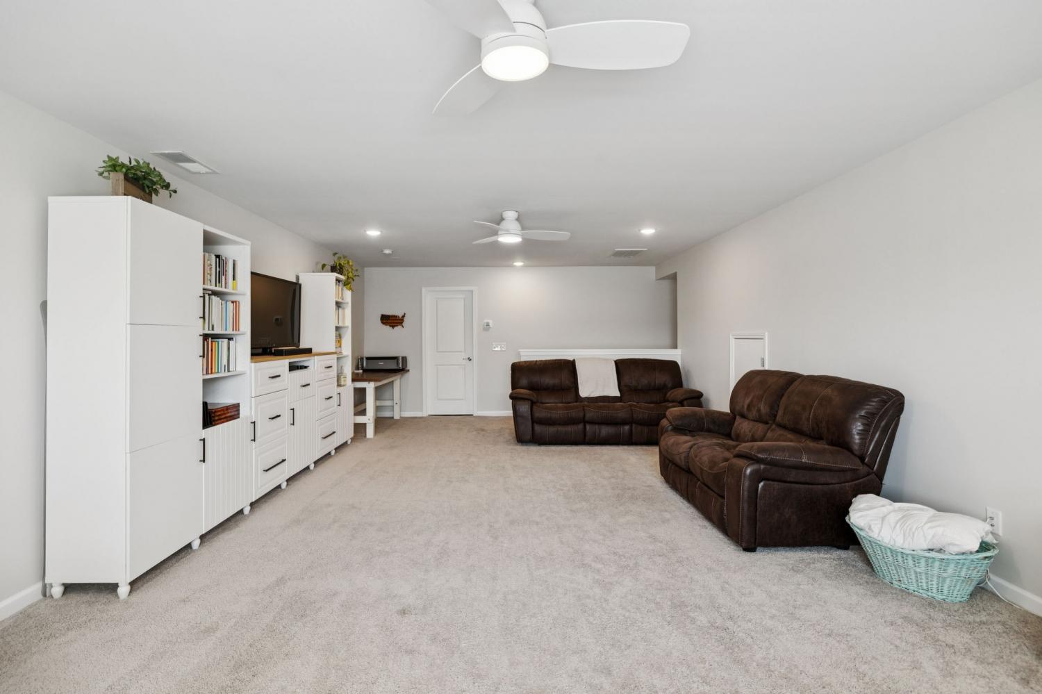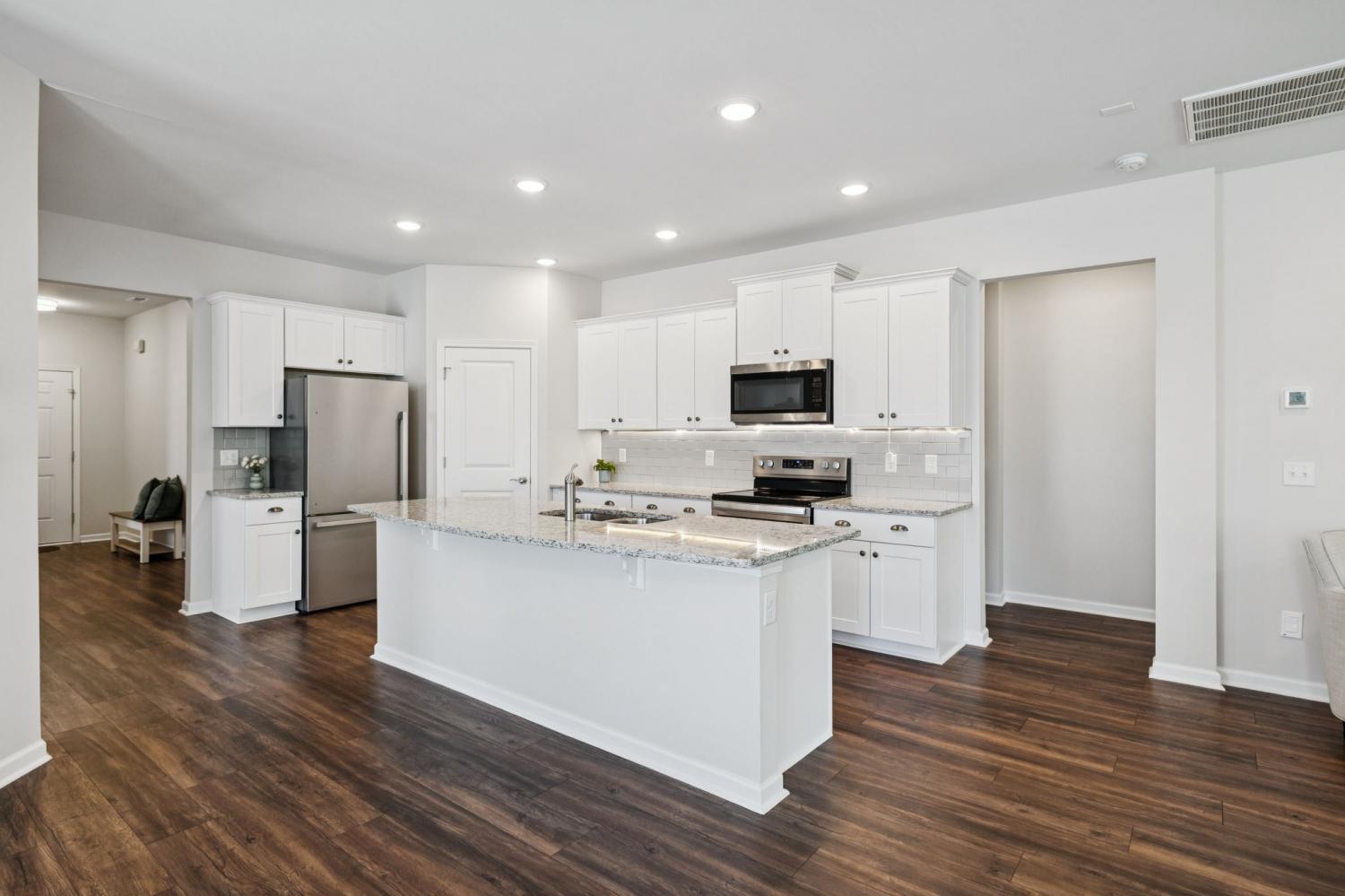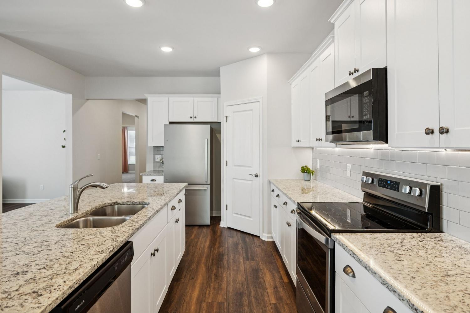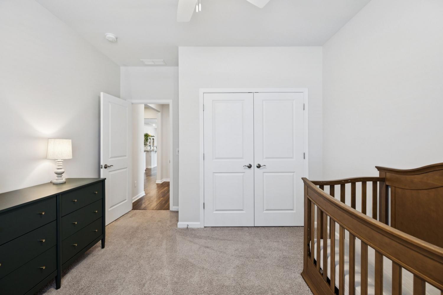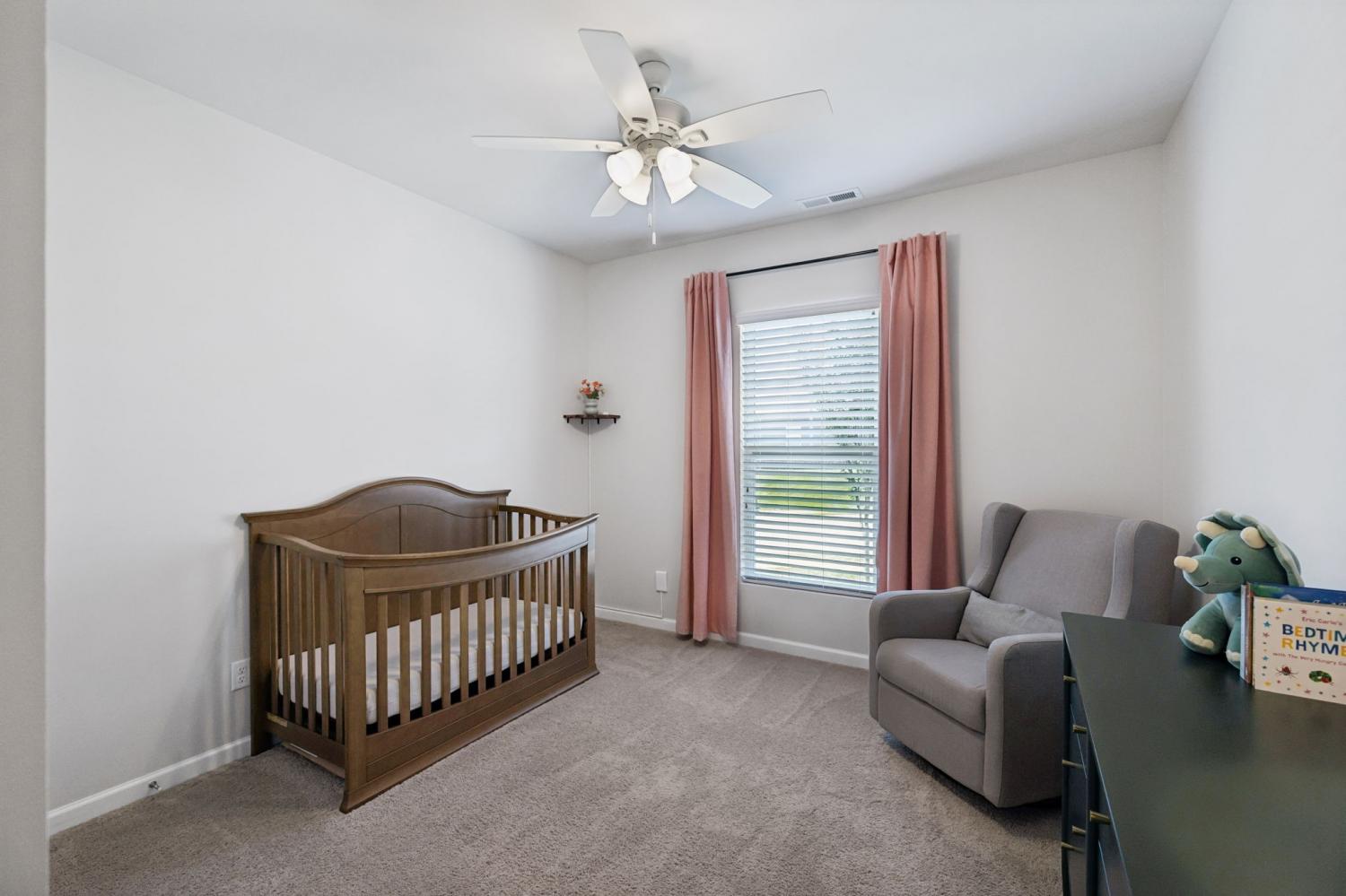 Beautiful, Open-Design home on a spacious, Fenced lot that backs to mature Trees! The main level features a private primary suite, a second bedroom, and a flexible room that could convert to a third bedroom. The generous kitchen shines with granite counters, crisp white cabinetry, and a sprawling island — perfect for cooking and entertaining. The dining area walks out to a covered back porch for easy indoor/outdoor living. The primary suite is a retreat with a trey ceiling, a roomy shower, and a walk-in closet, plus peaceful backyard views from the window. Upstairs finds an exceptionally large recreation room with a walk-in storage closet. This section of the neighborhood offers access to the neighborhood, beautiful pool, plenty of lounge space, and a firepit to enjoy sunsets. Very walkable neighborhood- parks, dog park, sidewalks and close to retail/restaurants!
