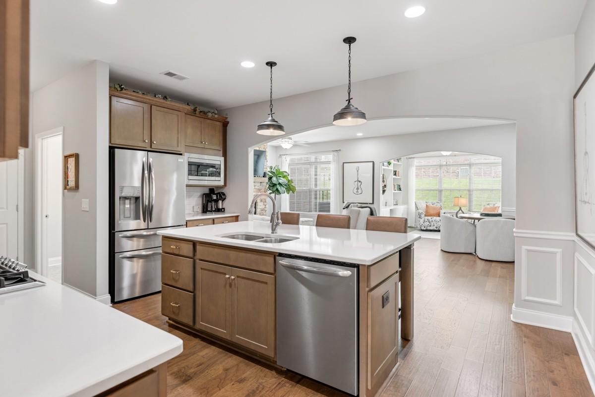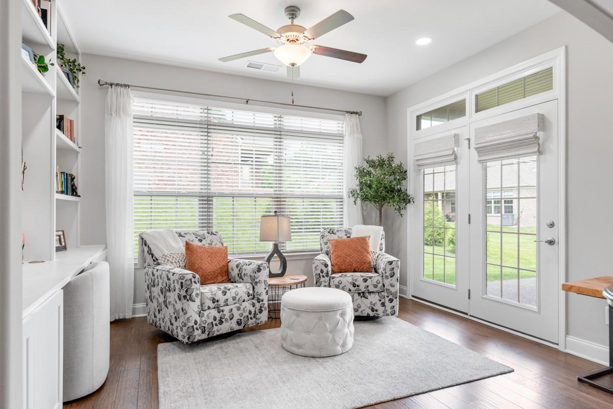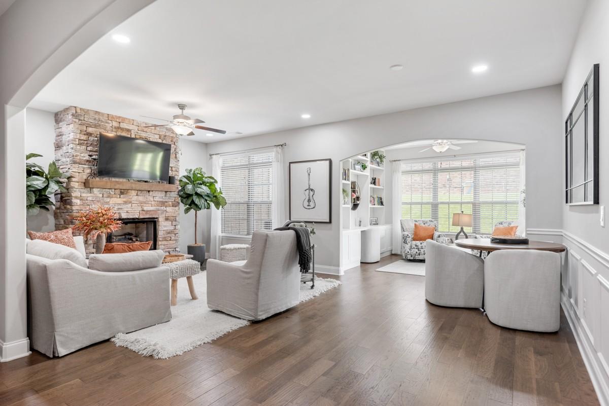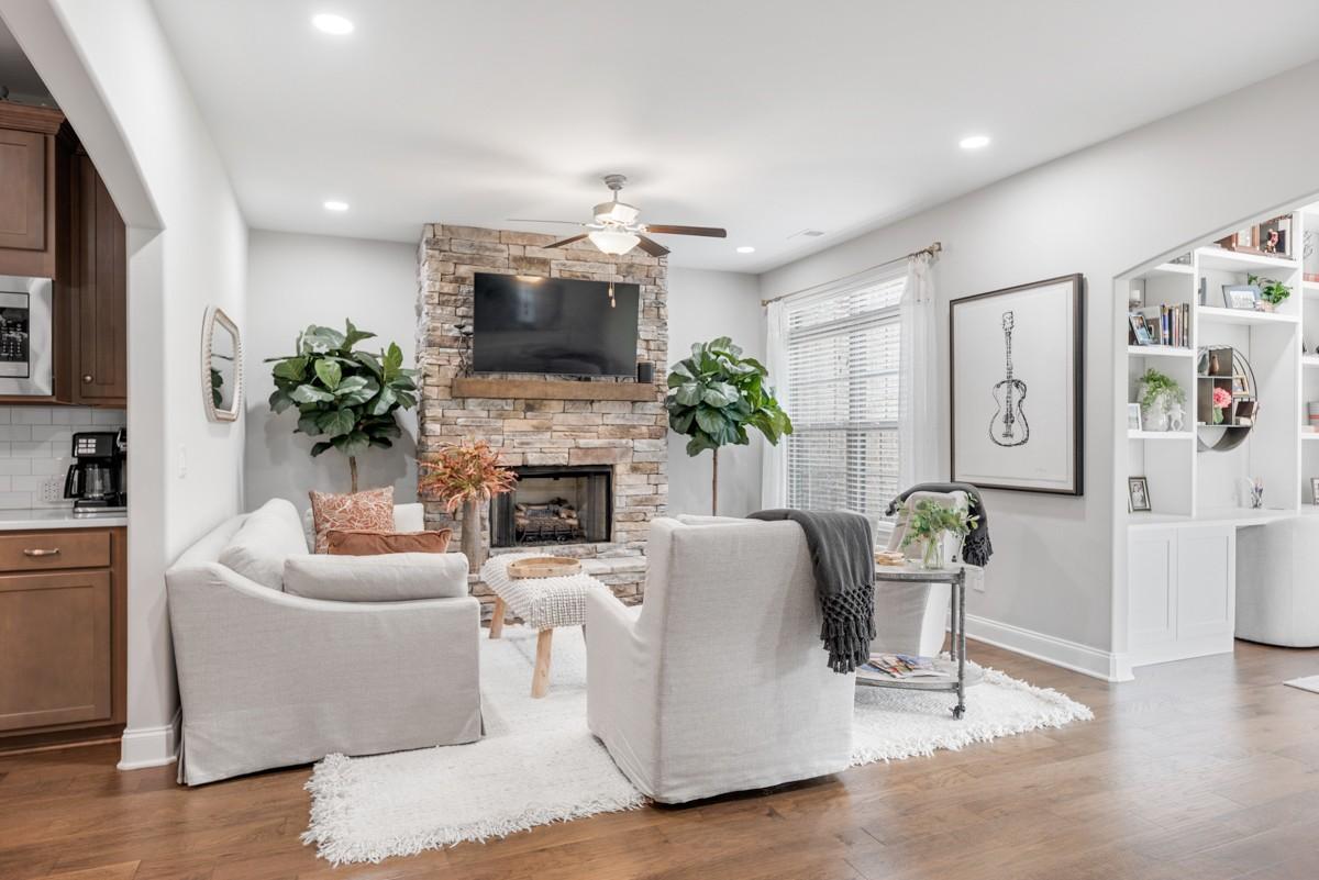 Beautiful end-unit Georgetown Villa located in Five Oaks Golf & Country Club. This well-maintained home features wainscoting, a stacked stone gas fireplace, rich cabinetry, quartz countertops, double ovens, stainless appliances, and under-cabinet lighting. The Florida room/sunroom offers a built-in desk and opens to a covered patio for outdoor enjoyment. Upstairs, the media room could serve as a 3rd bedroom and includes a 3rd full bath. Thoughtful upgrades and meticulous care throughout make this home truly move-in ready. Enjoy resort-style living with access to Five Oaks Golf & Country Club amenities, including golf, pool, tennis, and clubhouse.