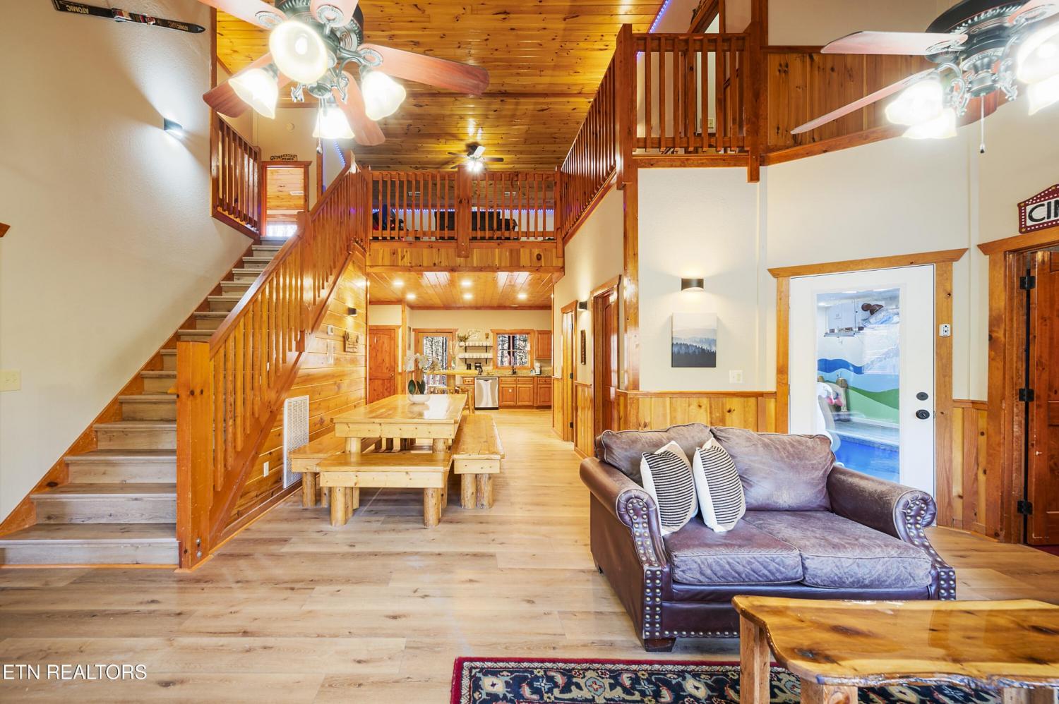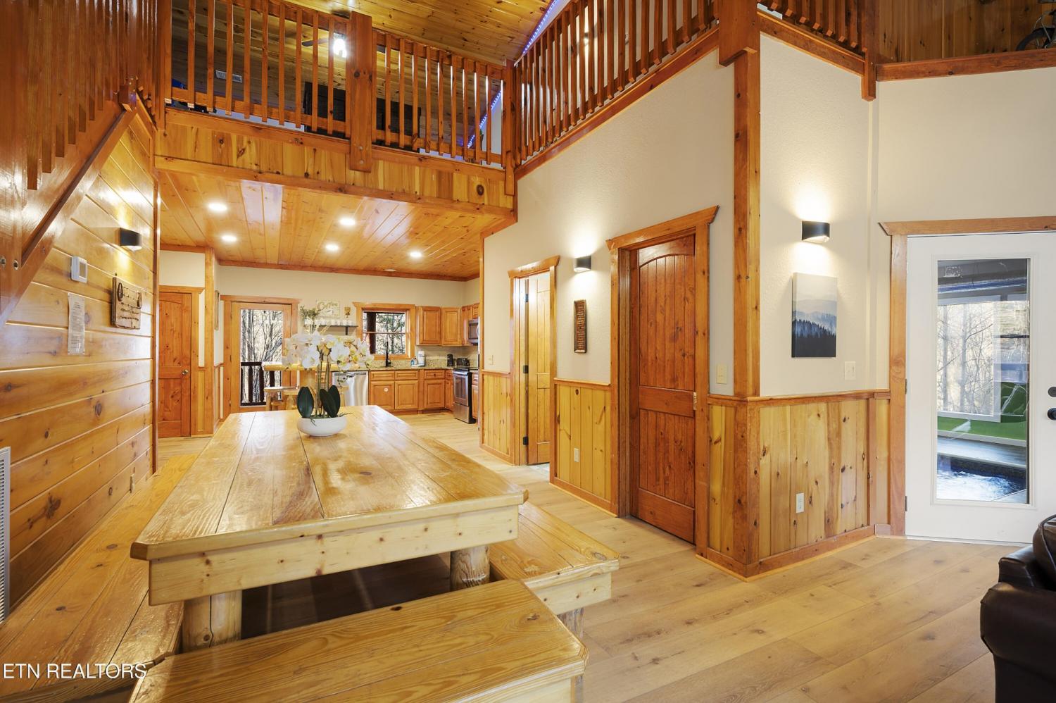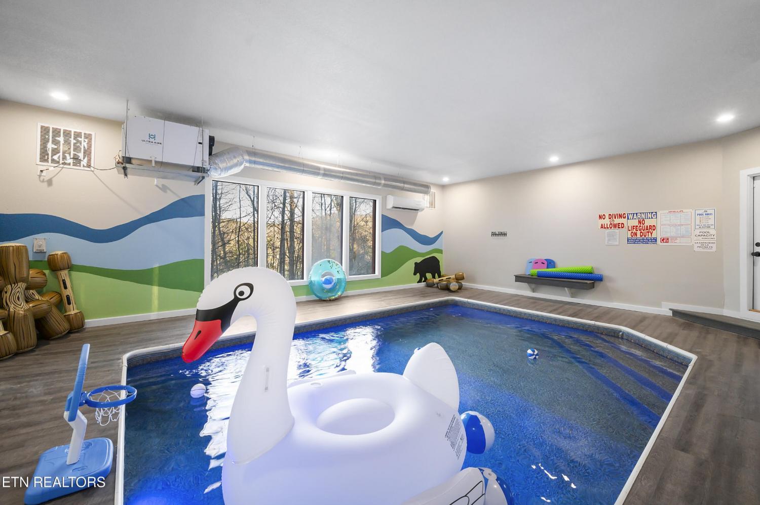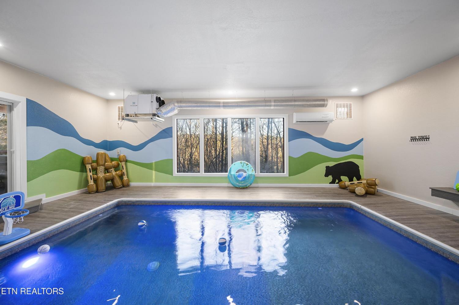 Welcome to your Smoky Mountain retreat in scenic Cosby, Tennessee—just minutes from the Great Smoky Mountains National Park! This impressive 4,400+ sq. ft. cabin has a proven rental history and comfortably sleeps up to 23 guests. With 5 bedrooms—including 5 primary oversized en-suite (all king beds) plus a bunkroom with its own bath—and a convenient half bath off the dining room, this property is designed for large gatherings and strong rental performance. Entertainment and relaxation are endless! The private heated indoor pool, recently remodeled with a new liner, new deck, and updated climate-controlled system (featuring a dehumidifier and mini-split unit), is maintained at 82° year-round. Guests will also love the brand-new hot tub, the updated theater room, and the loft arcade complete with pool table and games. Outdoors, the cabin offers a custom wood-burning fire pit perfect for evenings under the stars, two park-style charcoal grills, a wide front porch, and a spacious covered rear deck with plenty of room to gather. Each bedroom features a Smart TV and private bath for comfort and convenience. Set on a 1.07-acre lot with a level circular driveway and ample parking, this turnkey property has been freshly updated with new flooring, paint throughout, and a custom pool mural. Located just a short drive from Dollywood, Gatlinburg, and all the area's top attractions, this Smoky Mountain lodge is the perfect blend of investment opportunity and family getaway.