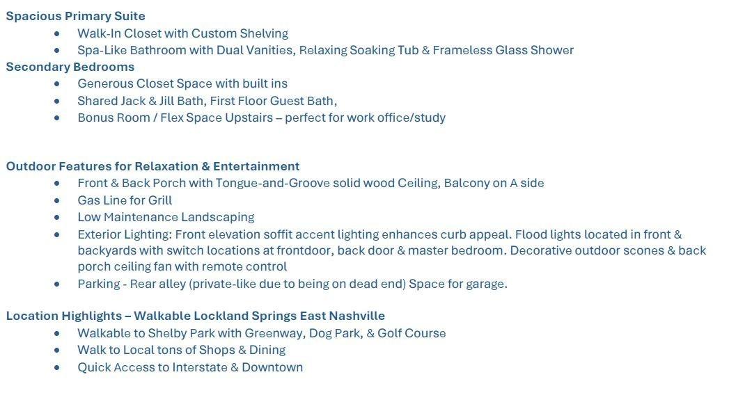 FORECLOSURE SALE OCTOBER 22nd 12 PM (NOON) at the Historic Nashville Metro Courthouse, 1 Public Square Nashville TN 37201 L O C A T I O N------WOW ! Lockland Springs - This premier location offers unbeatable walkability to neighborhood best dining & shops, miles of Greenway & close to downtown. With a striking presence and a sense of grandeur, this home exceeds expectations the moment you walk in. The 10-foot ceiling create an open feel, off the foyer, the spacious dining area opens into a designer-inspired kitchen - Gather in the heart of the home, featuring an oversized island, a dedicated wet bar, walk-in pantry, and abundant cabinetry for storage. Ideal for both everyday living and entertaining! The gas fireplace anchors the sun-filled living area, framed by large windows and French doors leading to a covered porch. Out back, you’ll find a permanent gas hookup for grilling and an intimate, low-maintenance yard—perfect for relaxing or extending your living space with a future deck, dipping pool or courtyard. Upstairs, a central loft offers flexible space for a second living area or home office. The primary suite includes oversized windows, a large walk-in closet, and a spa bath with soaking tub for 2, marble-tiled shower, and dual vanities. Bedrooms 2 and 3 share a generous Jack-and-Jill bath with double sinks. A spiral staircase leads to a fully customizable rooftop deck w/ gas heater hookup, dedicated electrical for a hot tub, and reinforced framing to support one.