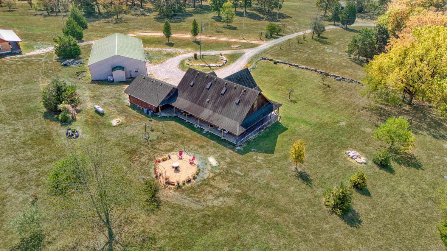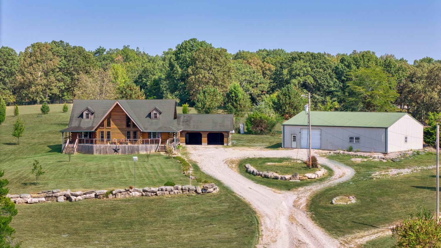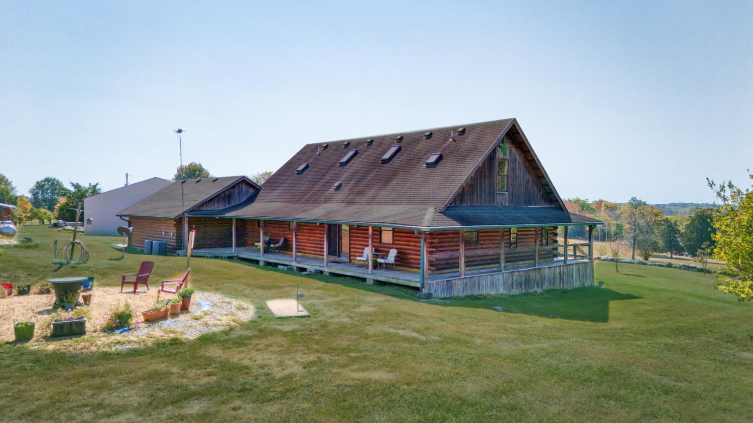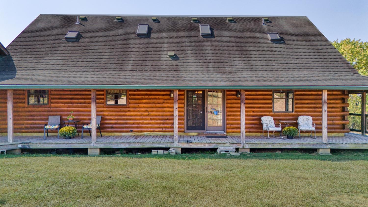 In the serene countryside of Russellville, KY and located in the Adairville school district, this stunning log home offers the perfect blend of rustic charm and modern comfort on 8.47 partially wooded acres. Crafted from hand-harvested Engleman Spruce logs sourced from the Rockies, this home boasts unmatched craftsmanship and attention to detail. A full wrap-around porch invites you to take in panoramic views that stretch all the way to the state line—on clear days, the scenery is breathtaking, and come July 4th, you’ll enjoy a front-row seat to fireworks lighting up the horizon in every direction. Inside, the home features four spacious bedrooms—two on the main floor and two upstairs—with ensuite bathrooms in both the primary and upper-level bedrooms. An additional full bathroom on the main level offers convenience for guests and easy access to the nearby laundry room, which includes a built-in ironing board. The home is equipped with two HVAC units, four skylights, and generous walk-in closets throughout. The kitchen is a chef’s delight with custom hickory cabinetry, all lower cabinets featuring pullout shelves, and a spacious pantry closet. Aspen wood ceilings and walls throughout the main floor pair beautifully with clear-coated red oak flooring. The centerpiece of the living area is a beautiful gas fireplace, featuring sandstone from local Costello Stone and finished with decorative rock. It's fully automatic and includes two emergency shut-off valves for safety. In the master suite, you'll find maple flooring and cabinetry, as well as additional aspen woodwork. The master bath includes his-and-hers walk-in closets and a luxurious Jacuzzi tub with an auxiliary heater to maintain a consistent water temperature. An oversized two-car garage offers plenty of room for vehicles and storage, while a massive 60x40 detached garage/workshop with a concrete floor is ready for your projects—already plumbed for a bathroom and wired for electricity. There’s also a fenced dog